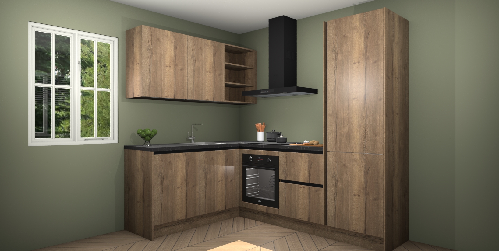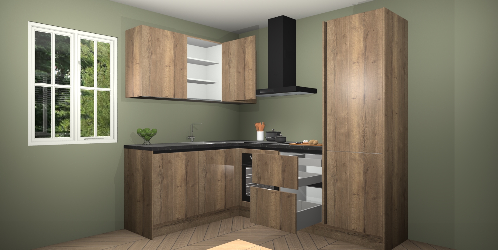 Maak kennis met de Chocolade Eiken greeploze keuken Boekarest, een moderne hoekkeuken waar al uw vrienden en familie jaloers op zullen zijn! Het verbluffende mooie ontwerp past in elk interieur en is een ideale keuze voor wie op zoek is naar een klassieke, maar verfijnde look.