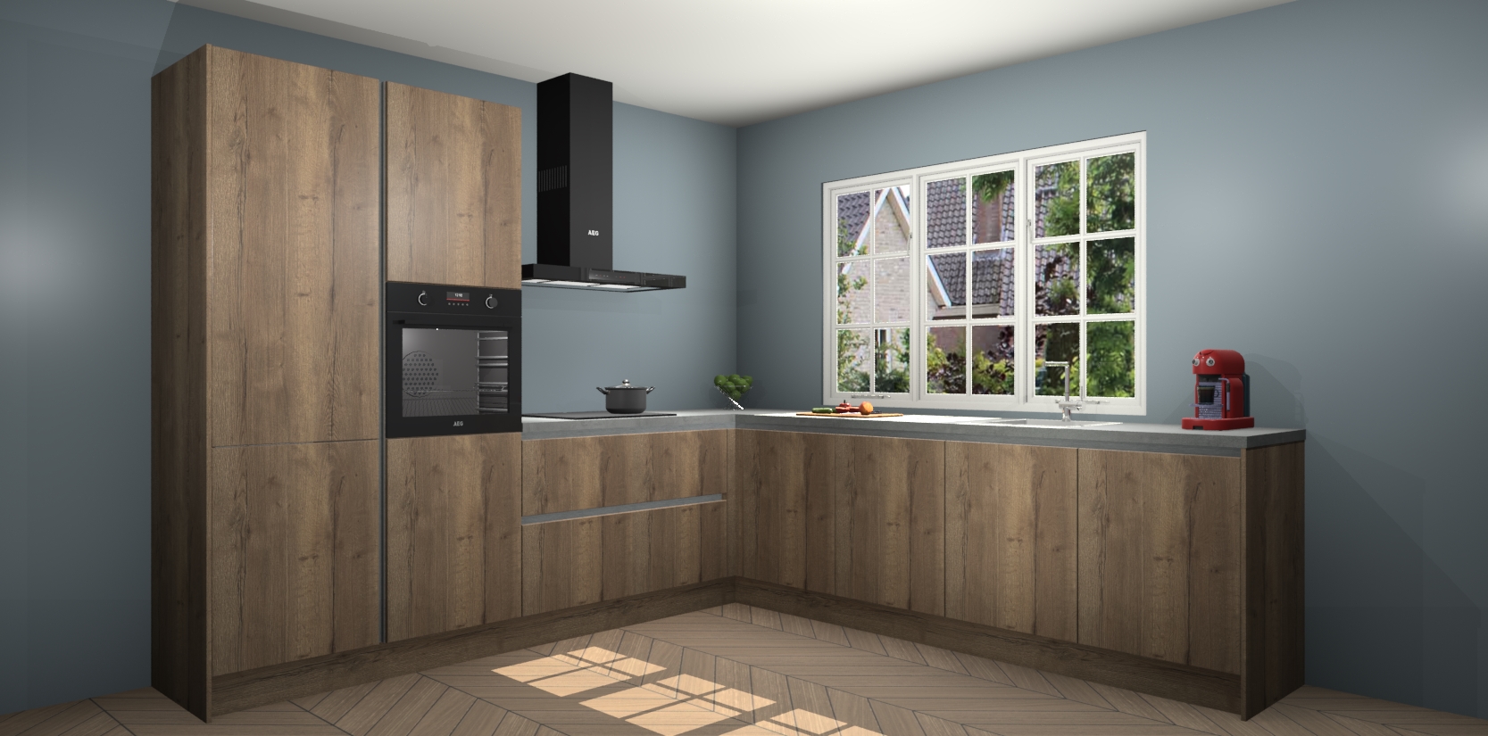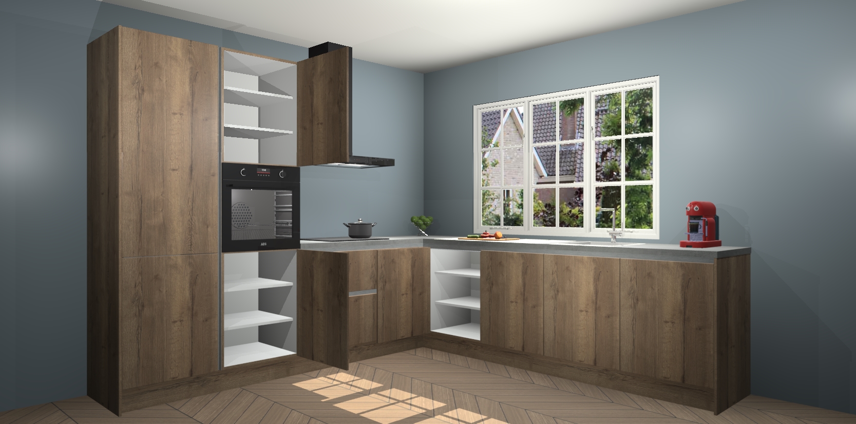 De keuken heeft veel opbergruimte, waardoor u alle ingrediënten gemakkelijk bereikbaar hebt staan. En daarnaast bevat deze volledig uitgeruste keuken ook 5 ingebouwde apparaten: een oven, inductiekookplaat, afzuigkap, vaatwasser en koelkast. Deze zijn heel eenvoudig na bestellen te upgraden naar AEG als u dit wilt. Bovendien zijn de softclose-kastdeuren ideaal; geef ze gewoon even een tikje en ze sluiten automatisch met geruisloze precisie.