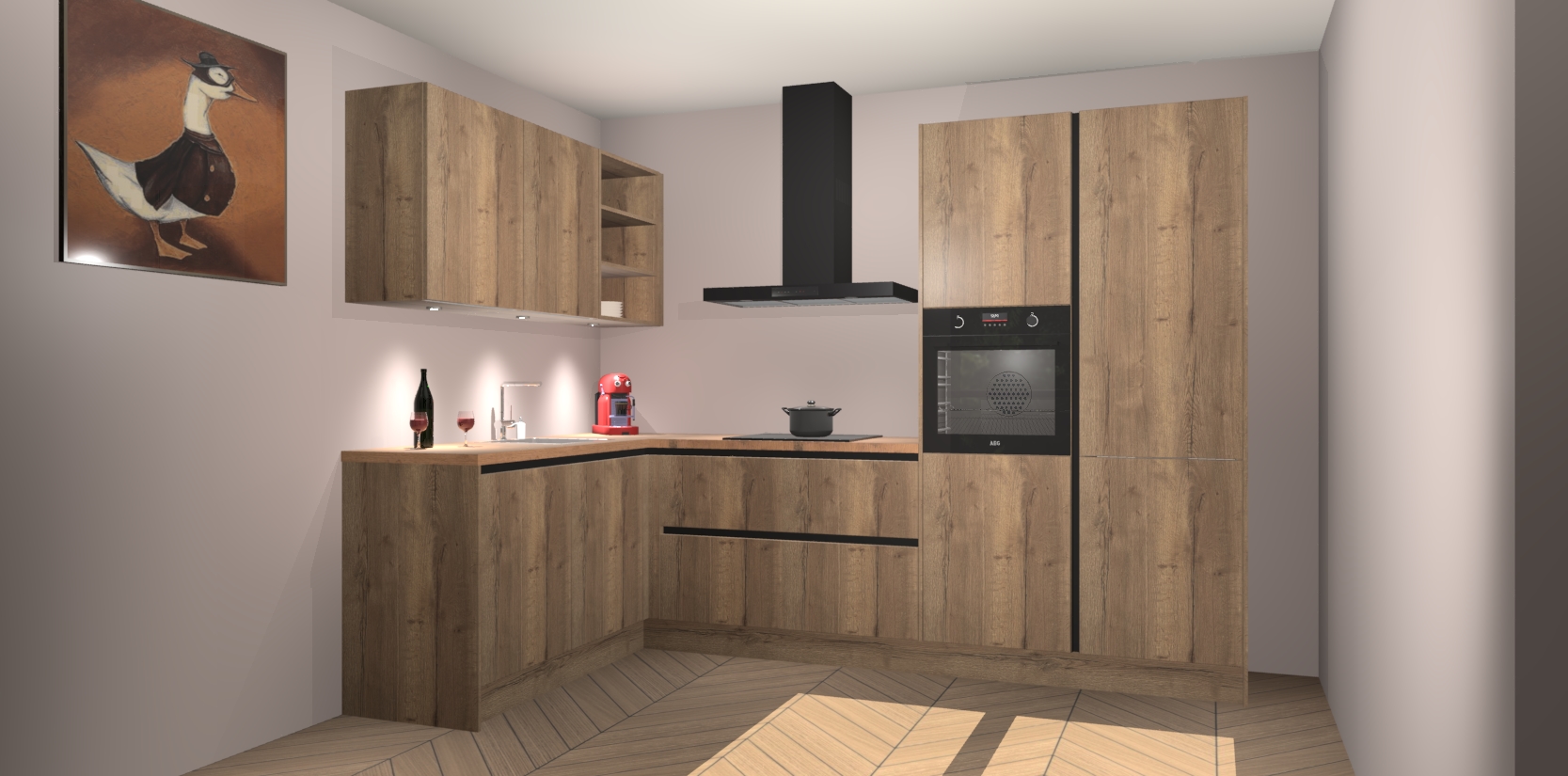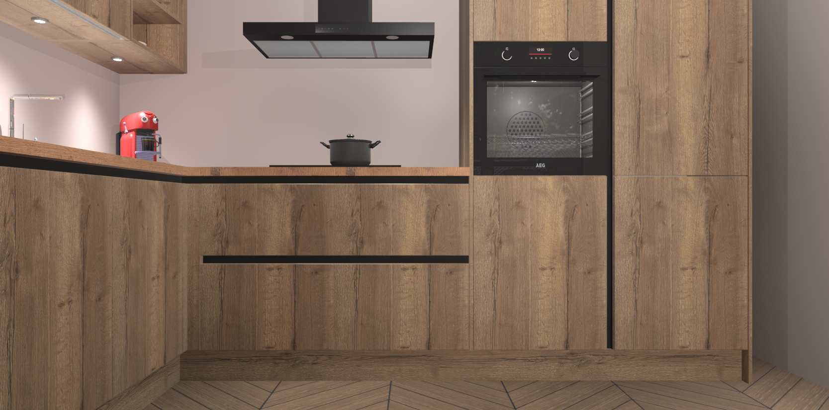 De Chocolade Eiken greeploze keuken Cognac is een adembenemend ontwerp met een modern en tijdloos uiterlijk. Deze luxe keuken straalt echt aristocratisch uit, waardoor uw koken plezieriger zal worden! Het prachtige design begint bij de hoekkeuken, wat perfect past bij elk type interieur. Bovendien bevat deze hoogwaardige set vijf inbouwapparaten - van oven tot koelkast - die via bestelling naar AEG geüpgraded kunnen worden!