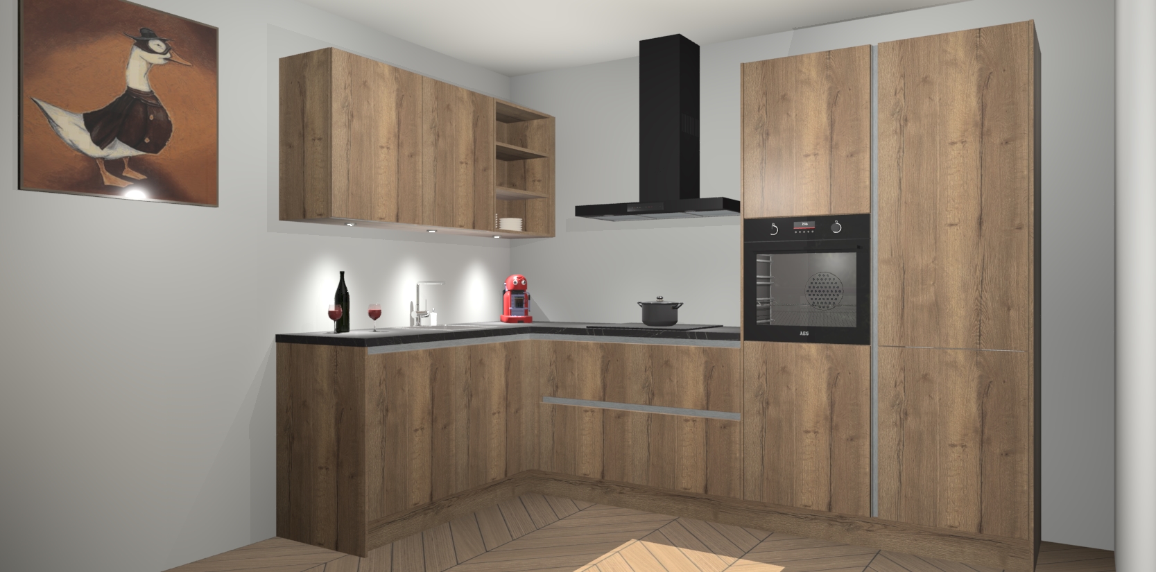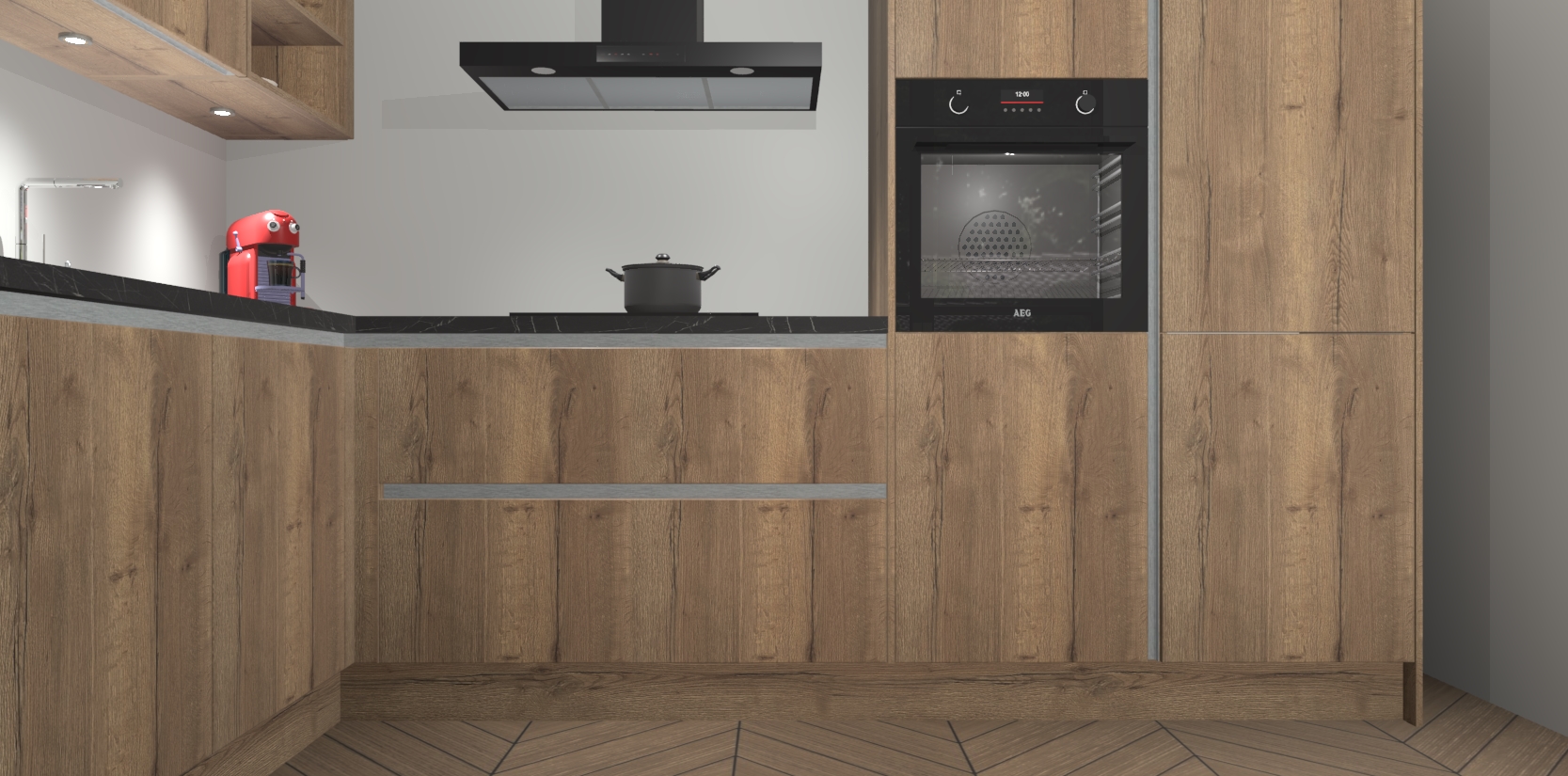 De Chocolade Eiken greeploze keuken Cognac is een adembenemend ontwerp met een modern en tijdloos uiterlijk. Deze luxe keuken straalt echt aristocratisch uit, waardoor uw koken plezieriger zal worden! Het prachtige design begint bij de hoekkeuken, wat perfect past bij elk type interieur. Bovendien bevat deze hoogwaardige set vijf inbouwapparaten - van oven tot koelkast - die via bestelling naar AEG geüpgraded kunnen worden!