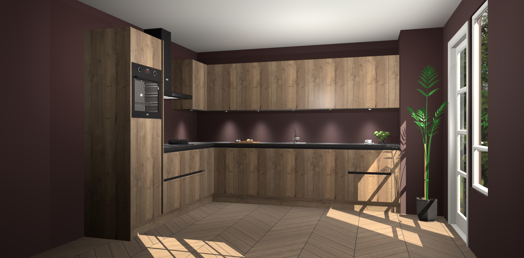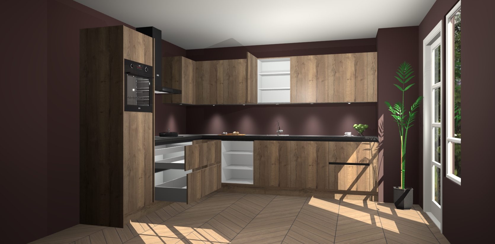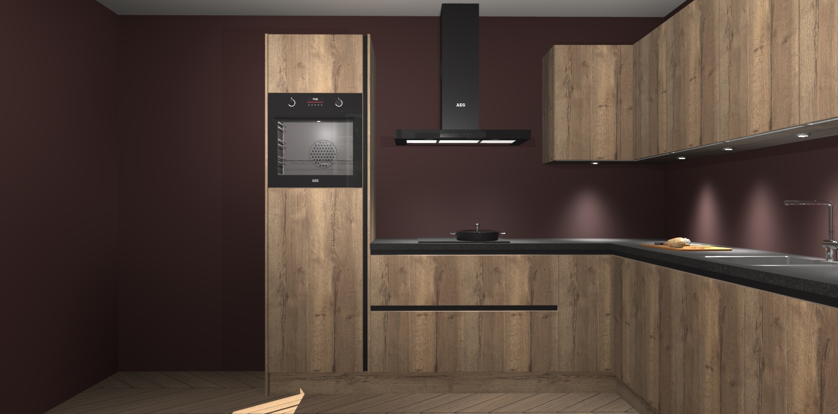 De Chocolade Eiken greeploze keuken Debar is uitgerust met vijf inbouwapparaten die elke kooktaak handig en efficiënt maken. Een oven, inductiekookplaat, afzuigkap, vaatwasser en koelkast zijn standaard, maar kunnen na bestelling eenvoudig worden geupgrade naar AEG. Profiteer vervolgens van de softclose deuren voor snelle toegang en geruisloze toegang.