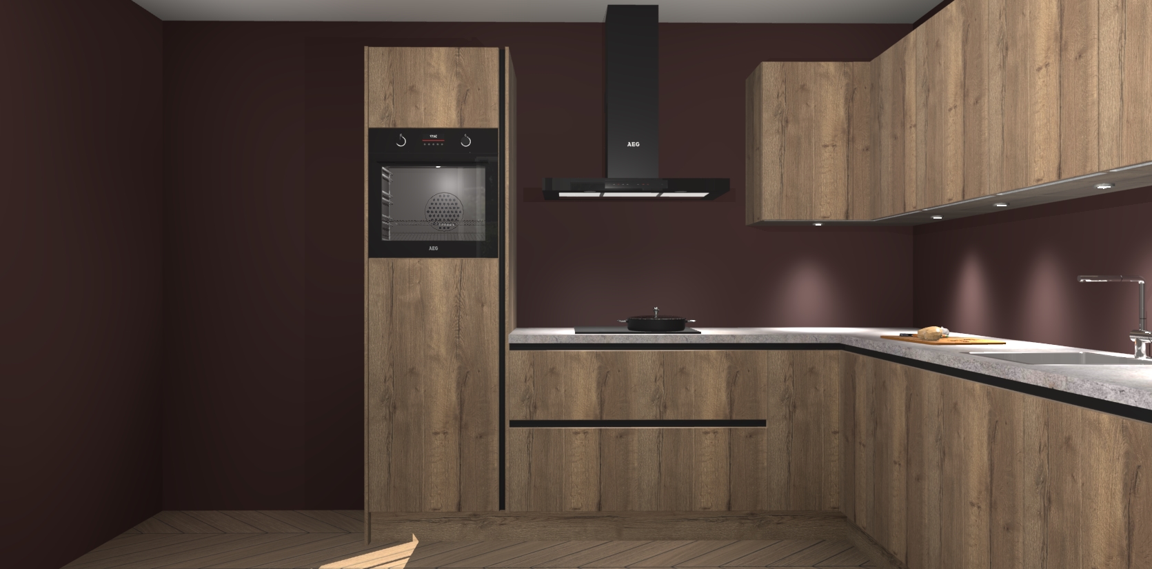 De Chocolade Eiken greeploze keuken Debar is uitgerust met vijf inbouwapparaten die elke kooktaak handig en efficiënt maken. Een oven, inductiekookplaat, afzuigkap, vaatwasser en koelkast zijn standaard, maar kunnen na bestelling eenvoudig worden geupgrade naar AEG. Profiteer vervolgens van de softclose deuren voor snelle toegang en geruisloze toegang.