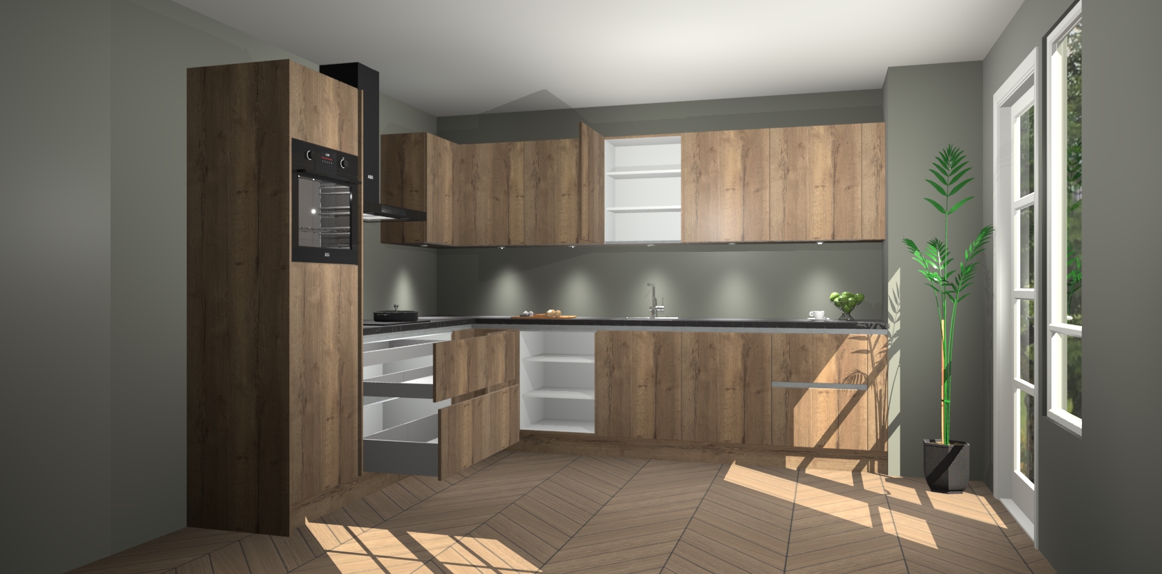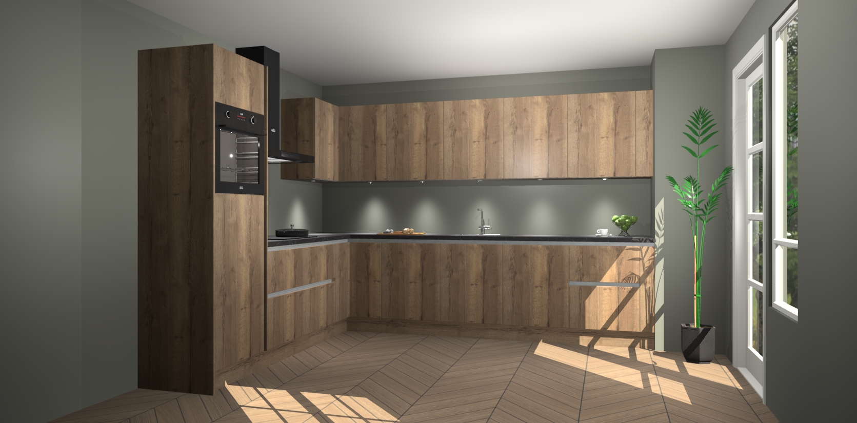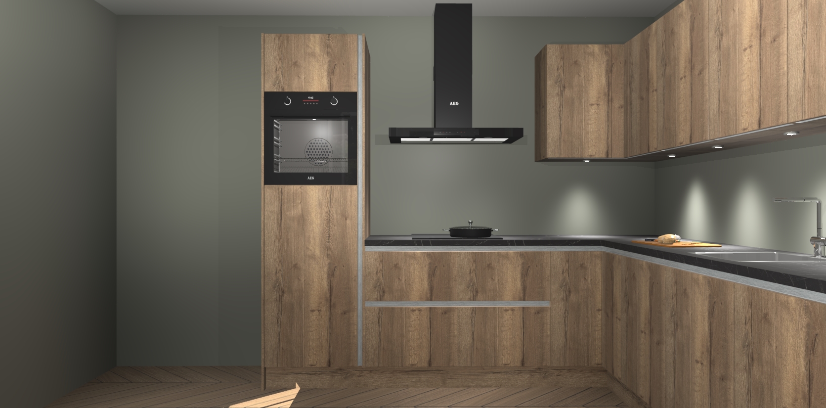 De Chocolade Eiken greeploze keuken Debar is uitgerust met vijf inbouwapparaten die elke kooktaak handig en efficiënt maken. Een oven, inductiekookplaat, afzuigkap, vaatwasser en koelkast zijn standaard, maar kunnen na bestelling eenvoudig worden geupgrade naar AEG. Profiteer vervolgens van de softclose deuren voor snelle toegang en geruisloze toegang.