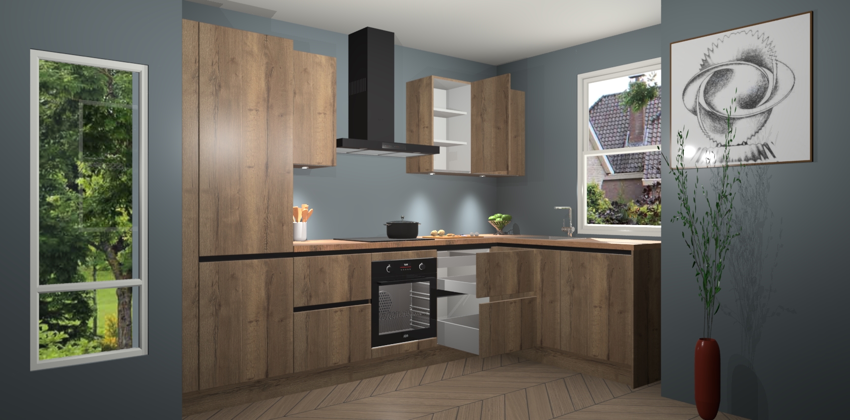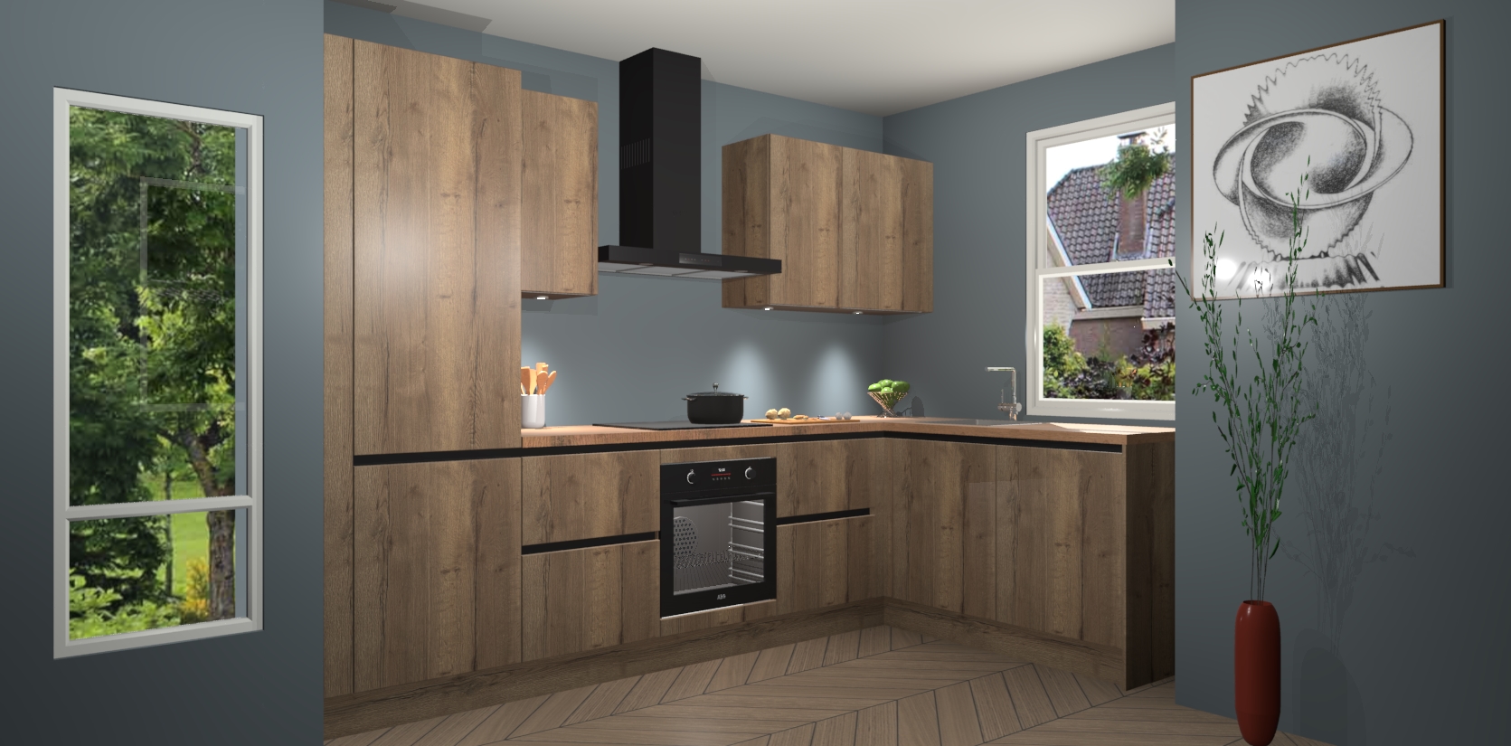 De Chocolade Eiken greeploze keuken Geneve is uitgerust met 5 inbouwapparaten - een oven, inductiekookplaat, afzuigkap, vaatwasser en koelkast - voor al uw kook- en bewaarbehoeftes. U kunt deze apparaten desgewenst eenvoudig upgraden naar AEG of de oven omruilen voor een combimagnetron na het plaatsen van uw bestelling. En met de soft close deuren, voldoende opbergruimte en kasten die voorgemonteerd worden geleverd, bent u in een mum van tijd klaar om heerlijke maaltijden te bereiden!