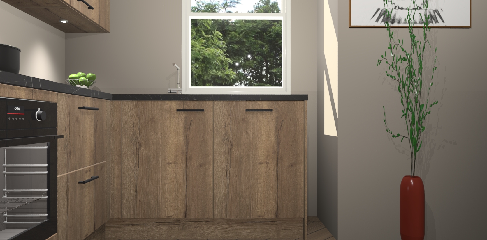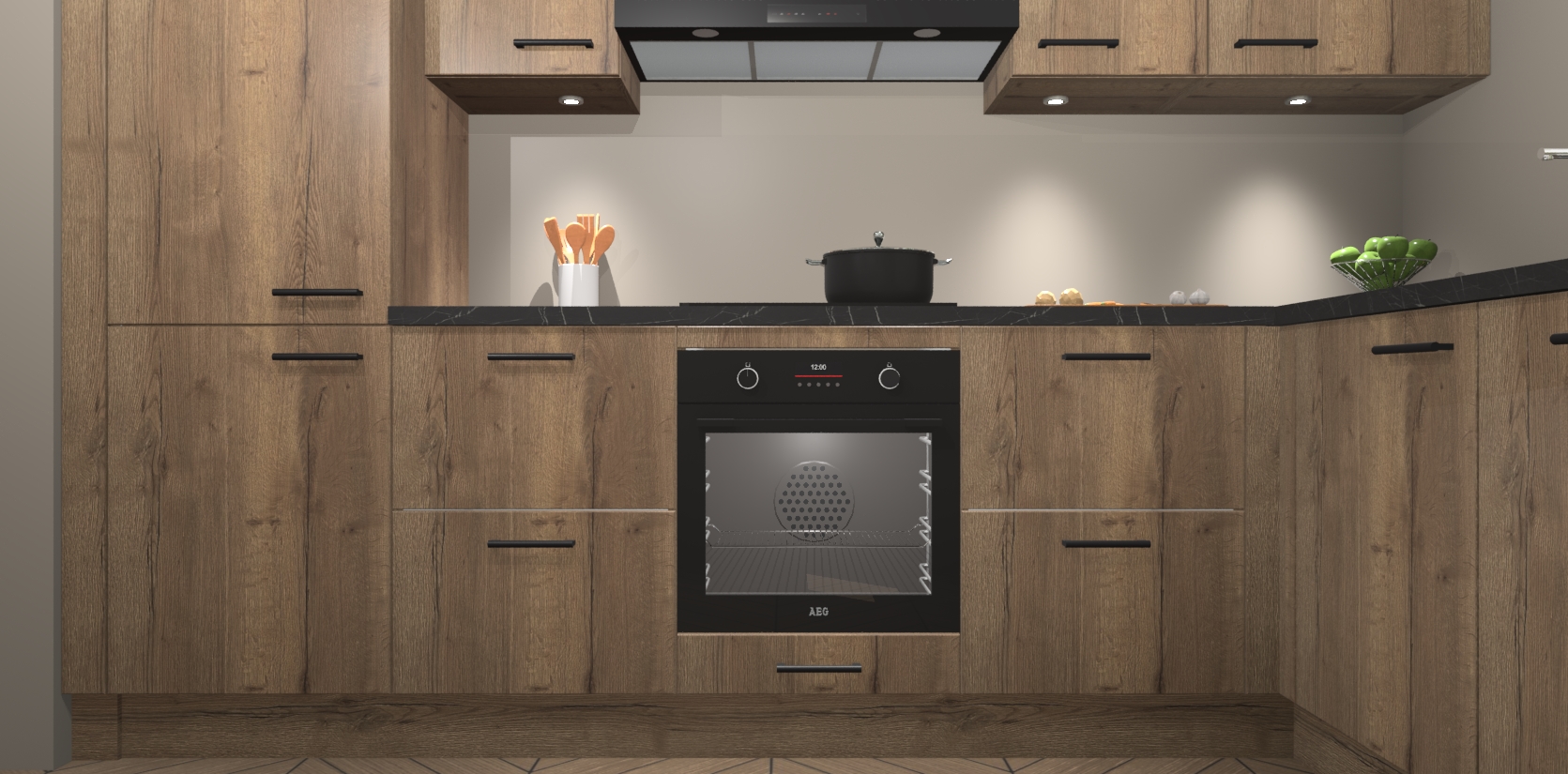 De Chocolade Eiken greeploze keuken Geneve is uitgerust met 5 inbouwapparaten - een oven, inductiekookplaat, afzuigkap, vaatwasser en koelkast - voor al uw kook- en bewaarbehoeftes. U kunt deze apparaten desgewenst eenvoudig upgraden naar AEG of de oven omruilen voor een combimagnetron na het plaatsen van uw bestelling. En met de soft close deuren, voldoende opbergruimte en kasten die voorgemonteerd worden geleverd, bent u in een mum van tijd klaar om heerlijke maaltijden te bereiden!