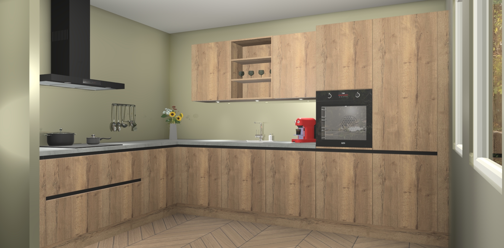 De Chocolade Eiken greeploze keuken Gotenburg is zo ontworpen dat u alle mogelijke vormen van opslagruimte kunt genieten. Bovendien heeft u meteen toegang tot vijf ingebouwde apparaten: een oven, inductiekookplaat, afzuigkap, vaatwasser en koelkast. Gewoon upgraden naar AEG na bestelling? Dit kan heel gemakkelijk worden geregeld. De deuren sluiten zacht dankzij zachtsluitende scharnieren en ze houden warmte vast terwijl ze uitzonderlijk stil blijven wanneer ze worden geopend of gesloten.