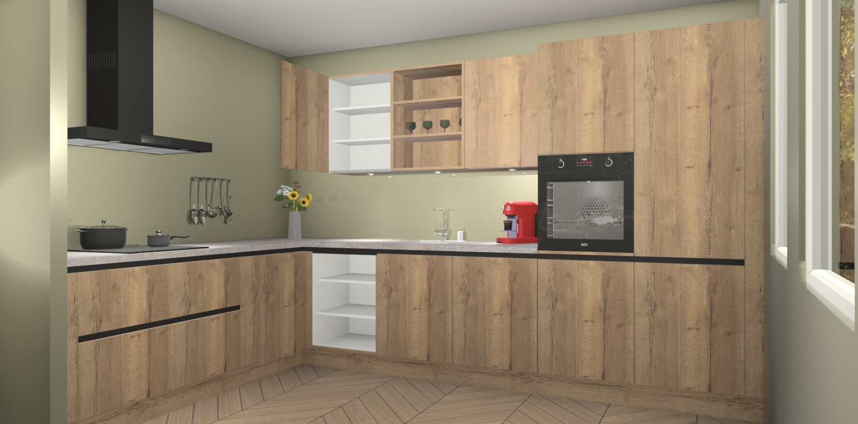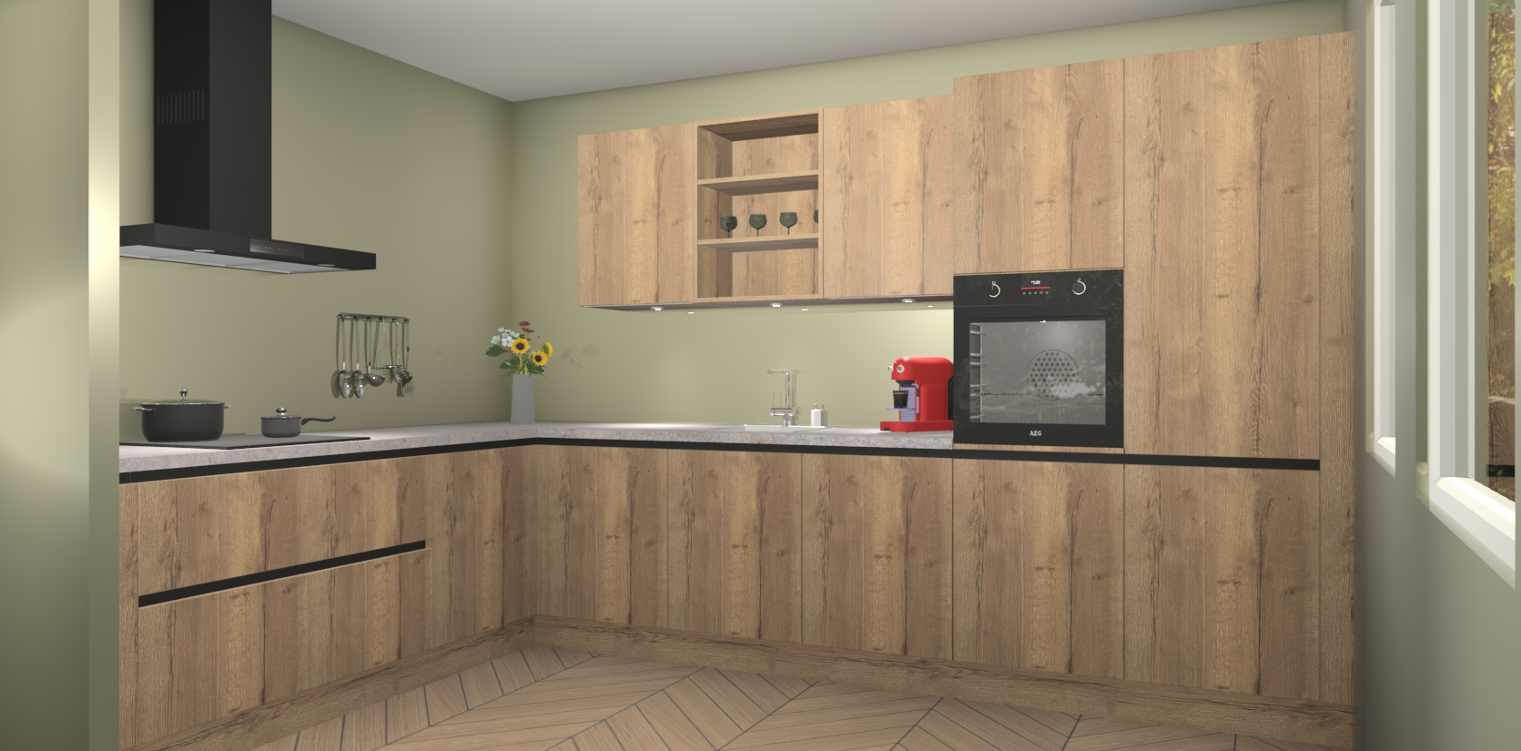 De Chocolade Eiken greeploze keuken Gotenburg is zo ontworpen dat u alle mogelijke vormen van opslagruimte kunt genieten. Bovendien heeft u meteen toegang tot vijf ingebouwde apparaten: een oven, inductiekookplaat, afzuigkap, vaatwasser en koelkast. Gewoon upgraden naar AEG na bestelling? Dit kan heel gemakkelijk worden geregeld. De deuren sluiten zacht dankzij zachtsluitende scharnieren en ze houden warmte vast terwijl ze uitzonderlijk stil blijven wanneer ze worden geopend of gesloten.