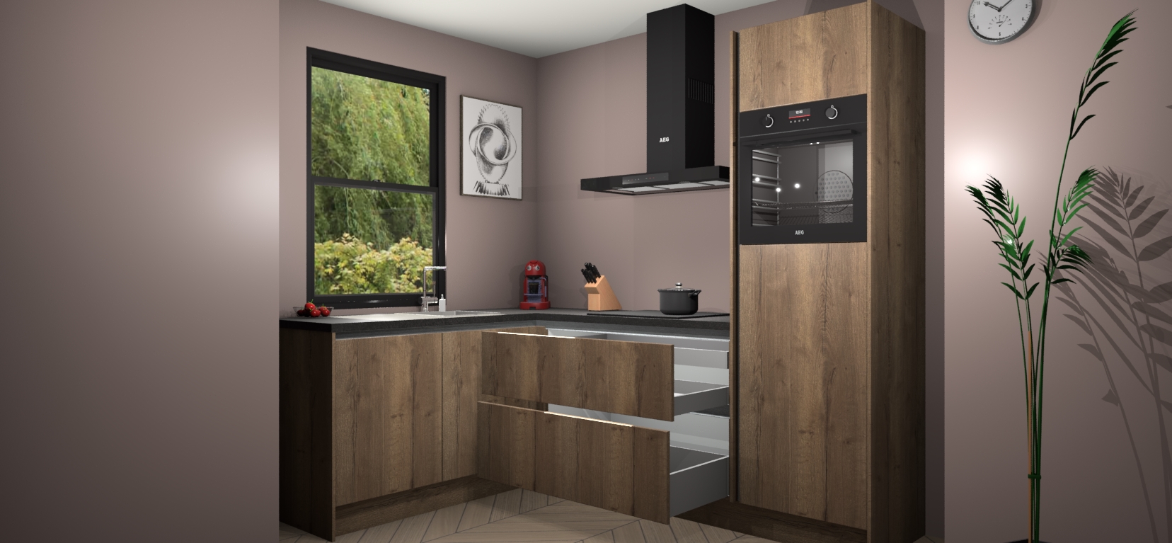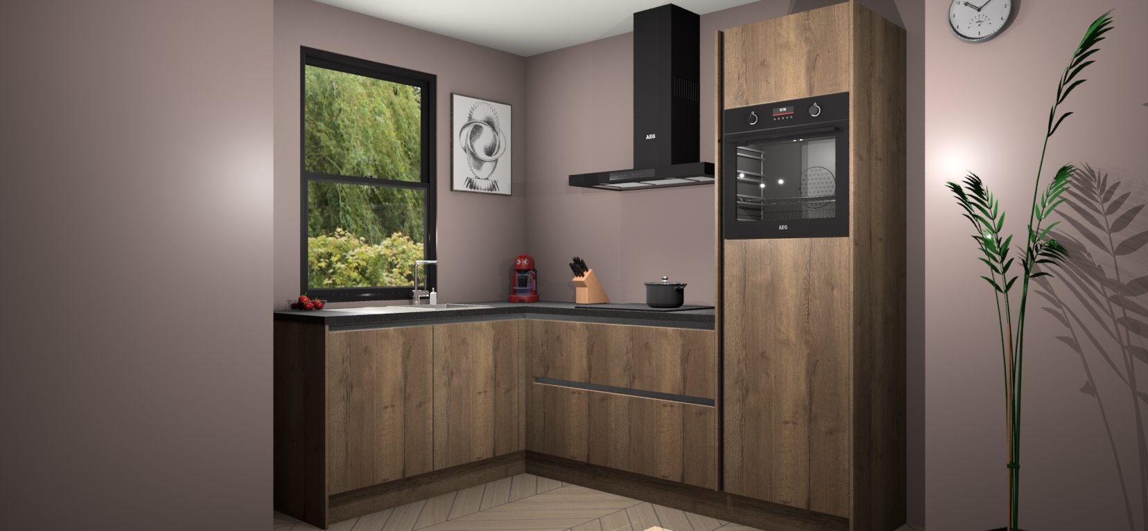 Deze prachtige hoekkeuken heeft alle benodigdheden om uw droomkook- en eetruimte compleet te maken. De Chocolade Eiken kasten bieden een echo van raffinement, terwijl de 5 inbouwapparaten genoeg opties bieden voor het bereiden van heerlijke maaltijden. De oven, inductiekookplaat, afzuigkap, vaatwasser en koelkast zorgen ervoor dat u tijd in de keuken zo efficiënt mogelijk verloopt, terwijl ze ook dat extra vleugje luxe bieden.