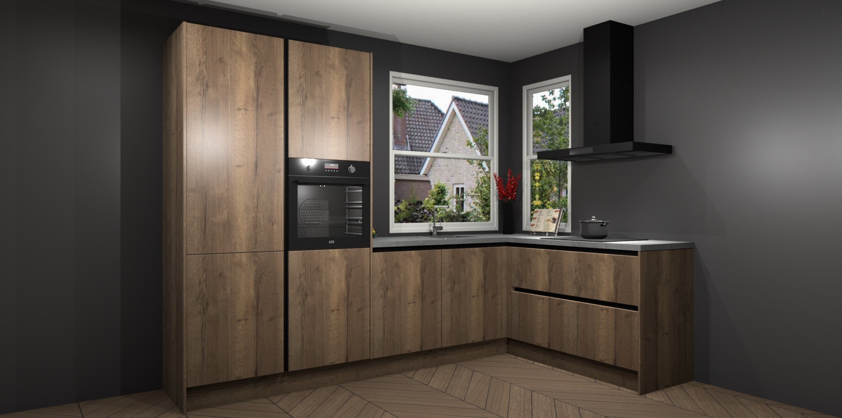 De Chocolade Eiken greeploze keuken Kotor wordt geleverd met vijf inbouwapparaten, waaronder een oven, inductiekookplaat, afzuigkap, vaatwasser en koelkast. En als u uw apparatuur wilt upgraden, kunnen we u na bestelling eenvoudig helpen overstappen naar AEG. Bovendien heeft deze keuken soft close deuren, zodat lades en kastjes geruisloos en zonder klepperen sluiten!