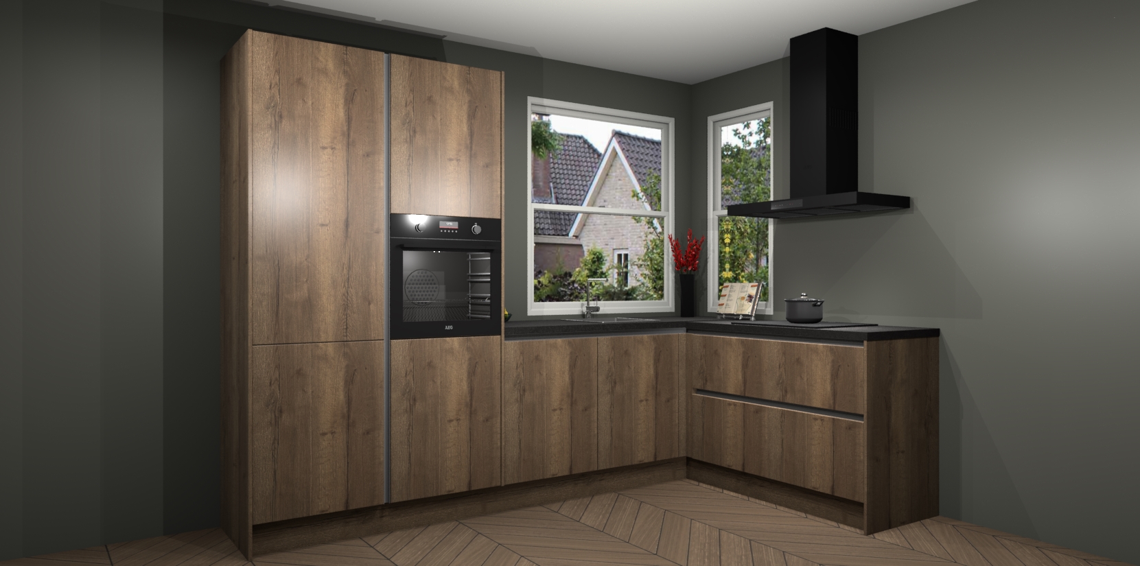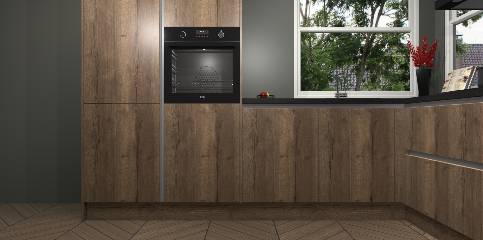 De Chocolade Eiken greeploze keuken Kotor wordt geleverd met vijf inbouwapparaten, waaronder een oven, inductiekookplaat, afzuigkap, vaatwasser en koelkast. En als u uw apparatuur wilt upgraden, kunnen we u na bestelling eenvoudig helpen overstappen naar AEG. Bovendien heeft deze keuken soft close deuren, zodat lades en kastjes geruisloos en zonder klepperen sluiten!