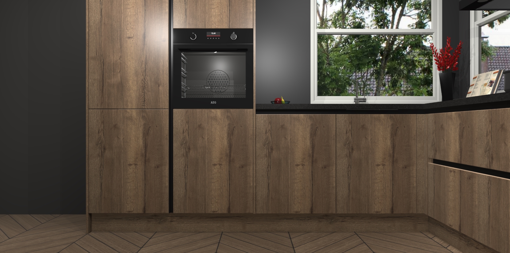 De Chocolade Eiken greeploze keuken Kotor wordt geleverd met vijf inbouwapparaten, waaronder een oven, inductiekookplaat, afzuigkap, vaatwasser en koelkast. En als u uw apparatuur wilt upgraden, kunnen we u na bestelling eenvoudig helpen overstappen naar AEG. Bovendien heeft deze keuken soft close deuren, zodat lades en kastjes geruisloos en zonder klepperen sluiten!