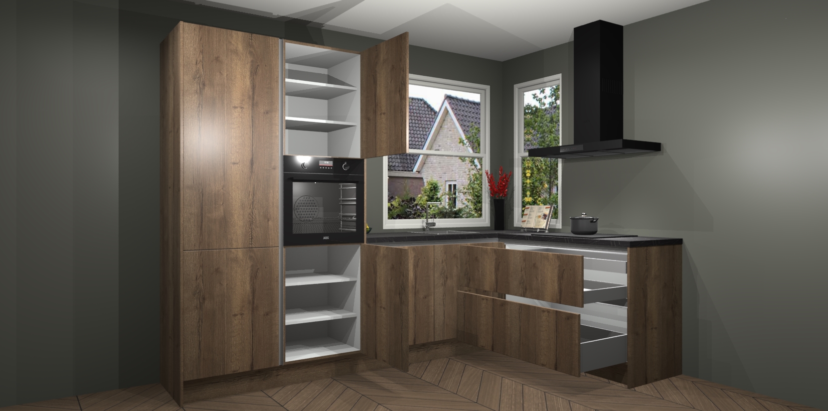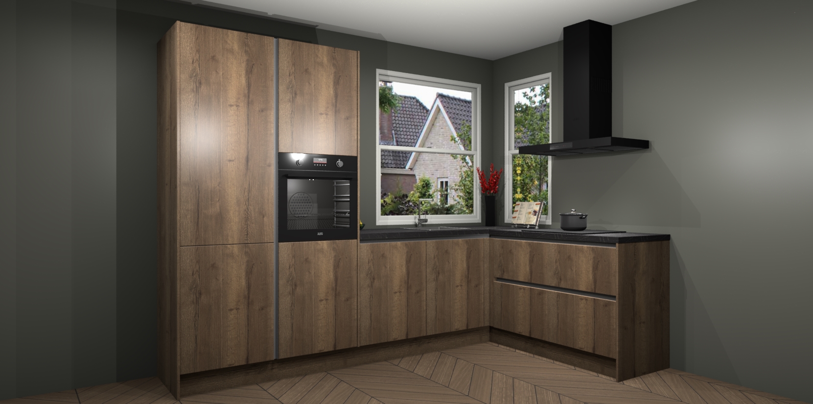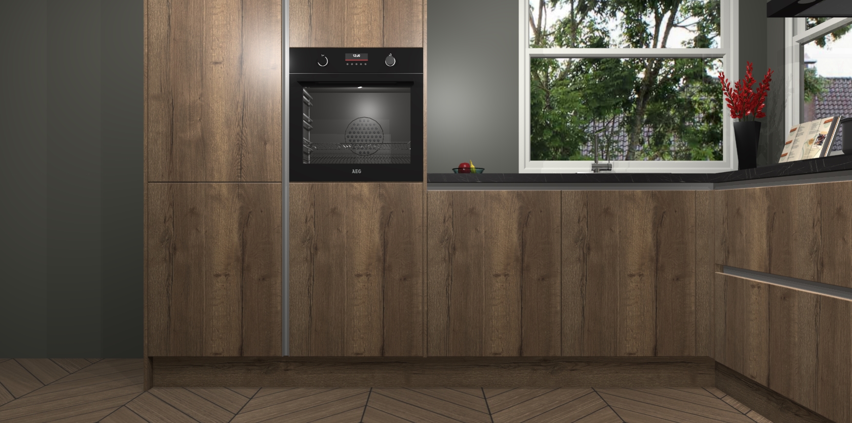 De Chocolade Eiken greeploze keuken Kotor wordt geleverd met vijf inbouwapparaten, waaronder een oven, inductiekookplaat, afzuigkap, vaatwasser en koelkast. En als u uw apparatuur wilt upgraden, kunnen we u na bestelling eenvoudig helpen overstappen naar AEG. Bovendien heeft deze keuken soft close deuren, zodat lades en kastjes geruisloos en zonder klepperen sluiten!