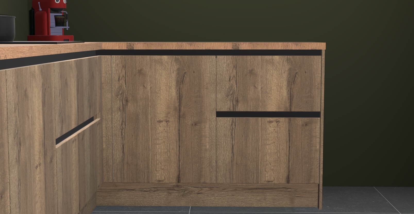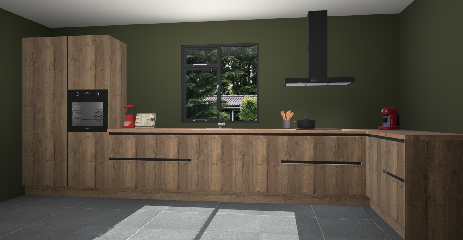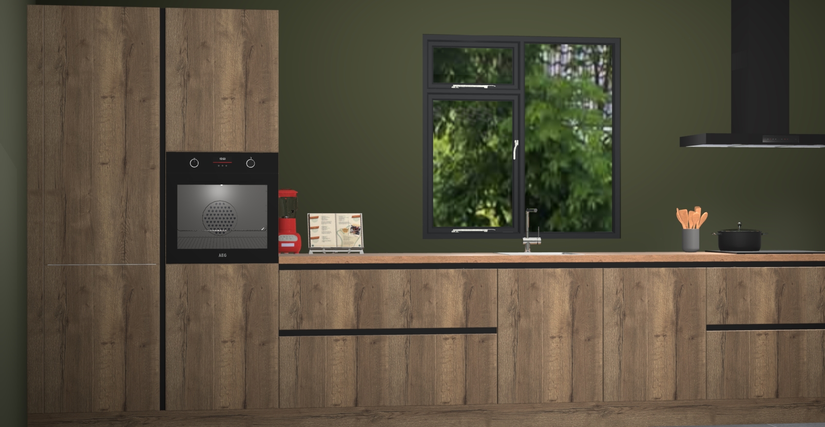 De Chocolade eiken keuken Lille wordt geleverd met vijf inbouwapparaten - een oven, inductiekookplaat, afzuigkap, vaatwasser en koelkast. Maar dat is nog niet alles! Na bestelling kunnen deze apparaten eenvoudig worden geüpgraded naar premium AEG-apparatuur. Bovendien is er zelfs de optie om de oven te vervangen door een combimagnetron of uw inductiekookplaat te vervangen door een kookplaat met geïntegreerde afzuiging.