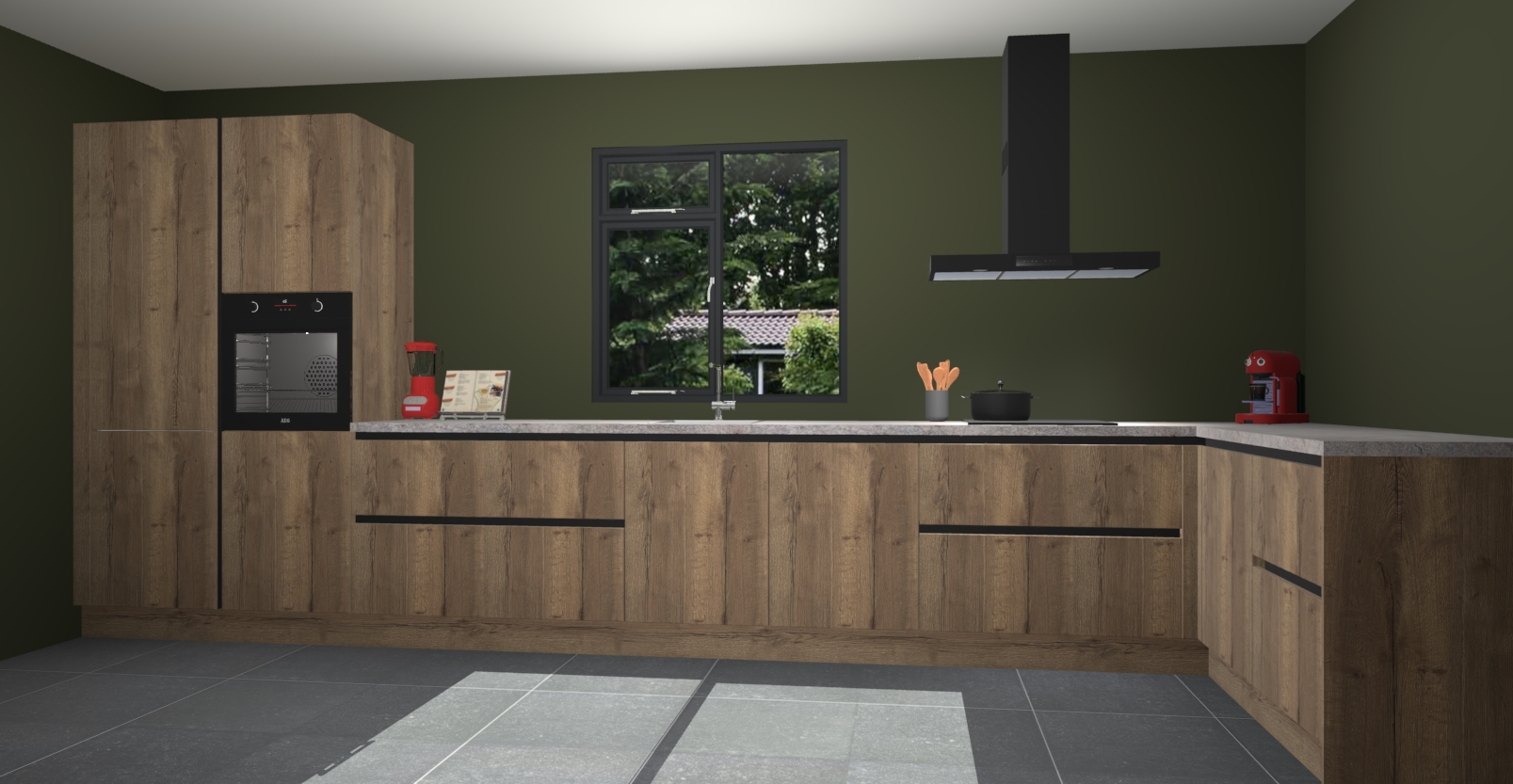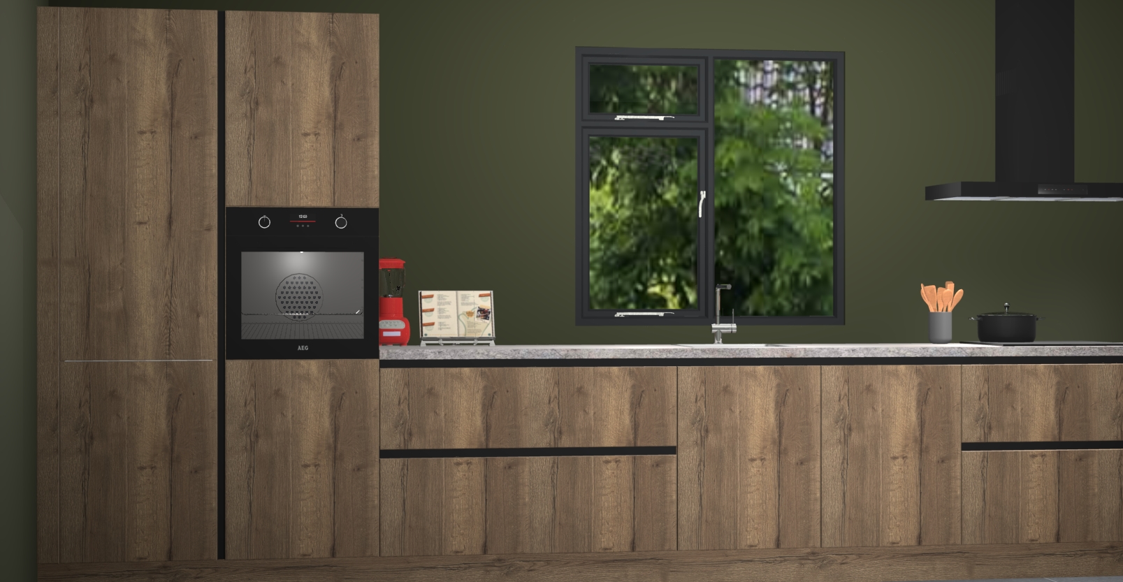 De Chocolade eiken keuken Lille wordt geleverd met vijf inbouwapparaten - een oven, inductiekookplaat, afzuigkap, vaatwasser en koelkast. Maar dat is nog niet alles! Na bestelling kunnen deze apparaten eenvoudig worden geüpgraded naar premium AEG-apparatuur. Bovendien is er zelfs de optie om de oven te vervangen door een combimagnetron of uw inductiekookplaat te vervangen door een kookplaat met geïntegreerde afzuiging.