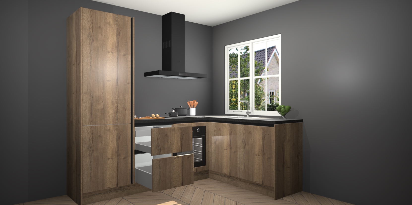 De Chocolade Eiken greeploze keuken Linz is de perfecte keuze voor uw nieuwe moderne en tijdloze keuken. Ga voor moderne en tijdloze elegantie in uw keuken. De prachtige hoekkeuken biedt een verfrissende kijk op de manier waarop we ons vertrouwde keukenontwerp kunnen aanpassen in een nieuwe stijl. Één blik om alles te zien: zo mooi dat het bijna magisch lijkt.