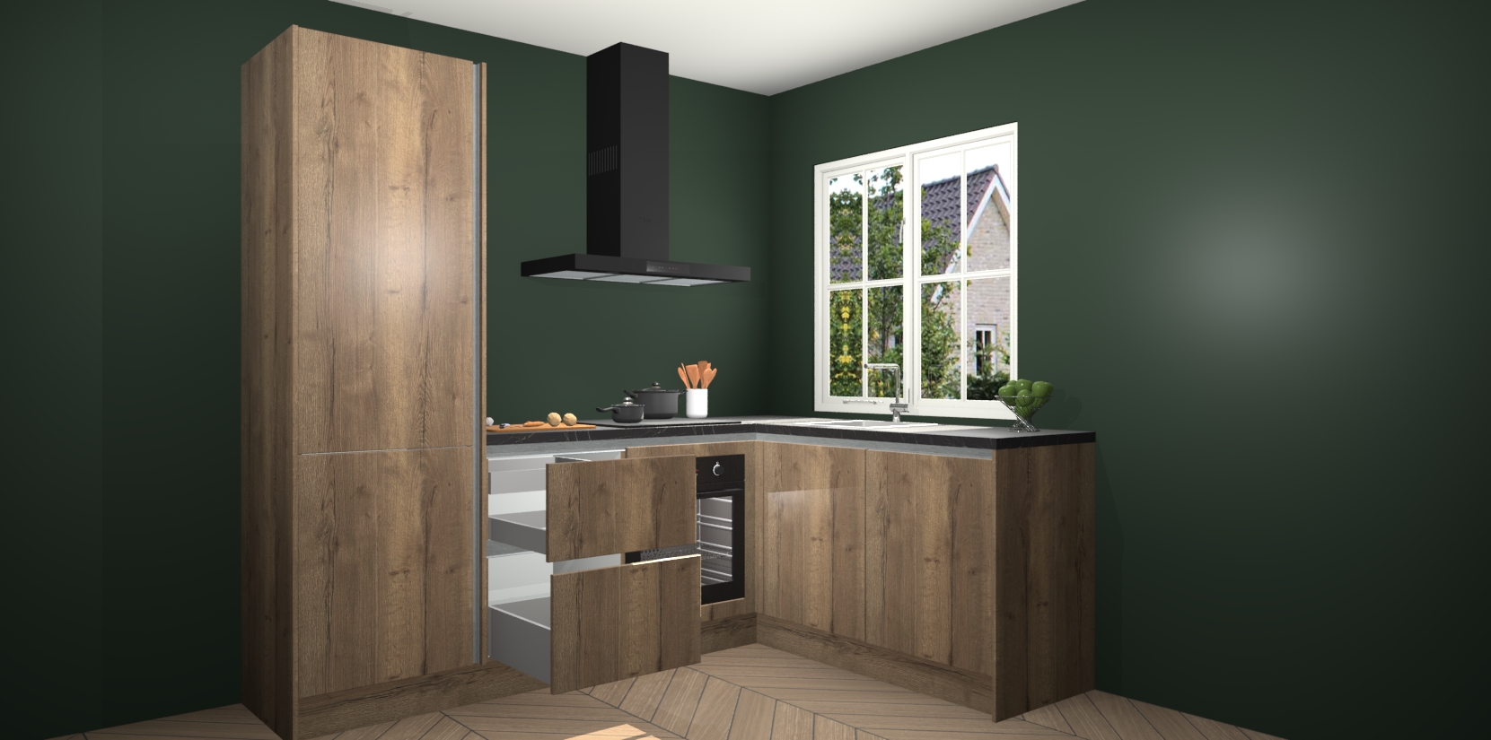 De Chocolade Eiken greeploze keuken Linz is de perfecte keuze voor uw nieuwe moderne en tijdloze keuken. Ga voor moderne en tijdloze elegantie in uw keuken. De prachtige hoekkeuken biedt een verfrissende kijk op de manier waarop we ons vertrouwde keukenontwerp kunnen aanpassen in een nieuwe stijl. Één blik om alles te zien: zo mooi dat het bijna magisch lijkt.