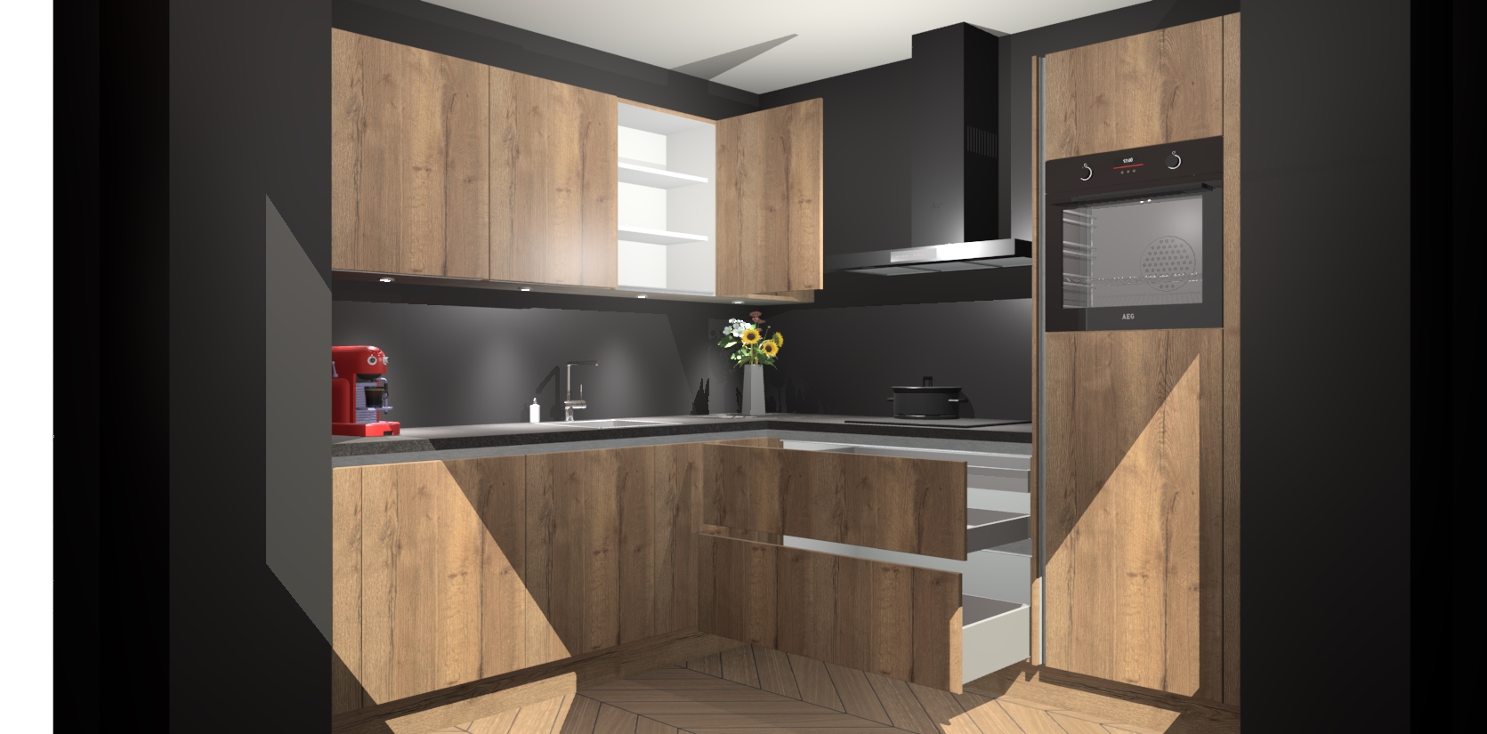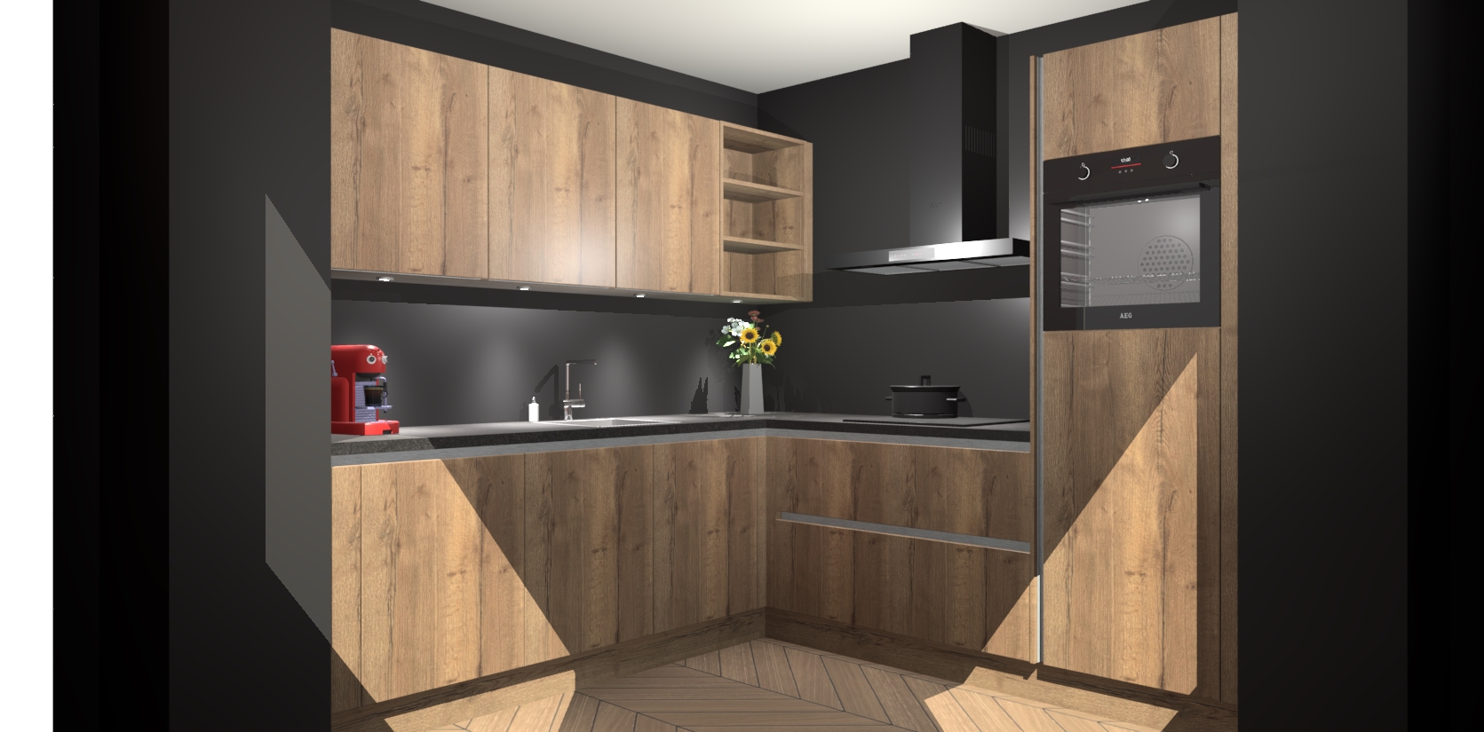 Met een modern, tijdloos design en ruime opslagruimte, zult u zich in no-time thuis voelen in uw nieuwe keuken. Uw leven wordt eenvoudiger met de soft-close deuren die voor het ultieme stille comfort zorgen - geen geluid dat u stoort terwijl u kookt. Ook is de keuken voorzien van 5 ingebouwde apparaten: een oven, inductie kookplaat, afzuigkap, vaatwasser en koelkast. Deze kunnen gemakkelijk na bestelling worden bijgewerkt naar AEG - waardoor uw luxe ervaring compleet is.