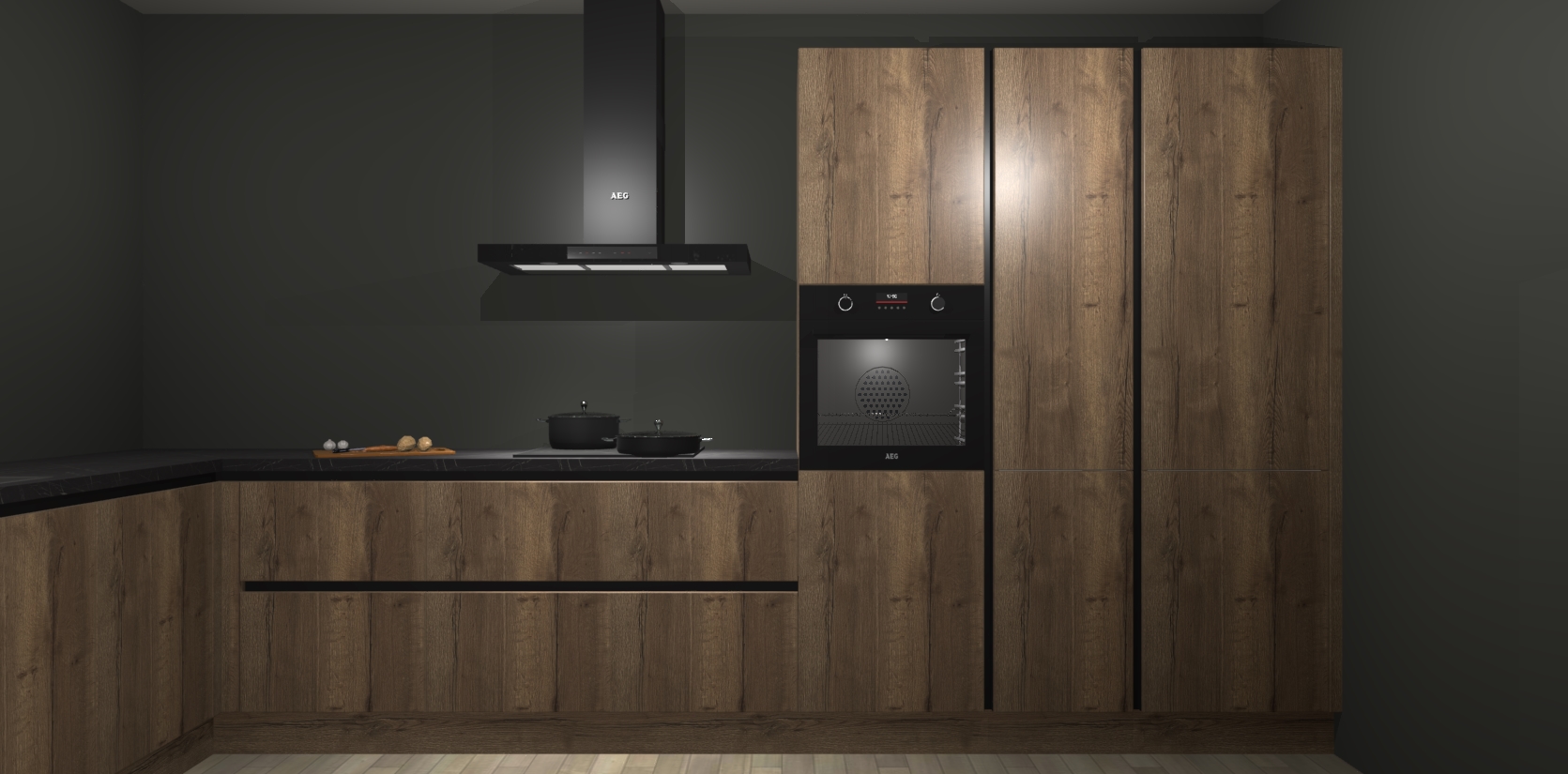 Welkom bij de chocolade eiken greeploze keuken Nuuk. Deze prachtige keuken zal de komende jaren het middelpunt van de belangstelling in uw huis zijn. Uitgerust met vijf inbouwapparaten komt u nooit kookgereedschap tekort.