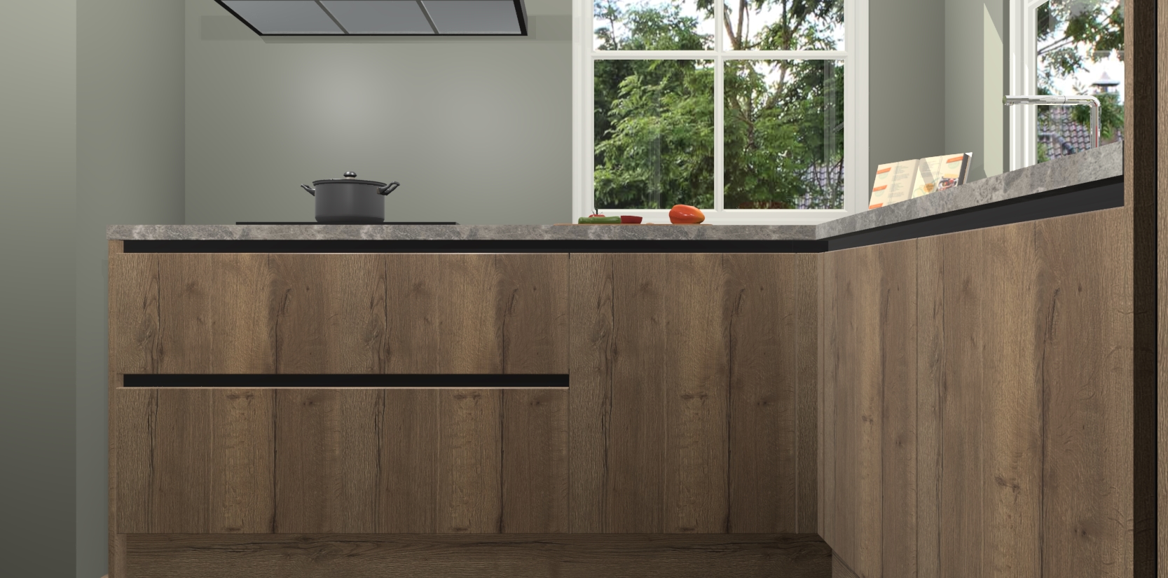 Maak kennis met de Chocolade Eiken greeploze keuken Pai: de perfecte keukenoplossing voor stijlzoekers die streven naar zowel schoonheid als een lange levensduur in hun huis. Dit tijdloze ontwerp is modern en verfijnd, waardoor het een prachtige aanvulling is op elke leefruimte.