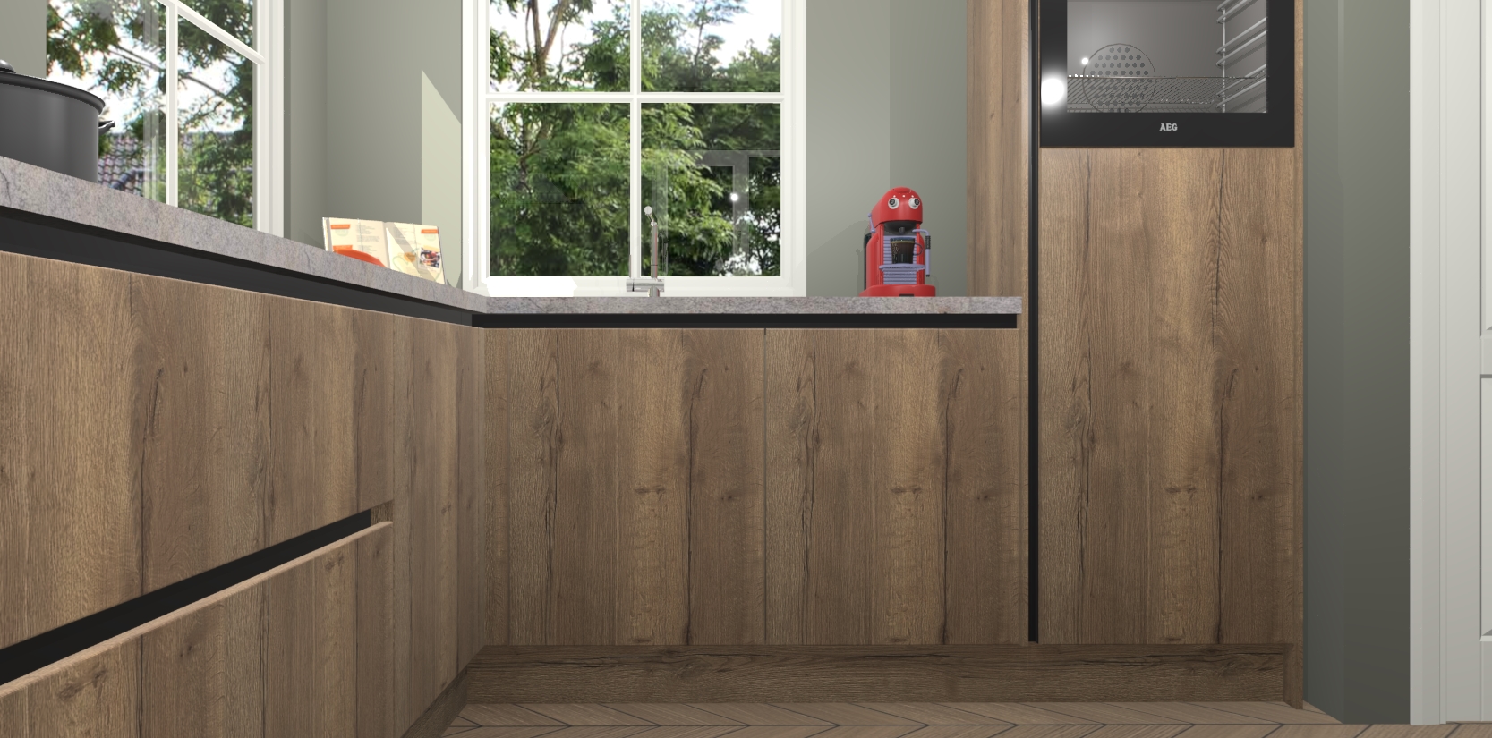 De Chocolade Eiken greeploze keuken Pai bevat vijf essentiële inbouwapparaten - een oven, inductiekookplaat, afzuigkap, vaatwasser en koelkast - zodat u er na levering meteen in kunt. Voor de slimme kopers die weten dat apparaten vaak het verschil kunnen maken tussen functioneel en luxueus, bieden we eenvoudige upgradeopties naar AEG, van oven naar combimagnetron na bestelling of naar een kookplaat met geïntrigeerde afzuiging. En met onze vaste lage prijs en snelle levering binnen zeven weken vanaf de orderbevestiging hoeft u zich geen zorgen te maken over verborgen kosten of lange levertijden die uw droomkeuken kunnen vertragen.