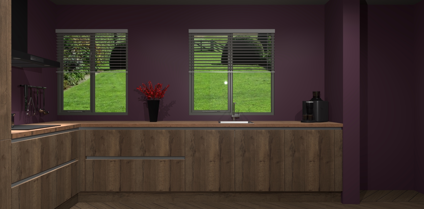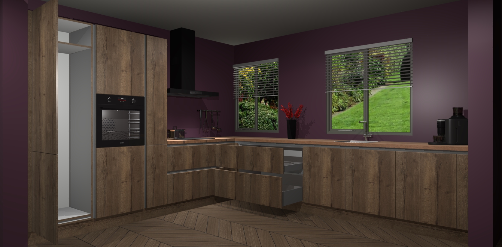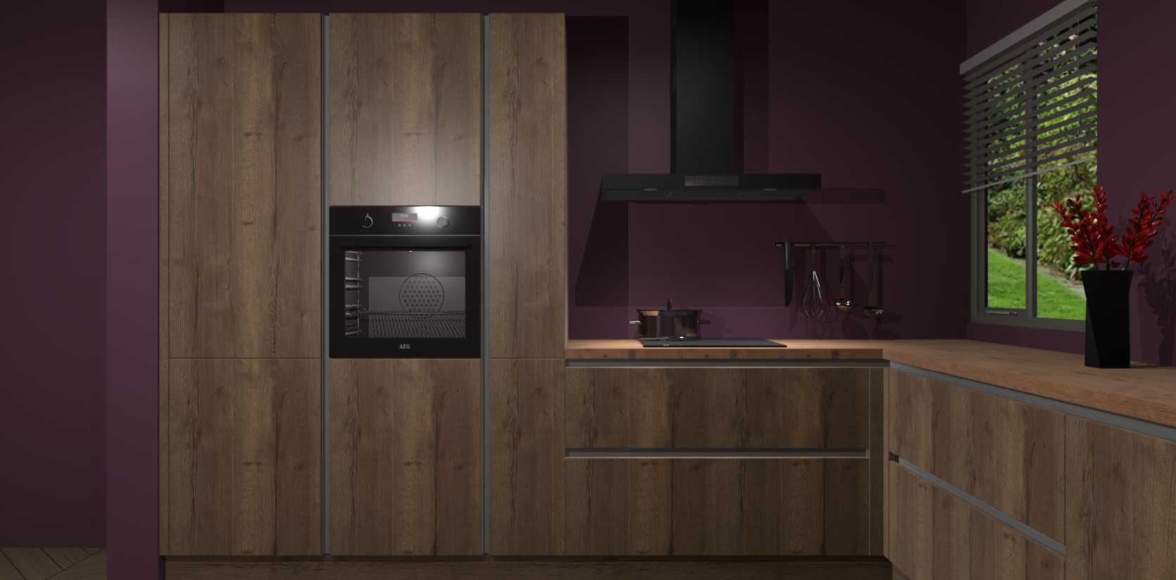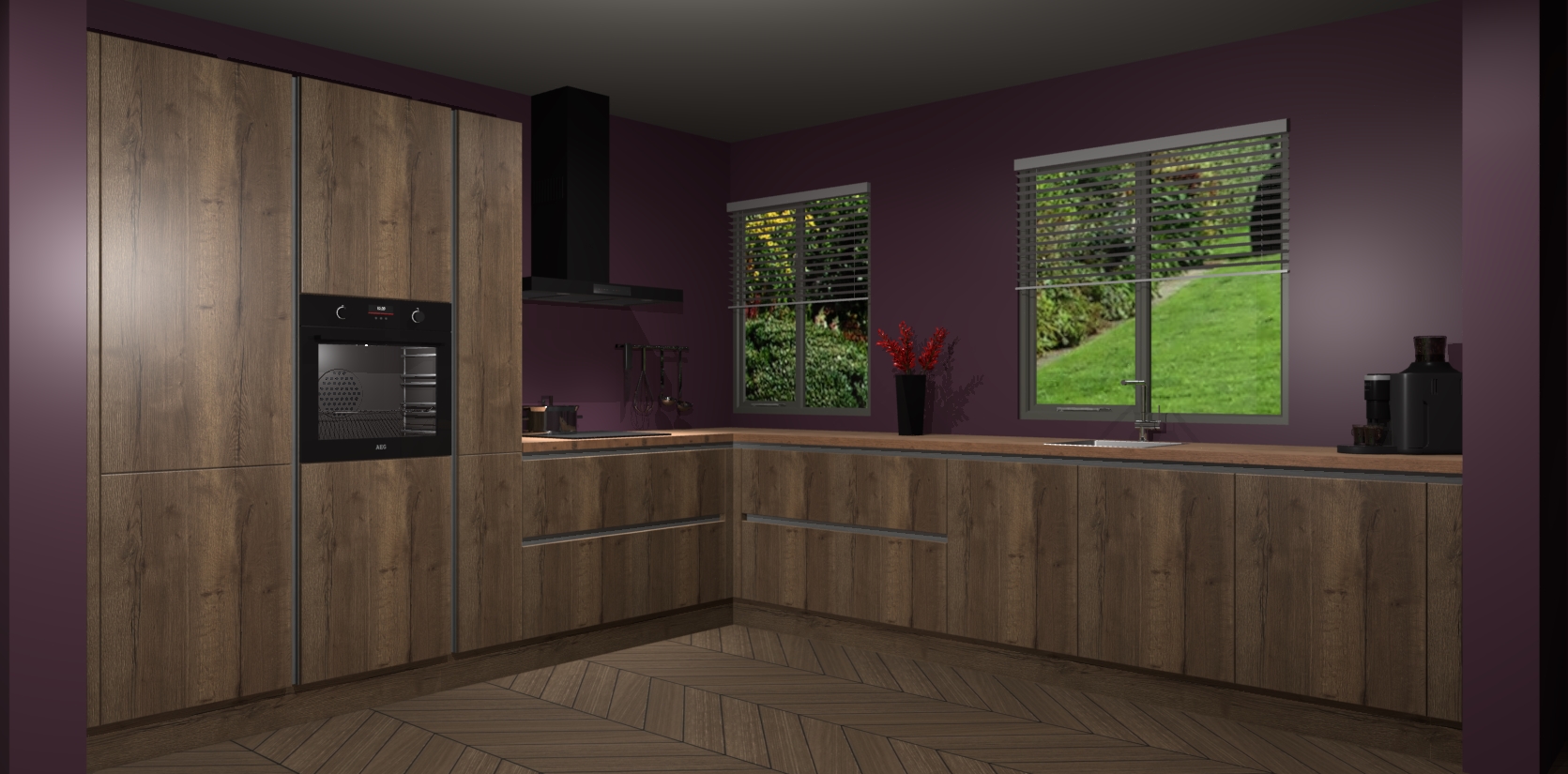 Welkom bij de Chocolade Eiken keuken Palermo. Deze prachtige keuken zal de komende jaren het middelpunt van de belangstelling in uw huis zijn. Uitgerust met vijf inbouwapparaten komt u nooit kookgereedschap tekort. Bovendien geeft de warme houtlook elke ruimte een uitnodigende en tijdloze uitstraling.
