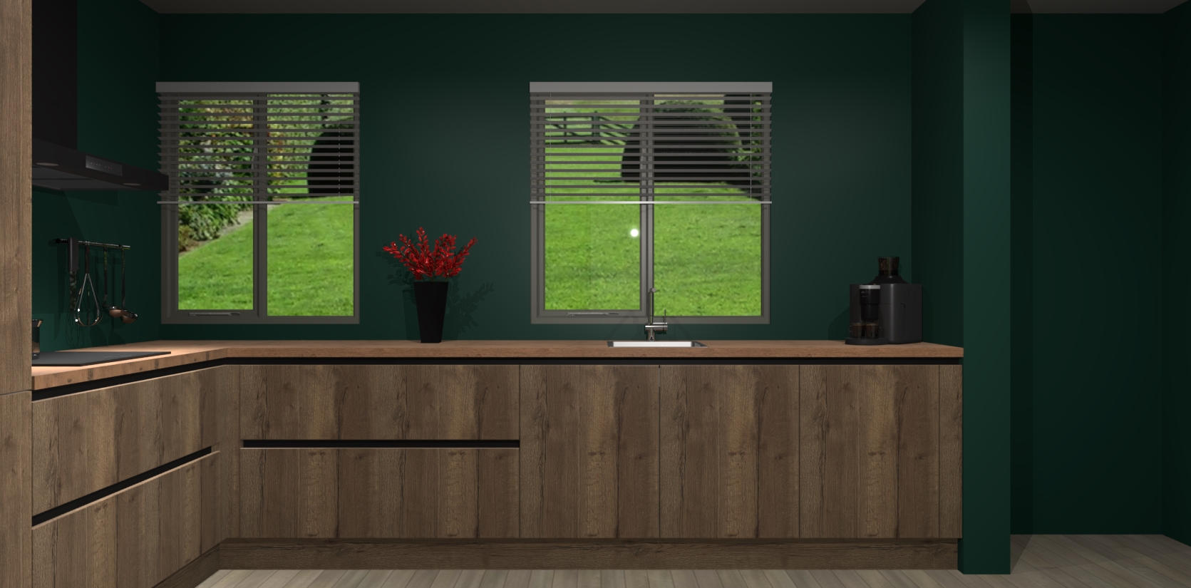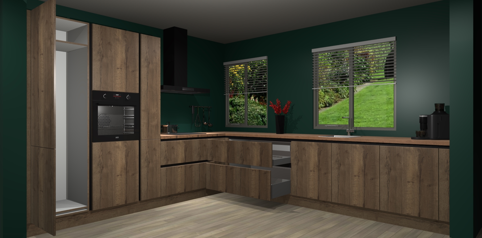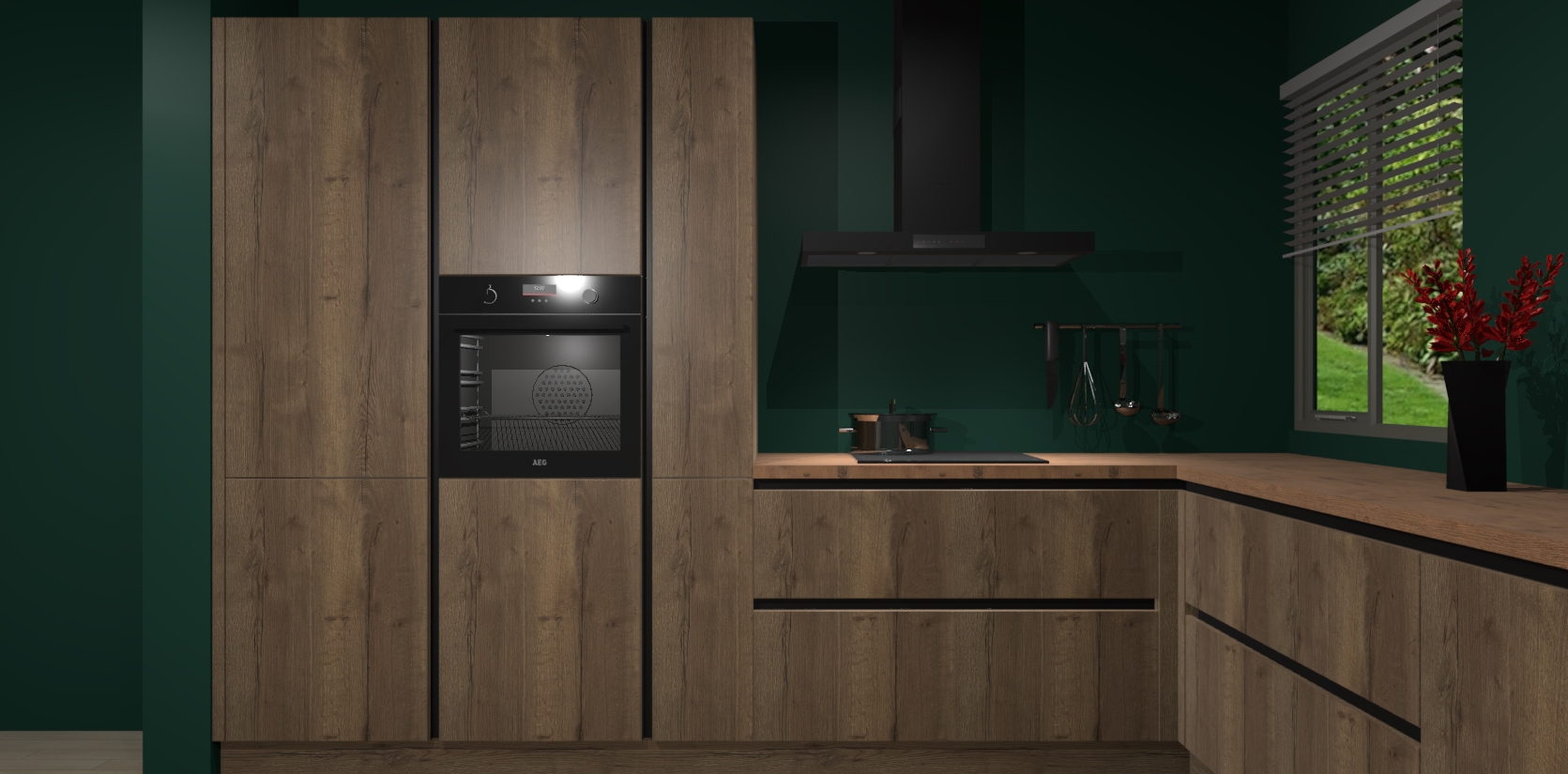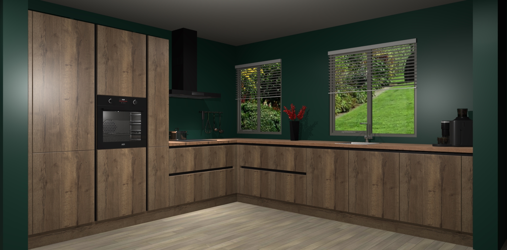 Welkom bij de Chocolade Eiken keuken Palermo. Deze prachtige keuken zal de komende jaren het middelpunt van de belangstelling in uw huis zijn. Uitgerust met vijf inbouwapparaten komt u nooit kookgereedschap tekort. Bovendien geeft de warme houtlook elke ruimte een uitnodigende en tijdloze uitstraling.