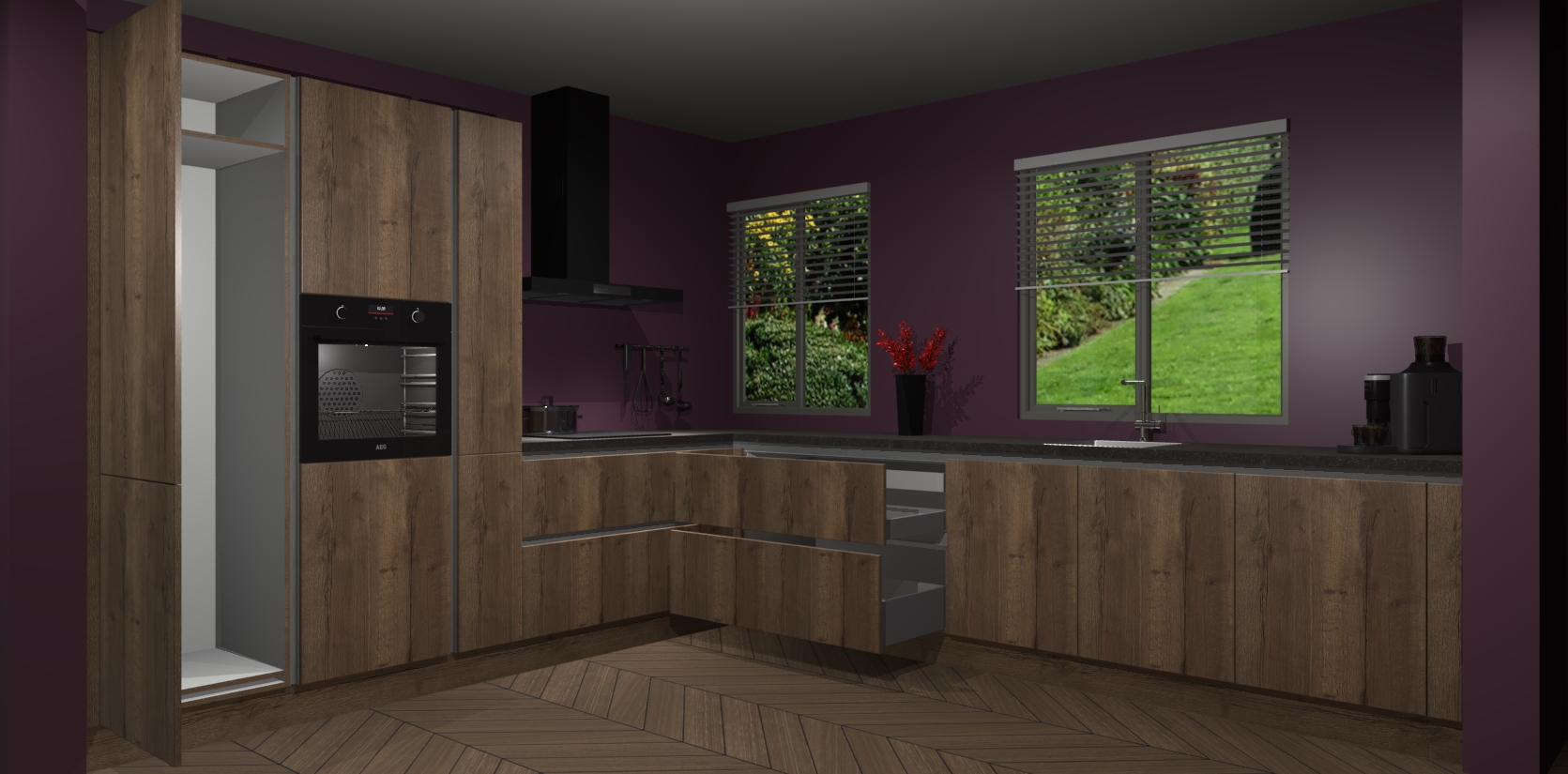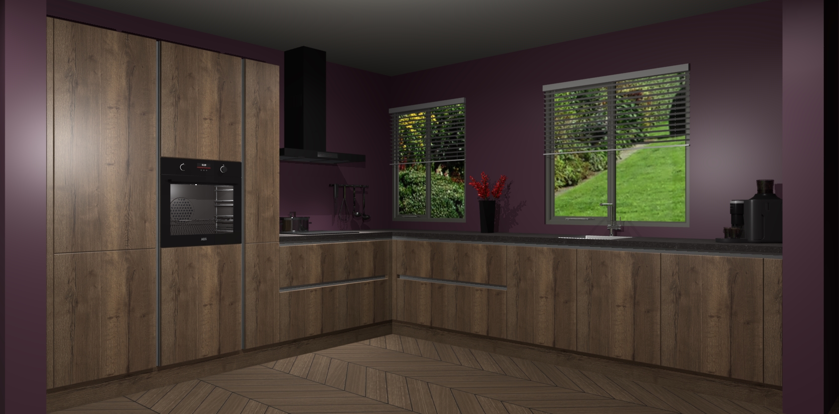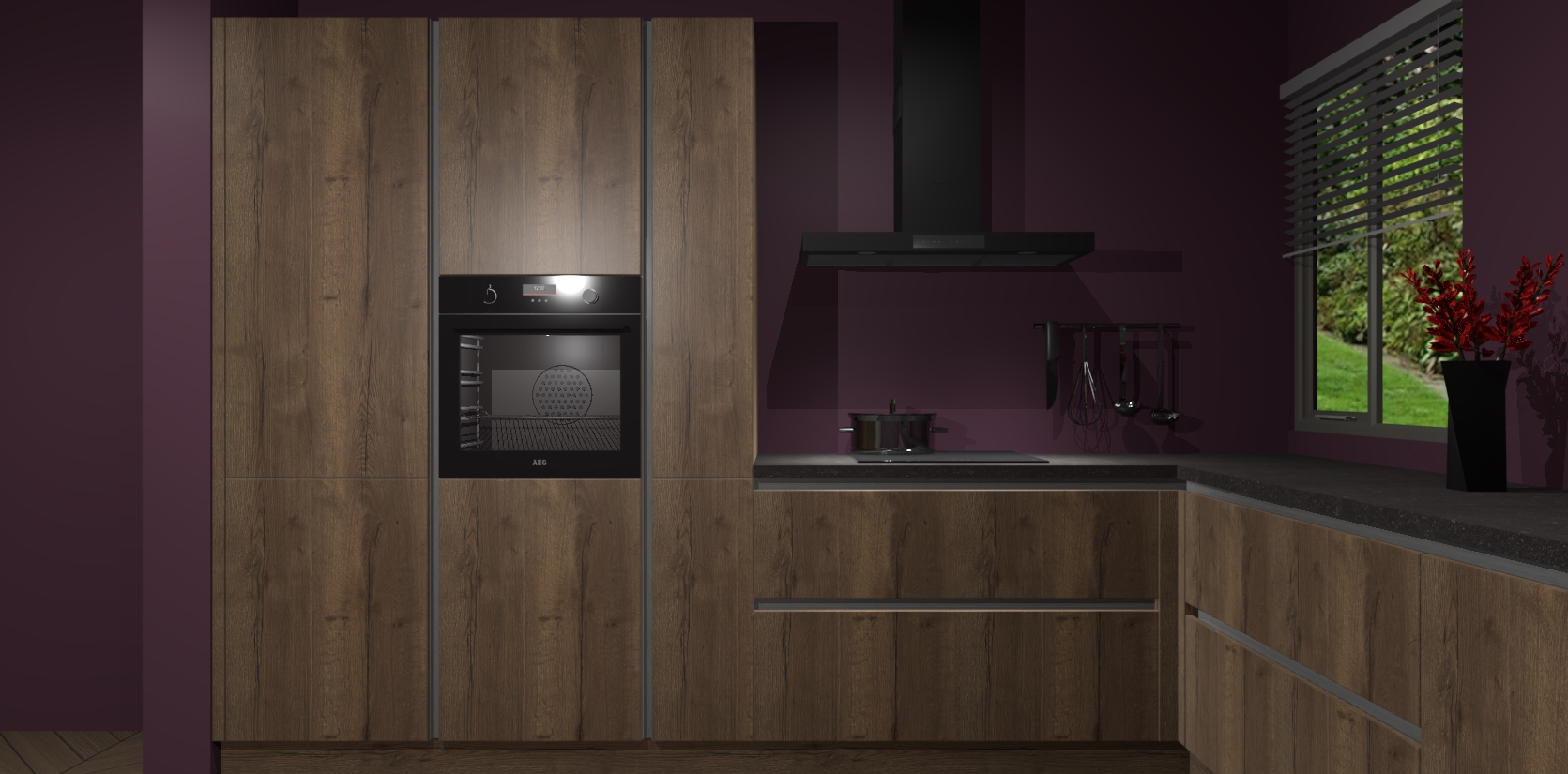 Welkom bij de Chocolade Eiken keuken Palermo. Deze prachtige keuken zal de komende jaren het middelpunt van de belangstelling in uw huis zijn. Uitgerust met vijf inbouwapparaten komt u nooit kookgereedschap tekort. Bovendien geeft de warme houtlook elke ruimte een uitnodigende en tijdloze uitstraling.