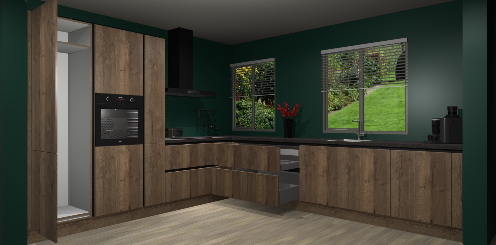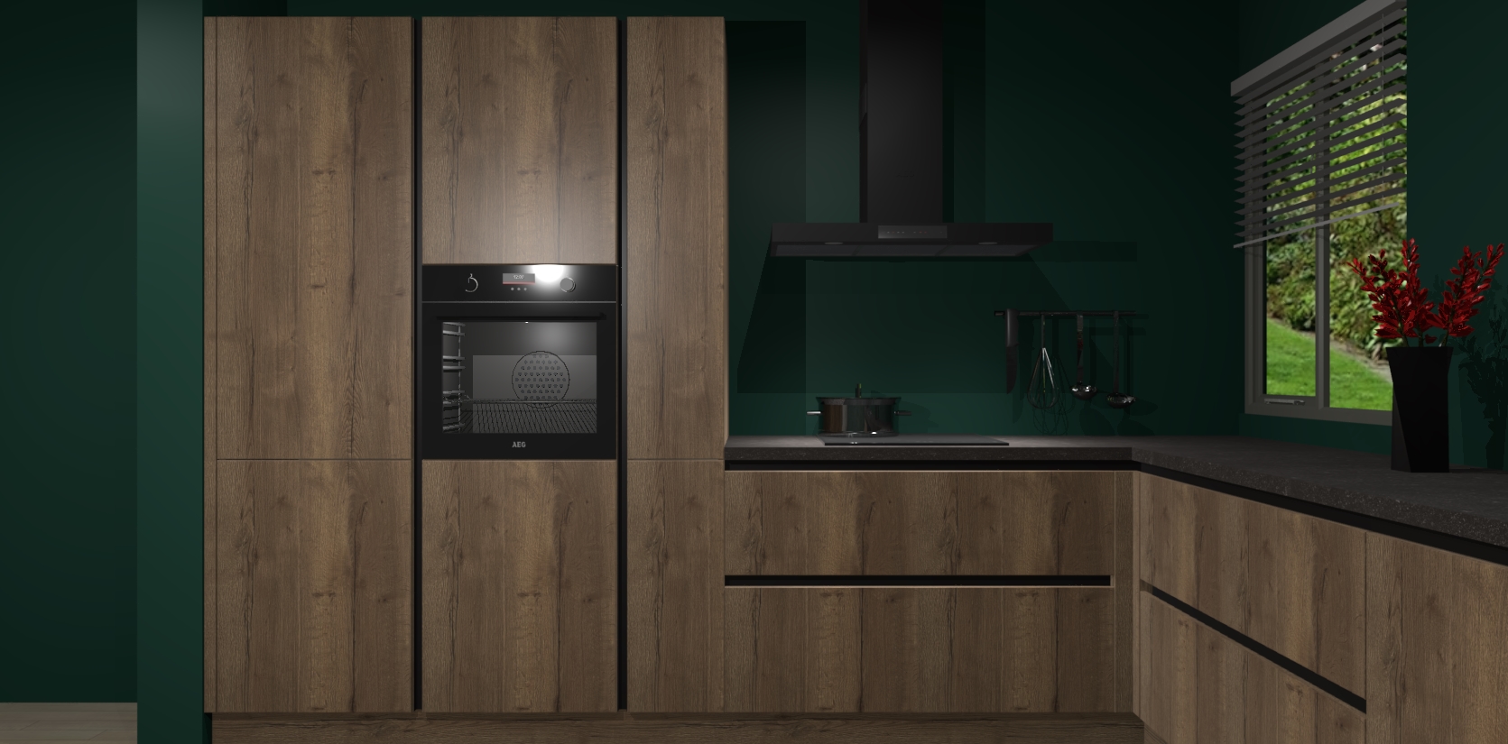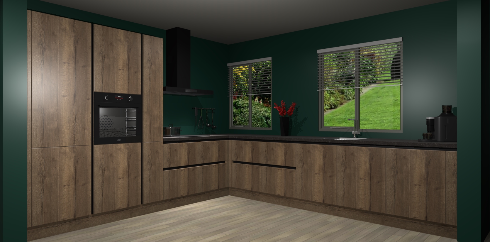 Welkom bij de Chocolade Eiken keuken Palermo. Deze prachtige keuken zal de komende jaren het middelpunt van de belangstelling in uw huis zijn. Uitgerust met vijf inbouwapparaten komt u nooit kookgereedschap tekort. Bovendien geeft de warme houtlook elke ruimte een uitnodigende en tijdloze uitstraling.