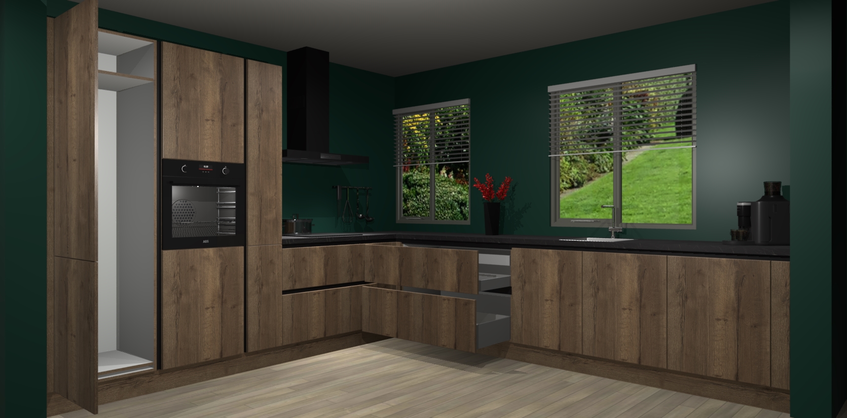 Welkom bij de Chocolade Eiken keuken Palermo. Deze prachtige keuken zal de komende jaren het middelpunt van de belangstelling in uw huis zijn. Uitgerust met vijf inbouwapparaten komt u nooit kookgereedschap tekort. Bovendien geeft de warme houtlook elke ruimte een uitnodigende en tijdloze uitstraling.