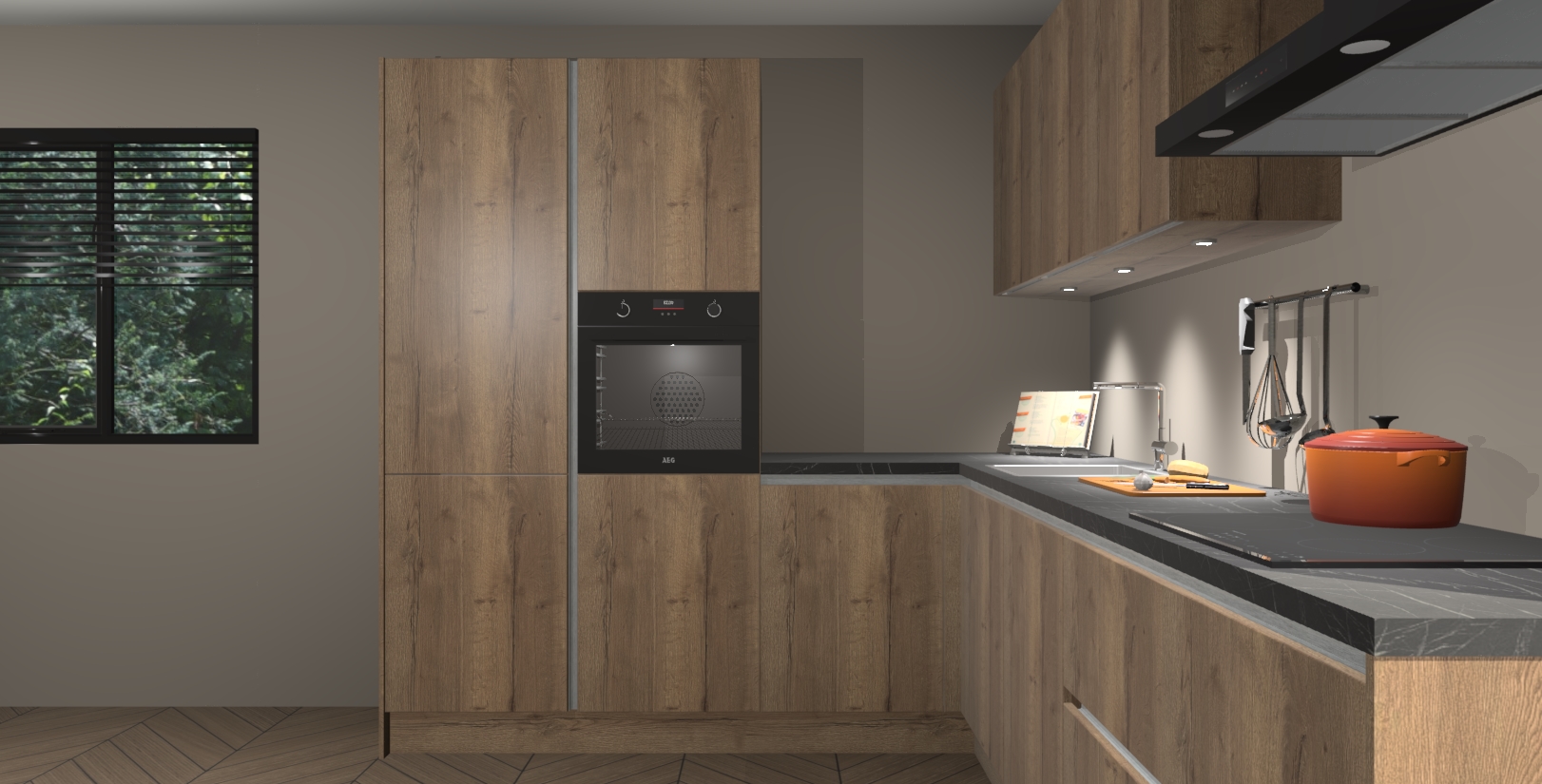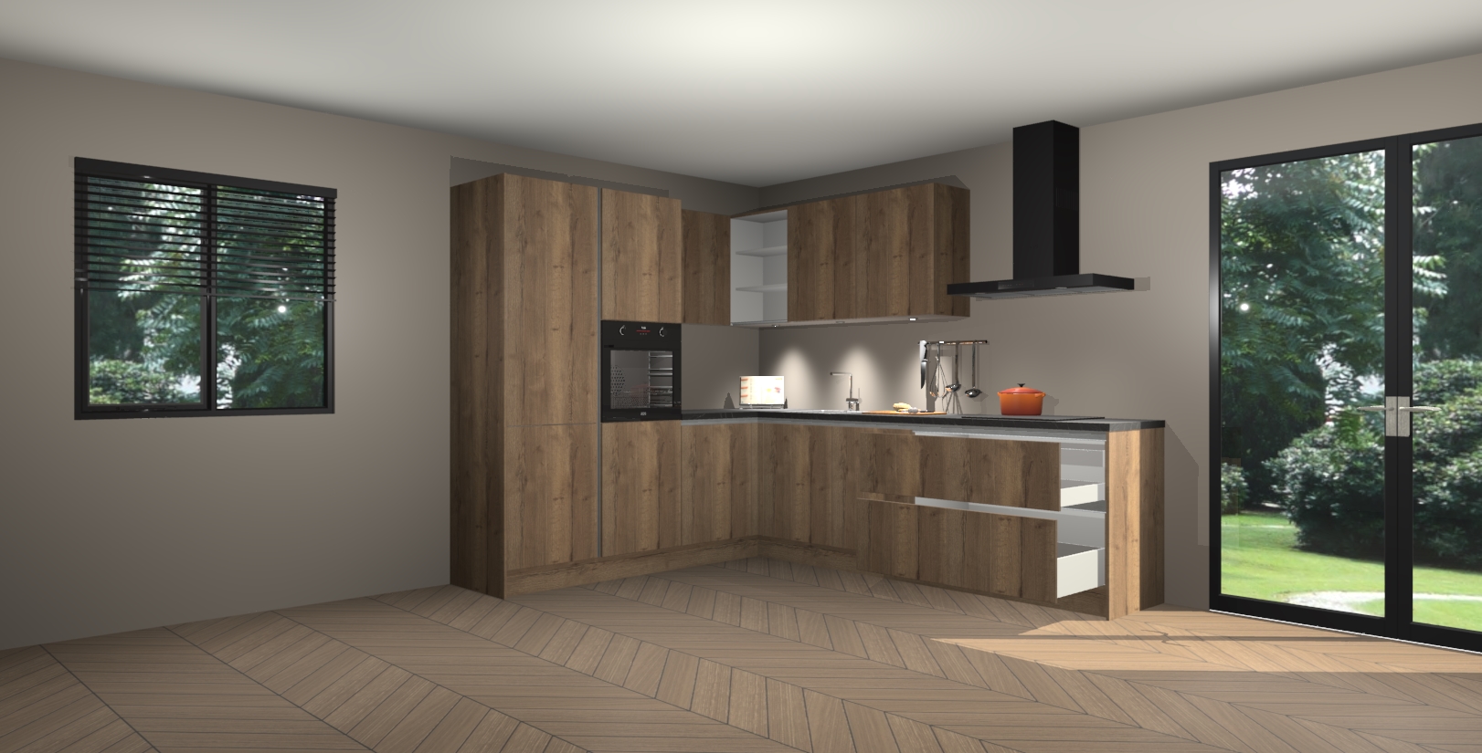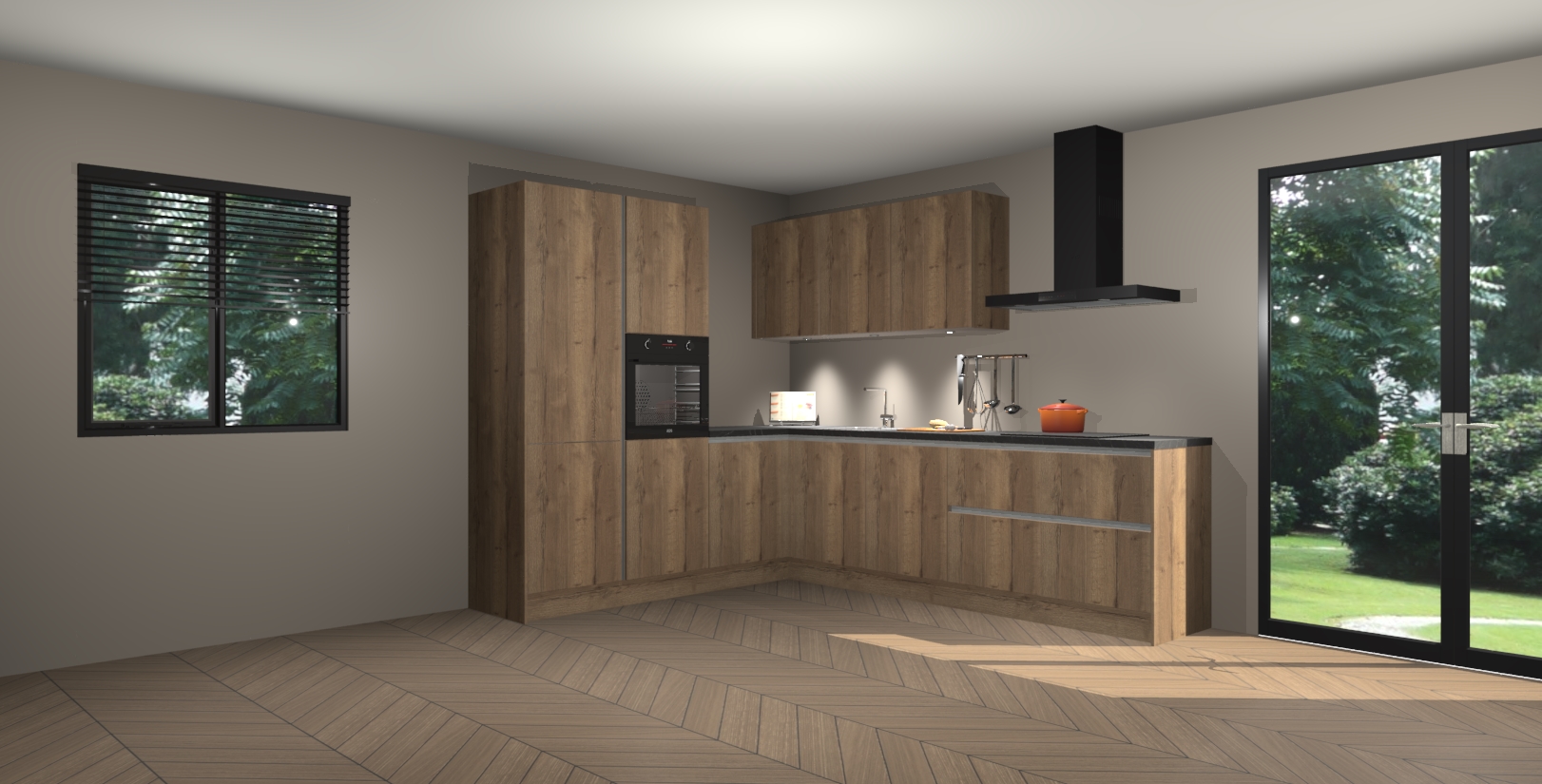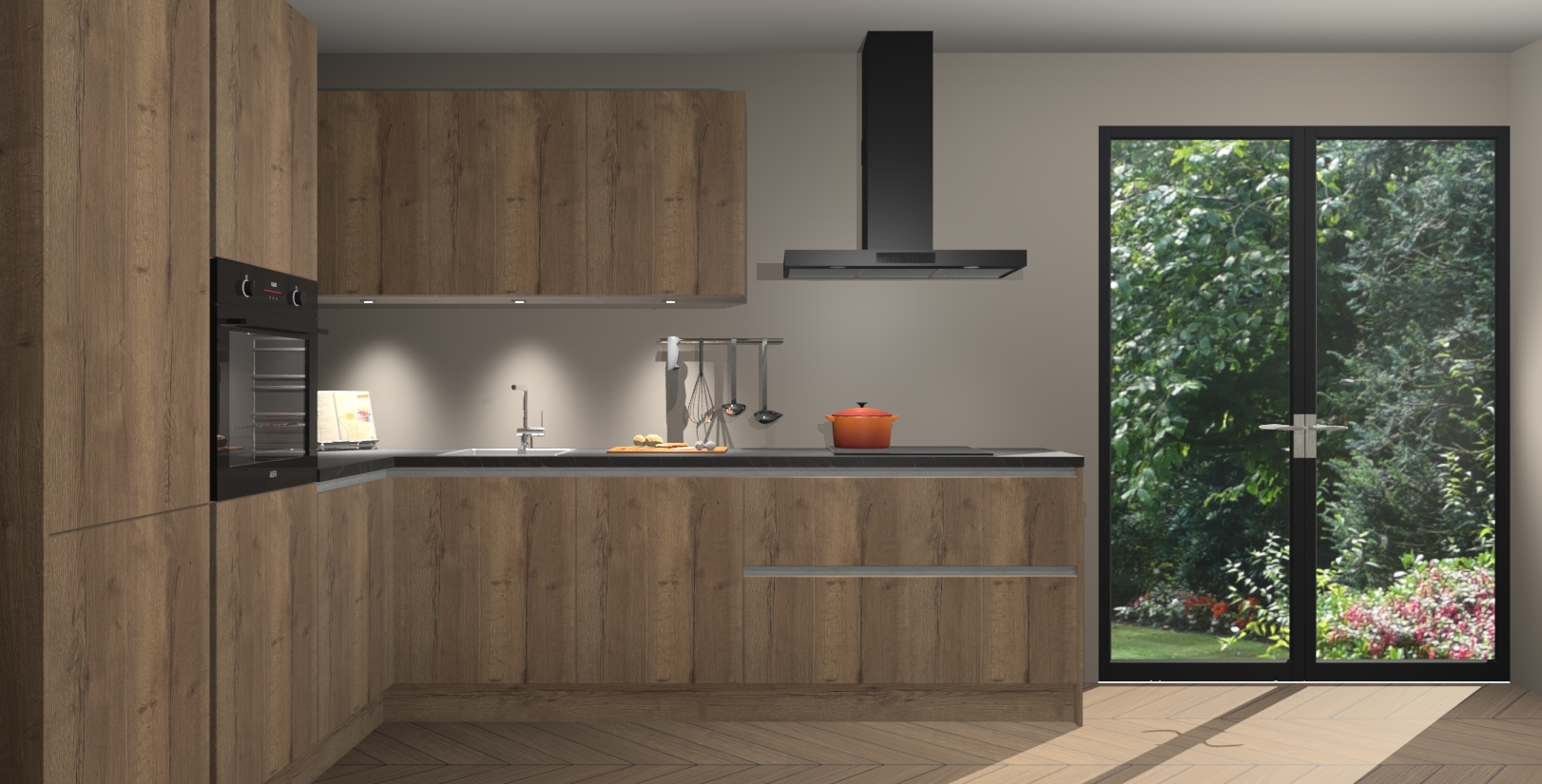 Maak kennis met de chocolade eiken greeploze keuken Parla - de perfecte aanvulling voor uw moderne keuken! Ervaar tijdloos design, elegantie en een chique uitstraling met onze zwarte handgrepen, soft-close deuren en veel opbergruimte. Dit alles wordt aangeboden tegen een vaste lage prijs voor ongeëvenaarde Duitse keukenkwaliteit!