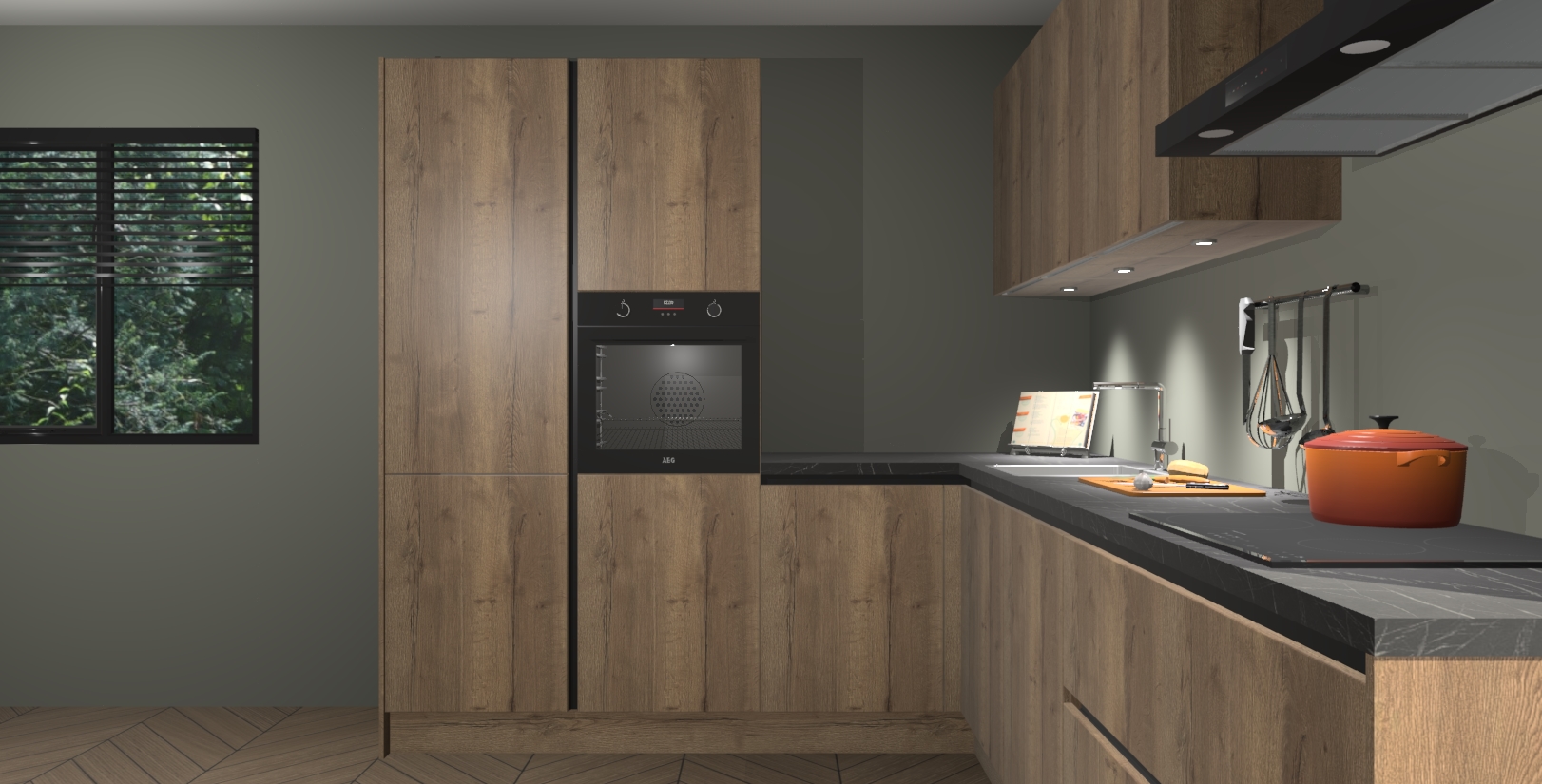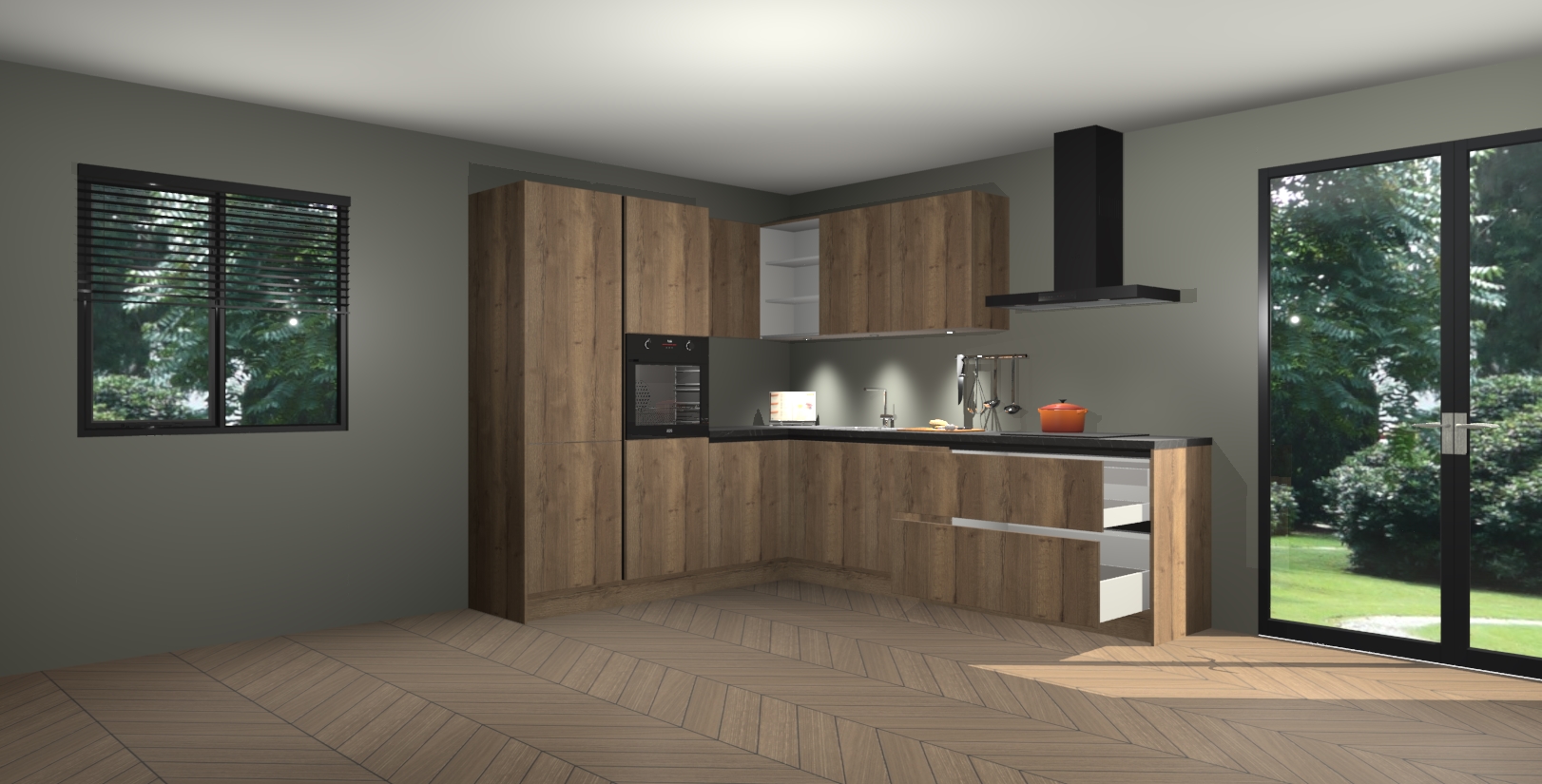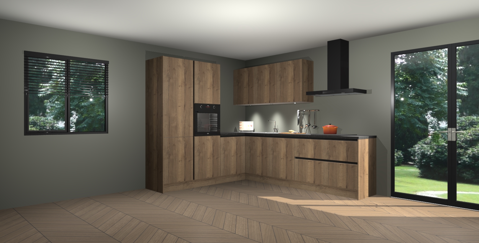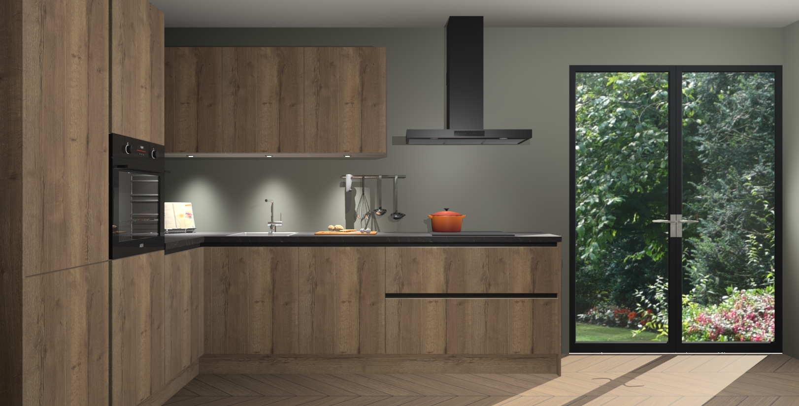 Maak kennis met de chocolade eiken greeploze keuken Parla - de perfecte aanvulling voor uw moderne keuken! Ervaar tijdloos design, elegantie en een chique uitstraling met onze zwarte handgrepen, soft-close deuren en veel opbergruimte. Dit alles wordt aangeboden tegen een vaste lage prijs voor ongeëvenaarde Duitse keukenkwaliteit!