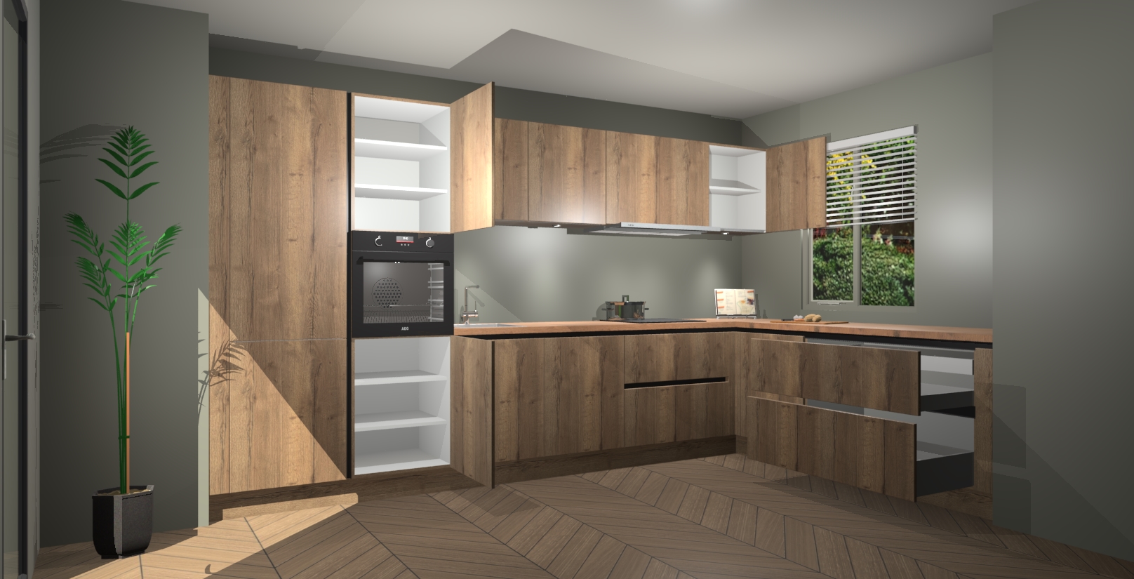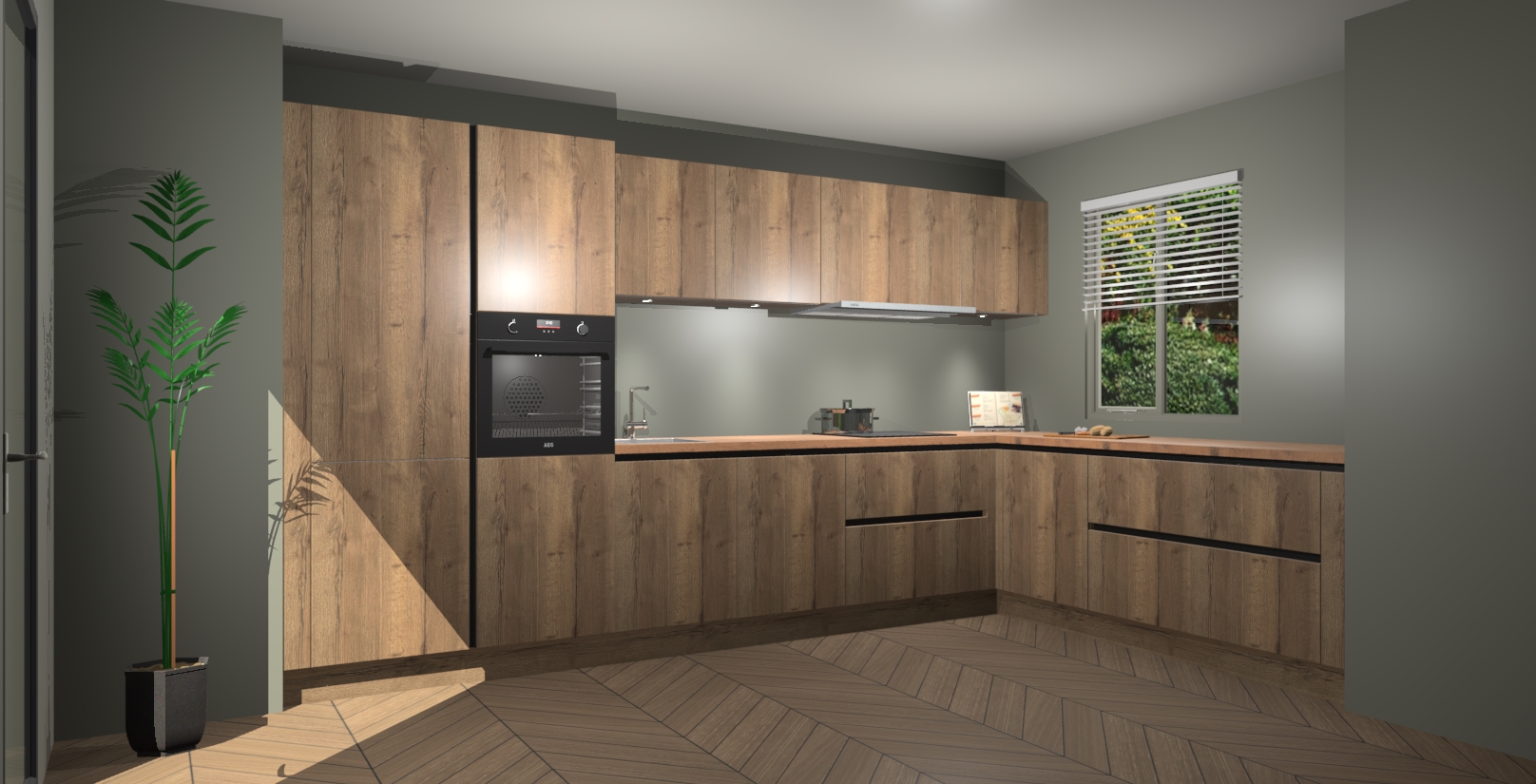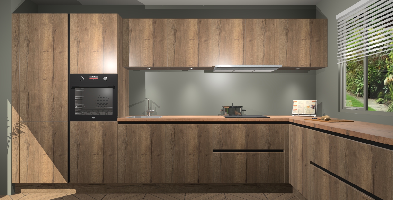 Verwelkom de natuurlijke warmte van de Chocolade Eiken greeploze keuken Petten in uw huis. Deze prachtige hoekkeuken met zijn moderne design en warme houten look geeft u meer dan genoeg opbergruimte om uw comfortabel te voelen in uw keuken. Geniet van soft-close deuren die al uw gasten het gevoel zullen geven dat ze zich in een luxueuze ruimte bevinden.