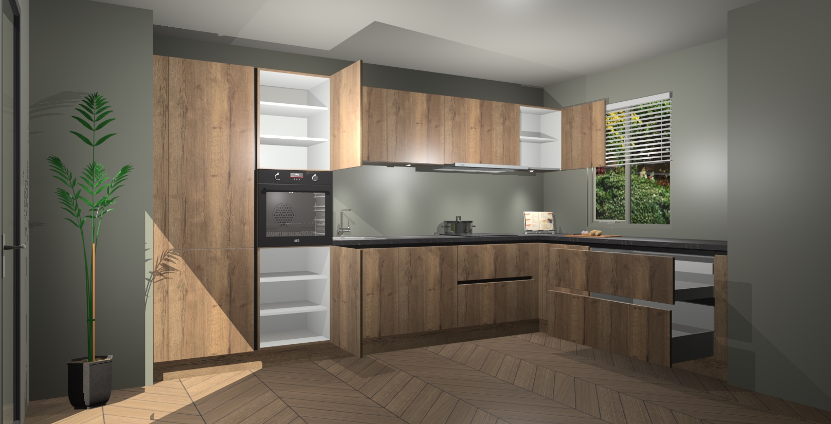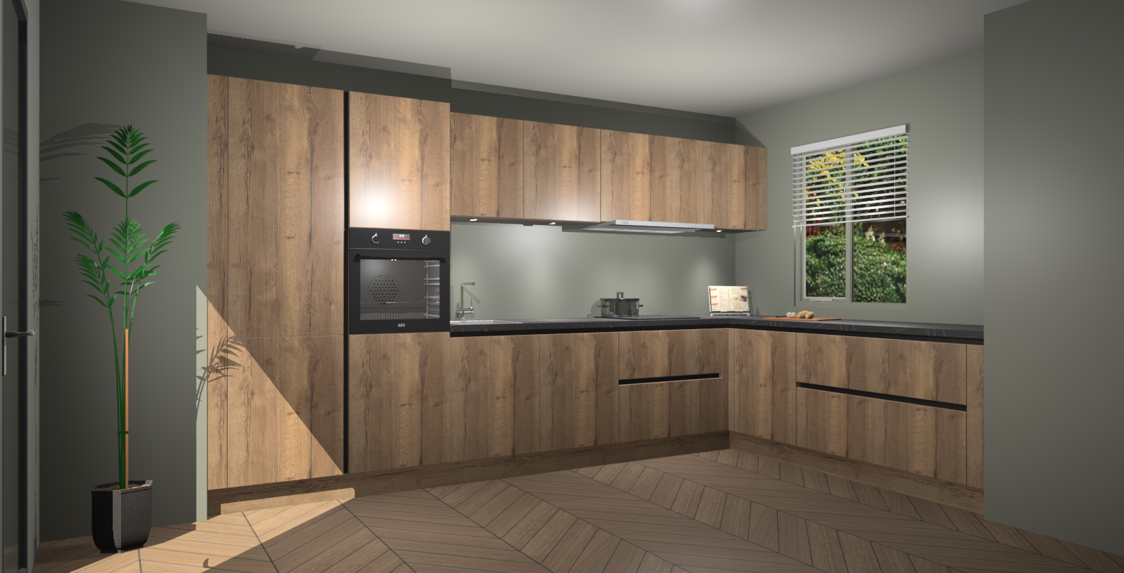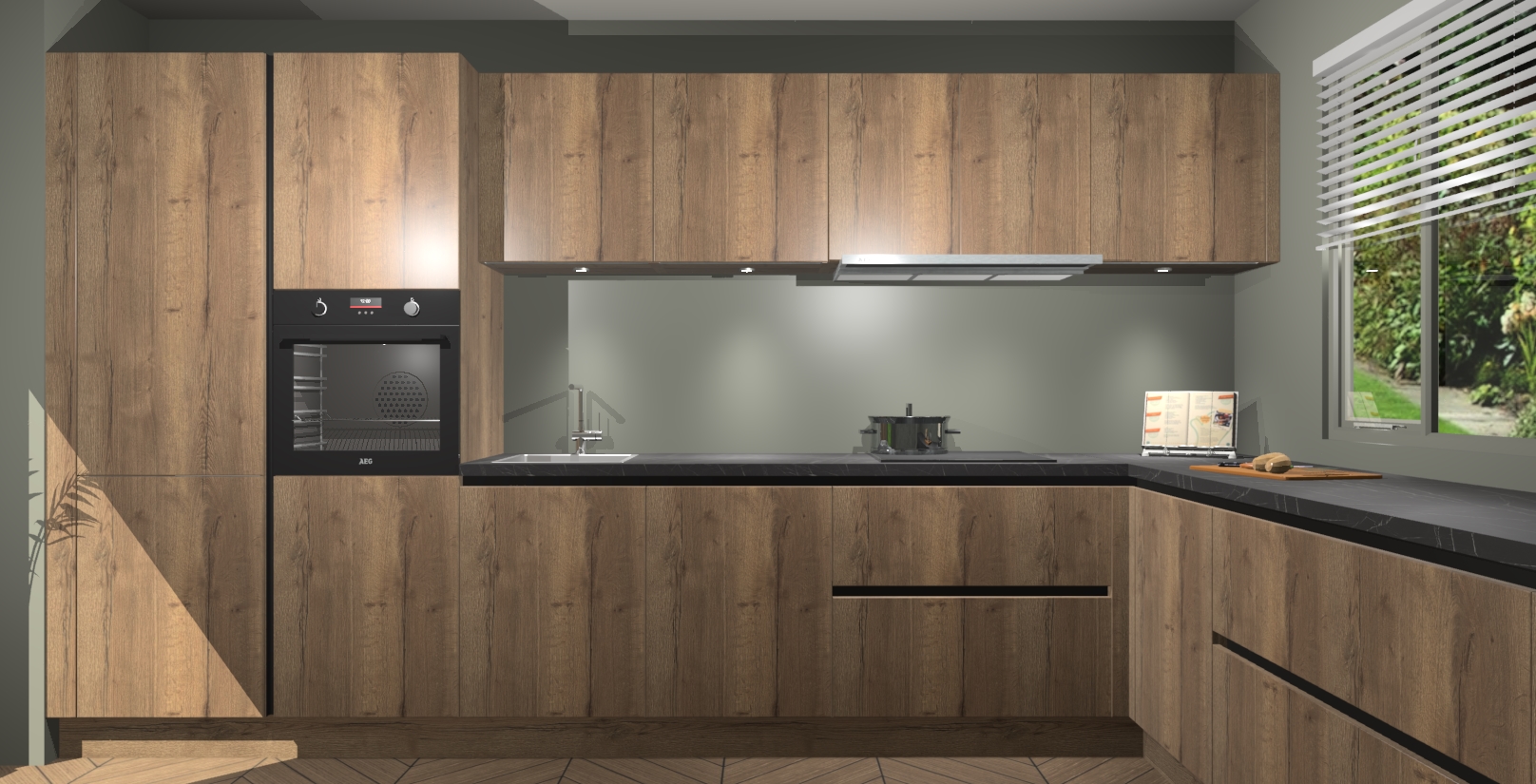 Verwelkom de natuurlijke warmte van de Chocolade Eiken greeploze keuken Petten in uw huis. Deze prachtige hoekkeuken met zijn moderne design en warme houten look geeft u meer dan genoeg opbergruimte om uw comfortabel te voelen in uw keuken. Geniet van soft-close deuren die al uw gasten het gevoel zullen geven dat ze zich in een luxueuze ruimte bevinden.