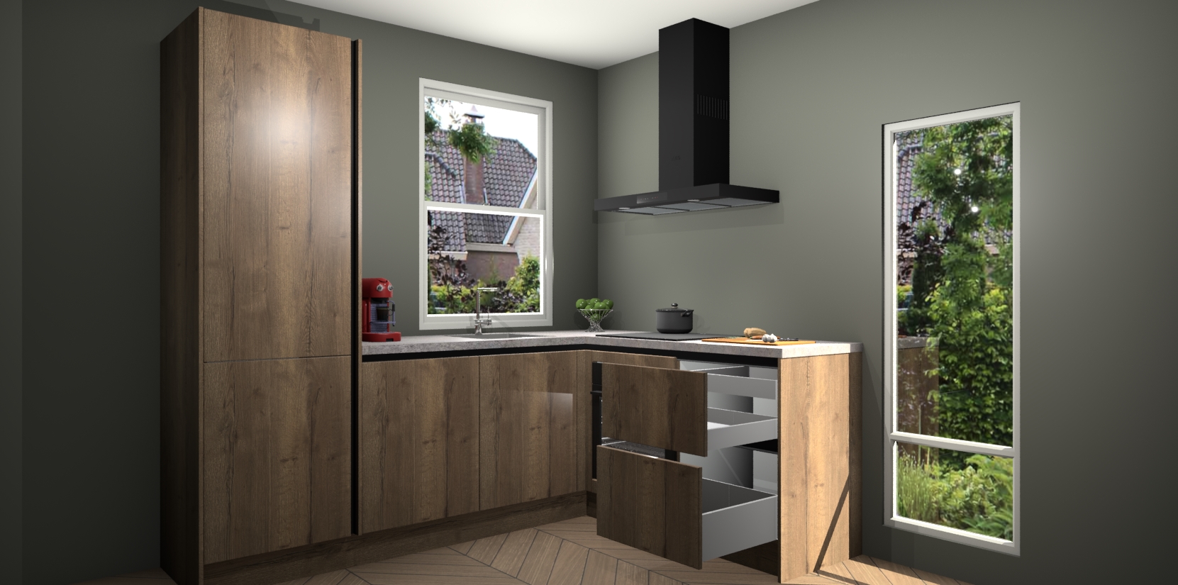 De prachtige Chocolade Eiken greeploze keuken Phuket is de perfecte keuze als u op zoek bent naar een moderne hoekkeuken met alle luxe en comfort die u kunt verwachten! De uitstraling in het houtlook-design draagt bij aan de warme sfeer die u nu al voelt wanneer u er naar kijkt. Heeft u genoeg van ouderwetse keukens? Probeer dan direct deze moderne, mooie hoekkeukens en laat iedereen verbluft achter!