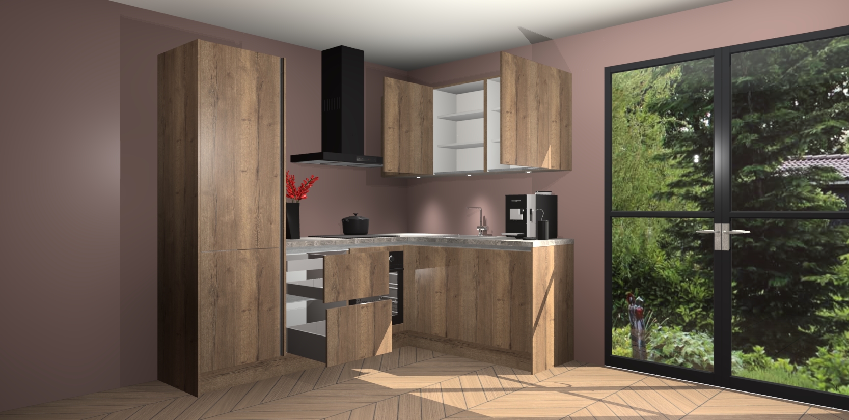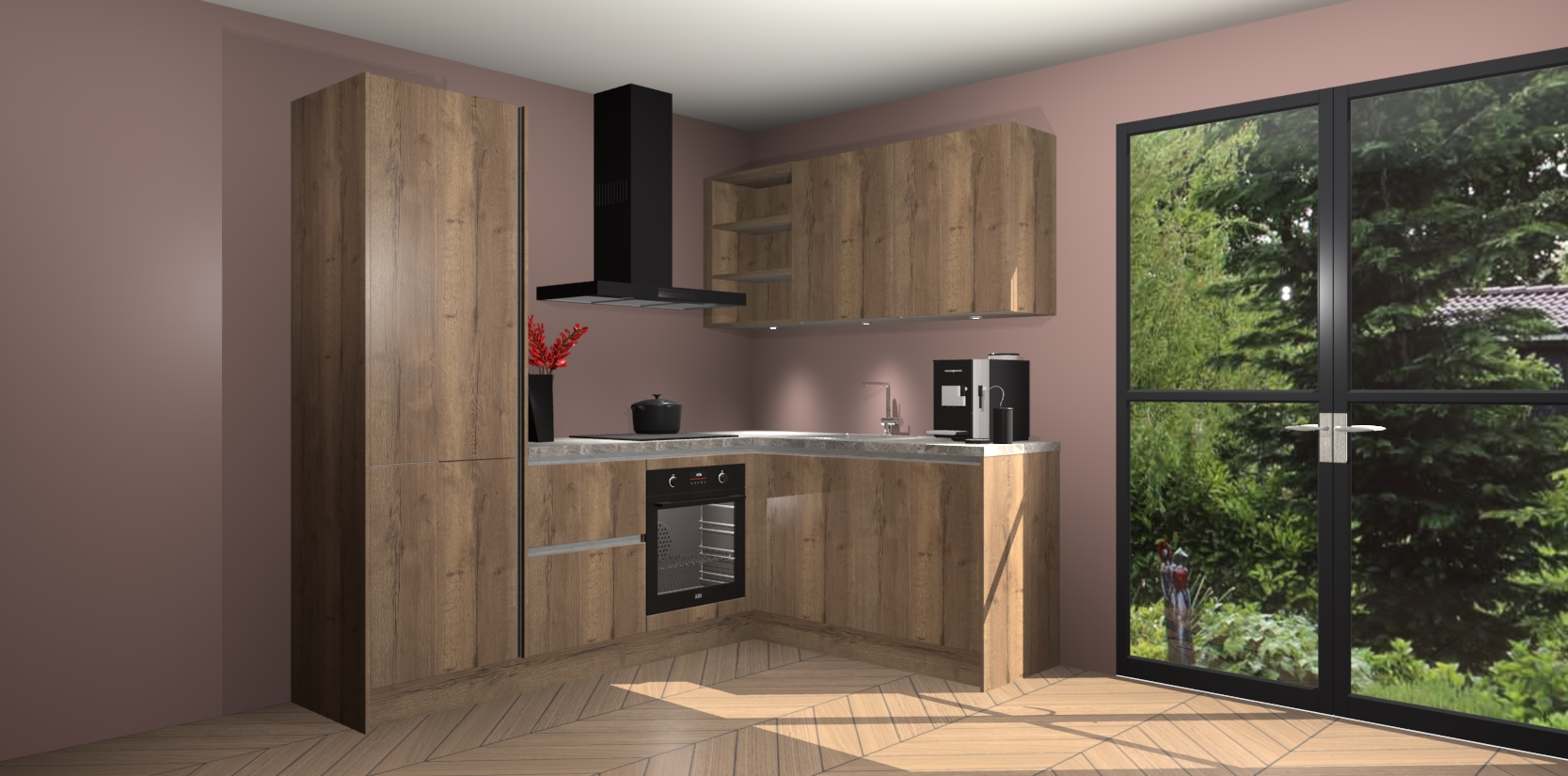 Wauw, dit is de Chocolade Eiken greeploze keuken Pilsen! U kunt gerust zeggen dat u elegantie combineert met functionaliteit met deze keuken. Met een modern en chique ontwerp is de keuken precies wat u nodig heeft om uw ruimte te verfraaien. De binnenzijde van de kasten is in dezelfde donkere kleur als de buitenzijde voor een uniforme look, compleet met softclose-kasten die stil sluiten.