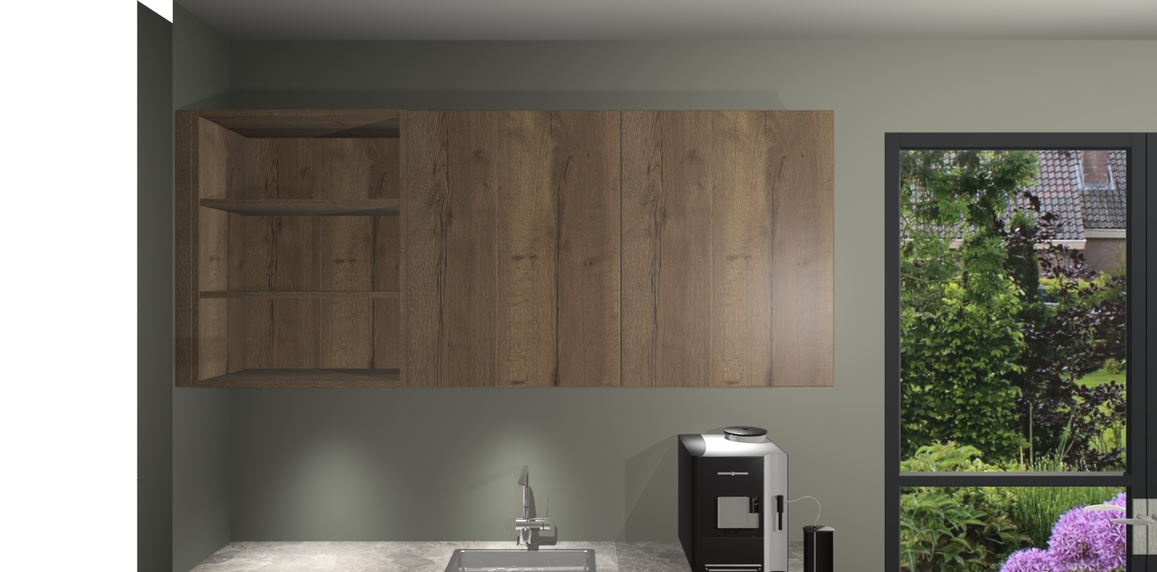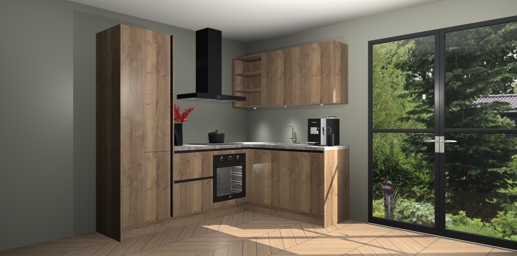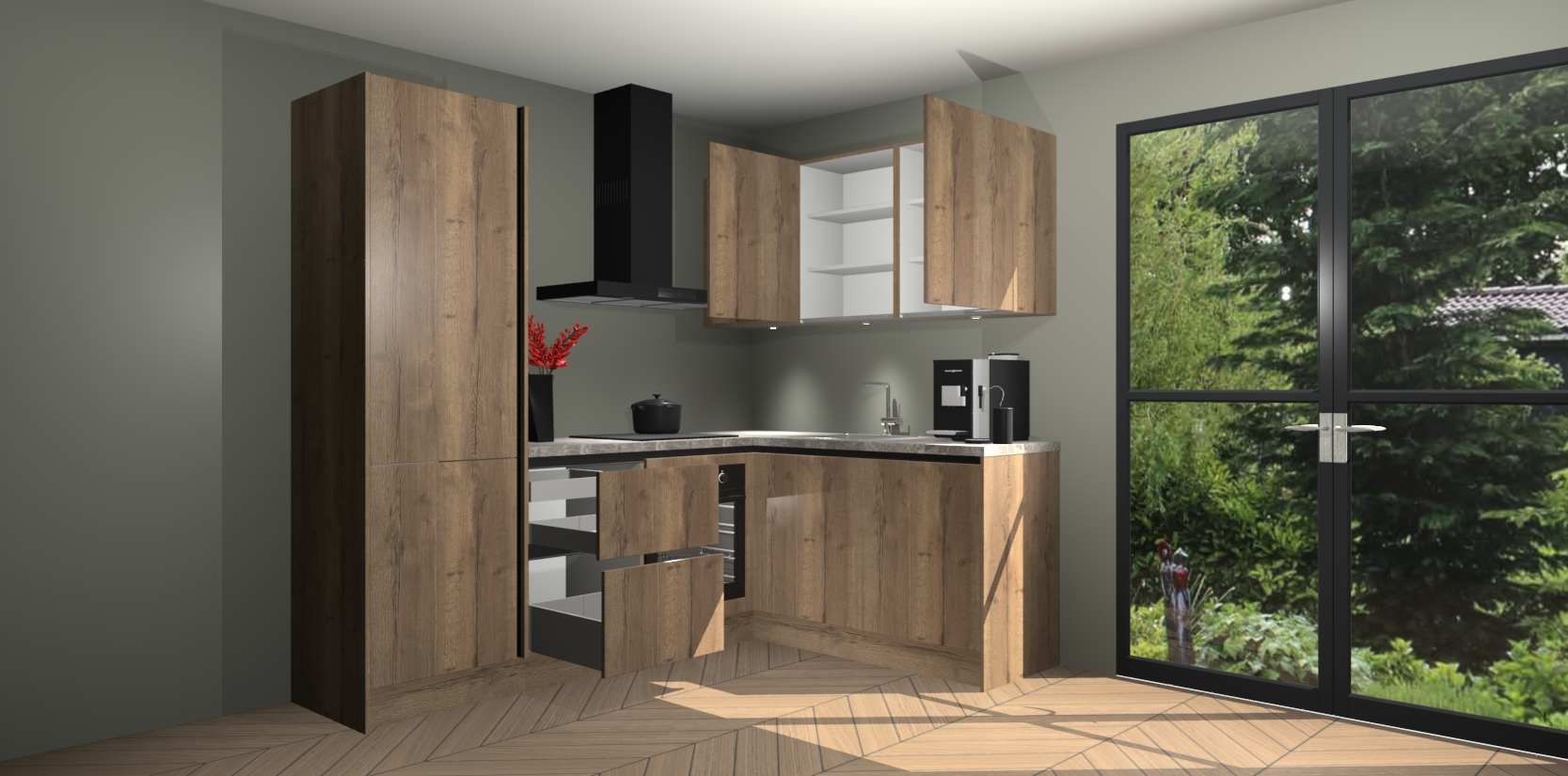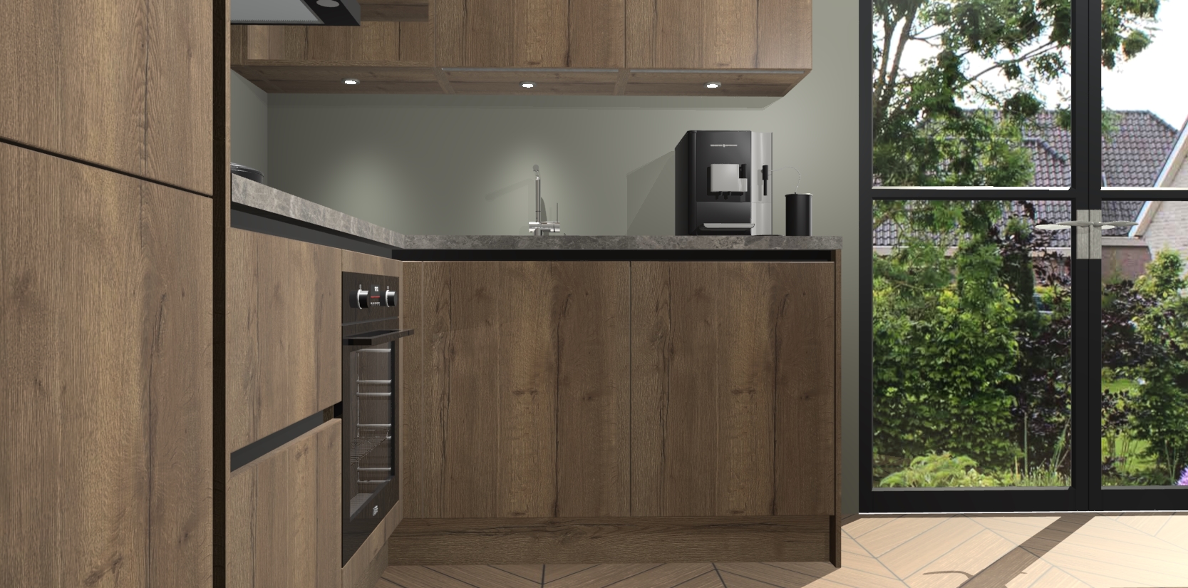 Wauw, dit is de Chocolade Eiken greeploze keuken Pilsen! U kunt gerust zeggen dat u elegantie combineert met functionaliteit met deze keuken. Met een modern en chique ontwerp is de keuken precies wat u nodig heeft om uw ruimte te verfraaien. De binnenzijde van de kasten is in dezelfde donkere kleur als de buitenzijde voor een uniforme look, compleet met softclose-kasten die stil sluiten.
