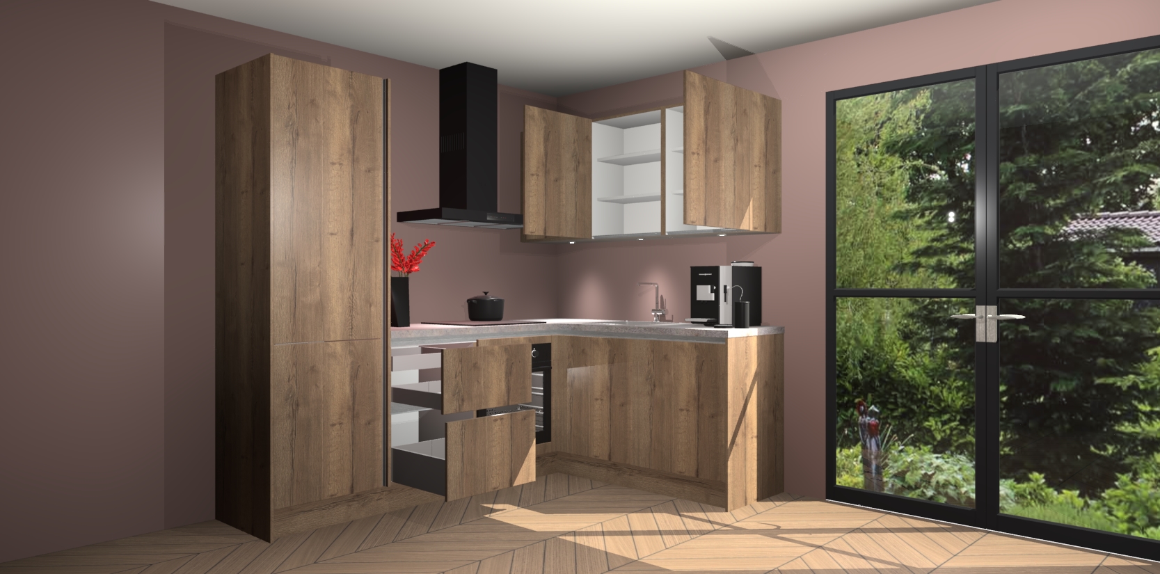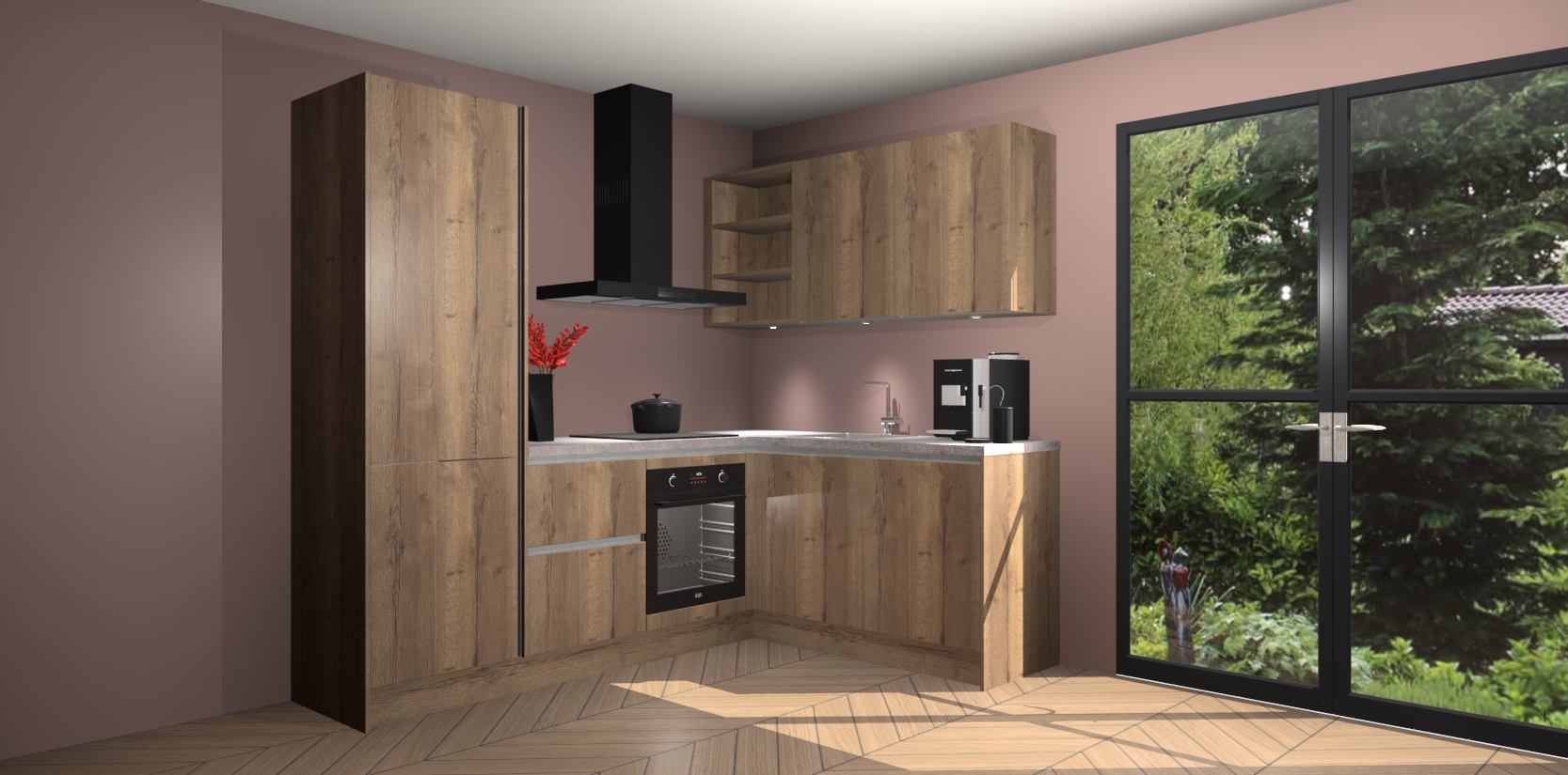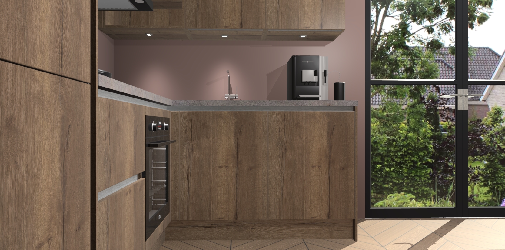 Wauw, dit is de Chocolade Eiken greeploze keuken Pilsen! U kunt gerust zeggen dat u elegantie combineert met functionaliteit met deze keuken. Met een modern en chique ontwerp is de keuken precies wat u nodig heeft om uw ruimte te verfraaien. De binnenzijde van de kasten is in dezelfde donkere kleur als de buitenzijde voor een uniforme look, compleet met softclose-kasten die stil sluiten.