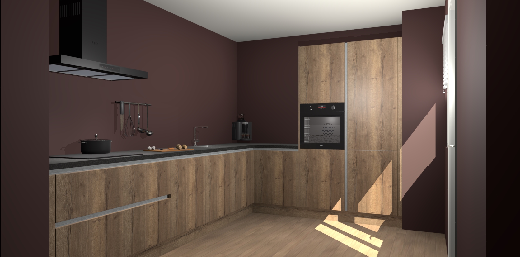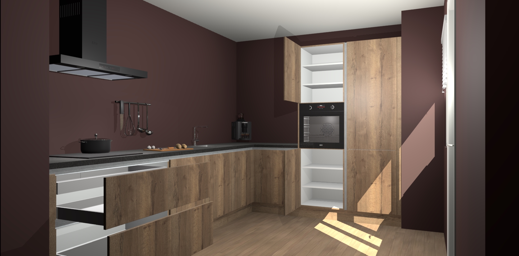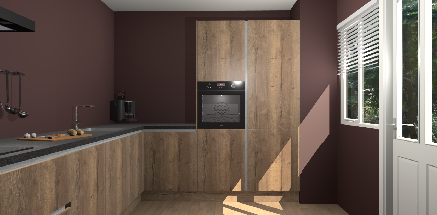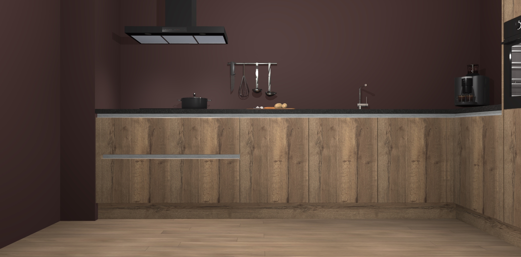 Welkom bij de Chocolade Eiken greeploze keuken Portland. Deze prachtige keuken zal de komende jaren het middelpunt van de belangstelling in uw huis zijn. Uitgerust met vijf inbouwapparaten komt u nooit kookgereedschap tekort. Bovendien geeft de warme houtlook elke ruimte een uitnodigende en tijdloze uitstraling.