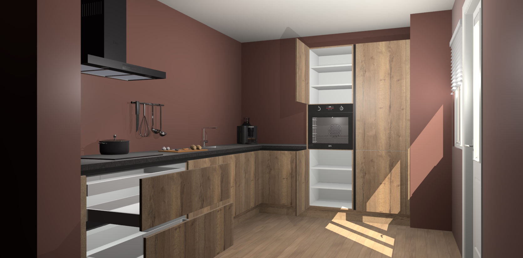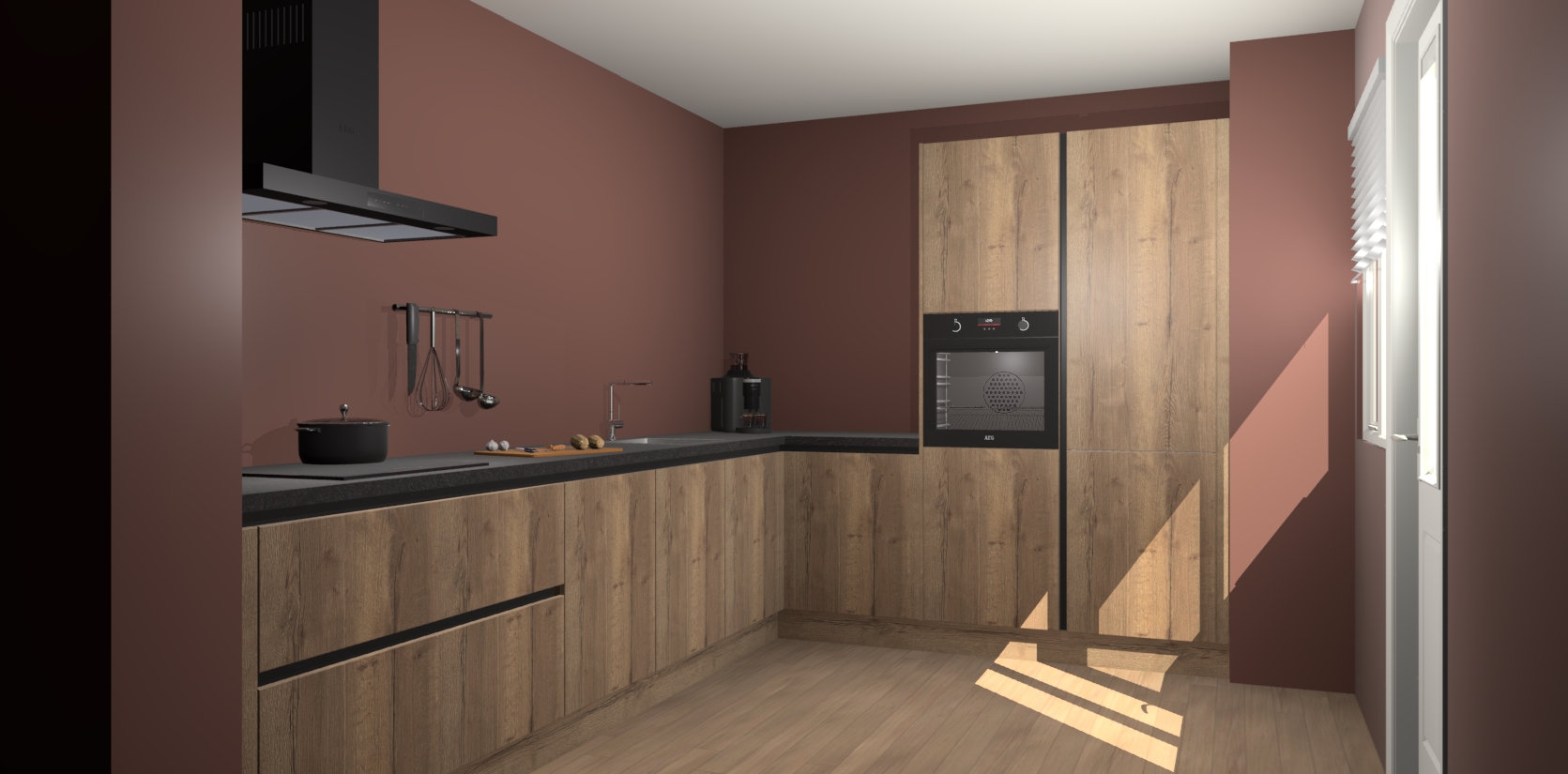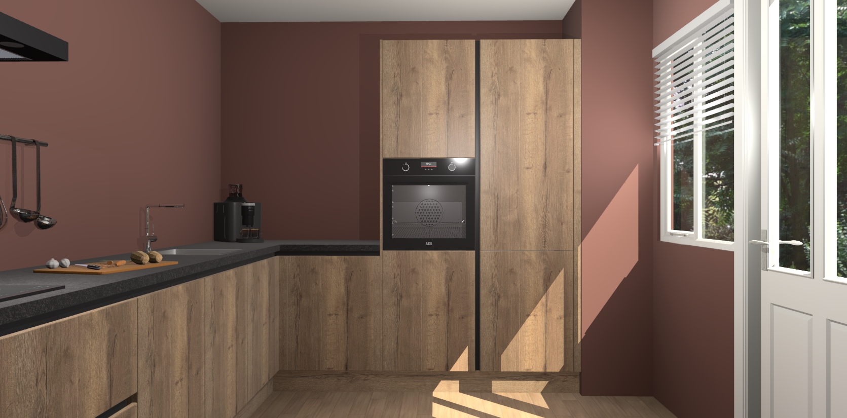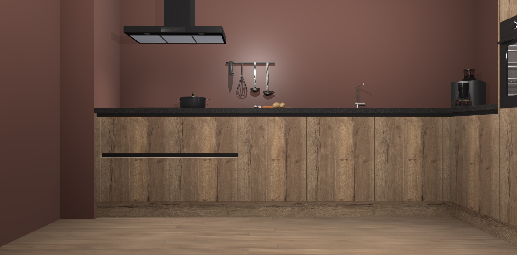 Welkom bij de Chocolade Eiken greeploze keuken Portland. Deze prachtige keuken zal de komende jaren het middelpunt van de belangstelling in uw huis zijn. Uitgerust met vijf inbouwapparaten komt u nooit kookgereedschap tekort. Bovendien geeft de warme houtlook elke ruimte een uitnodigende en tijdloze uitstraling.