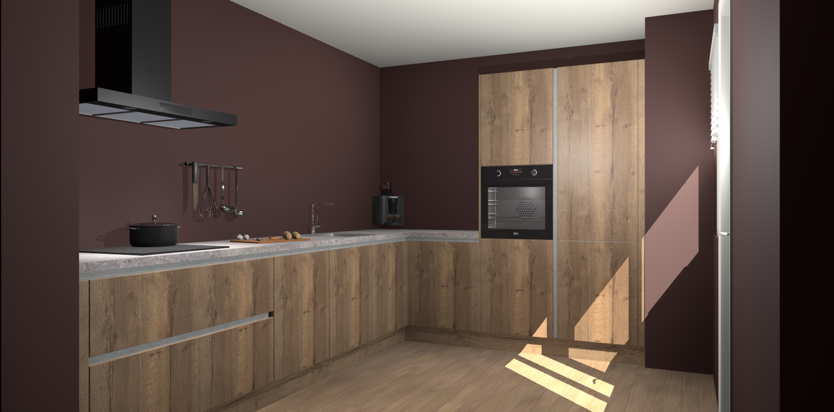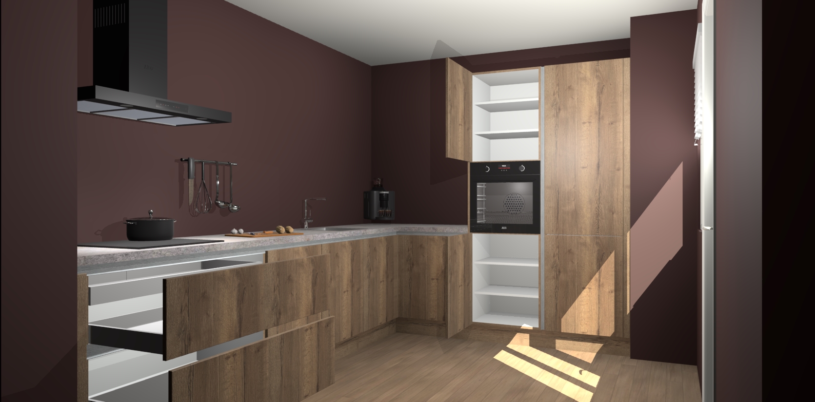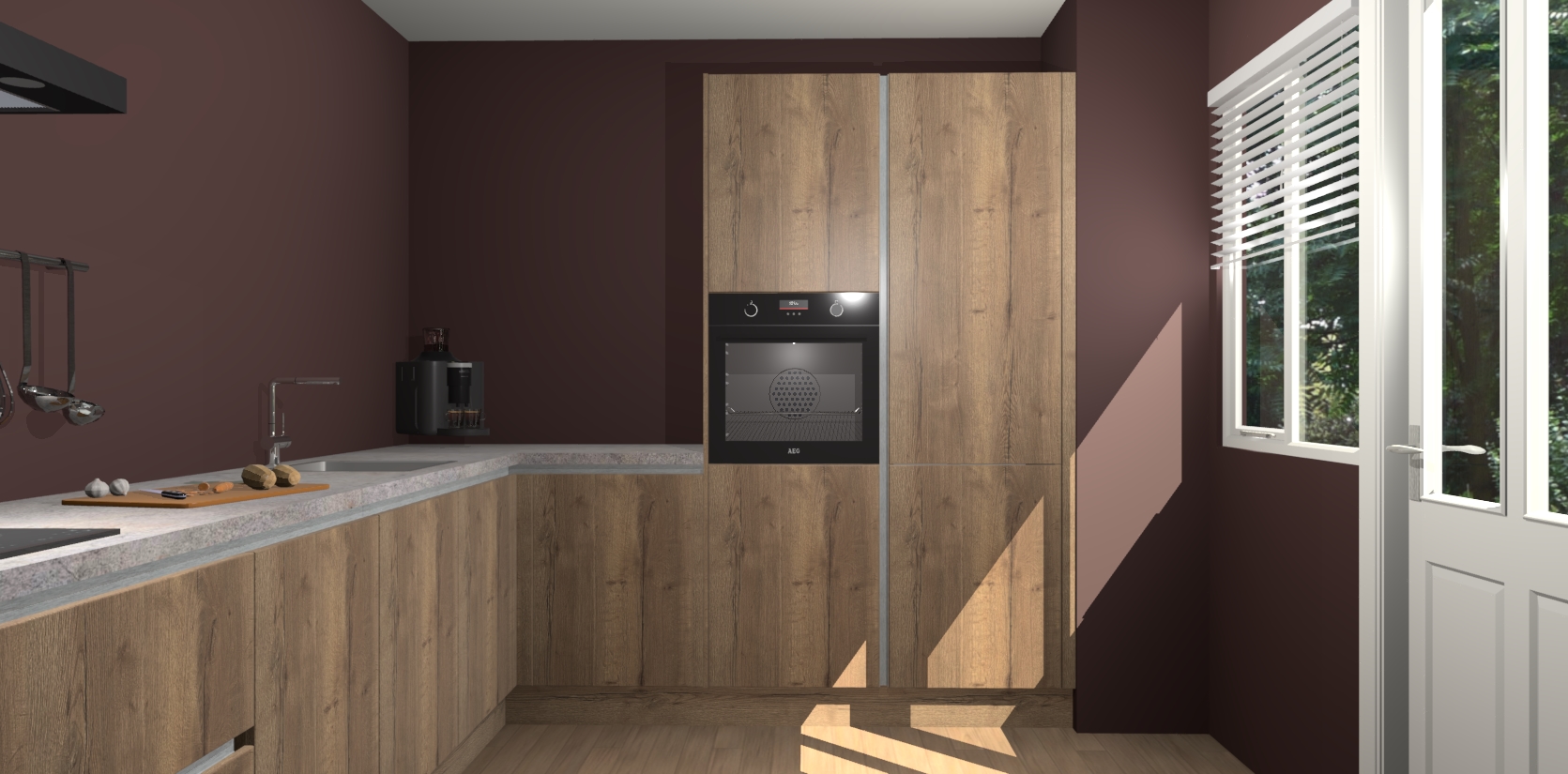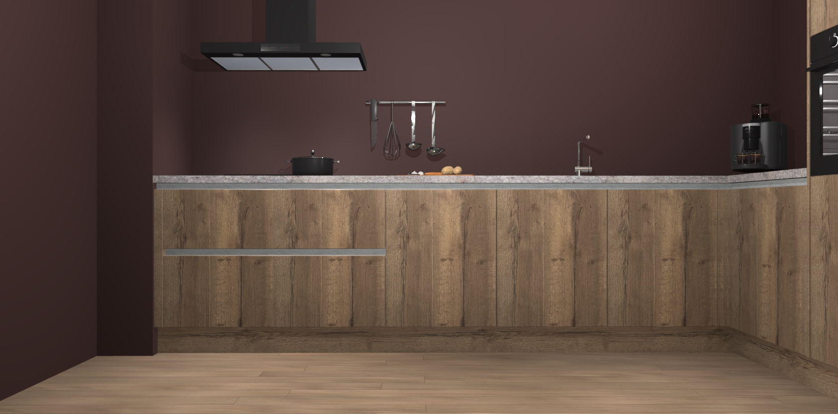Welkom bij de Chocolade Eiken greeploze keuken Portland. Deze prachtige keuken zal de komende jaren het middelpunt van de belangstelling in uw huis zijn. Uitgerust met vijf inbouwapparaten komt u nooit kookgereedschap tekort. Bovendien geeft de warme houtlook elke ruimte een uitnodigende en tijdloze uitstraling.
