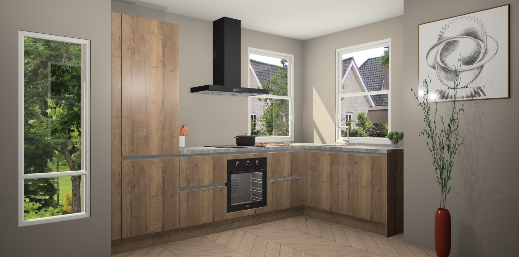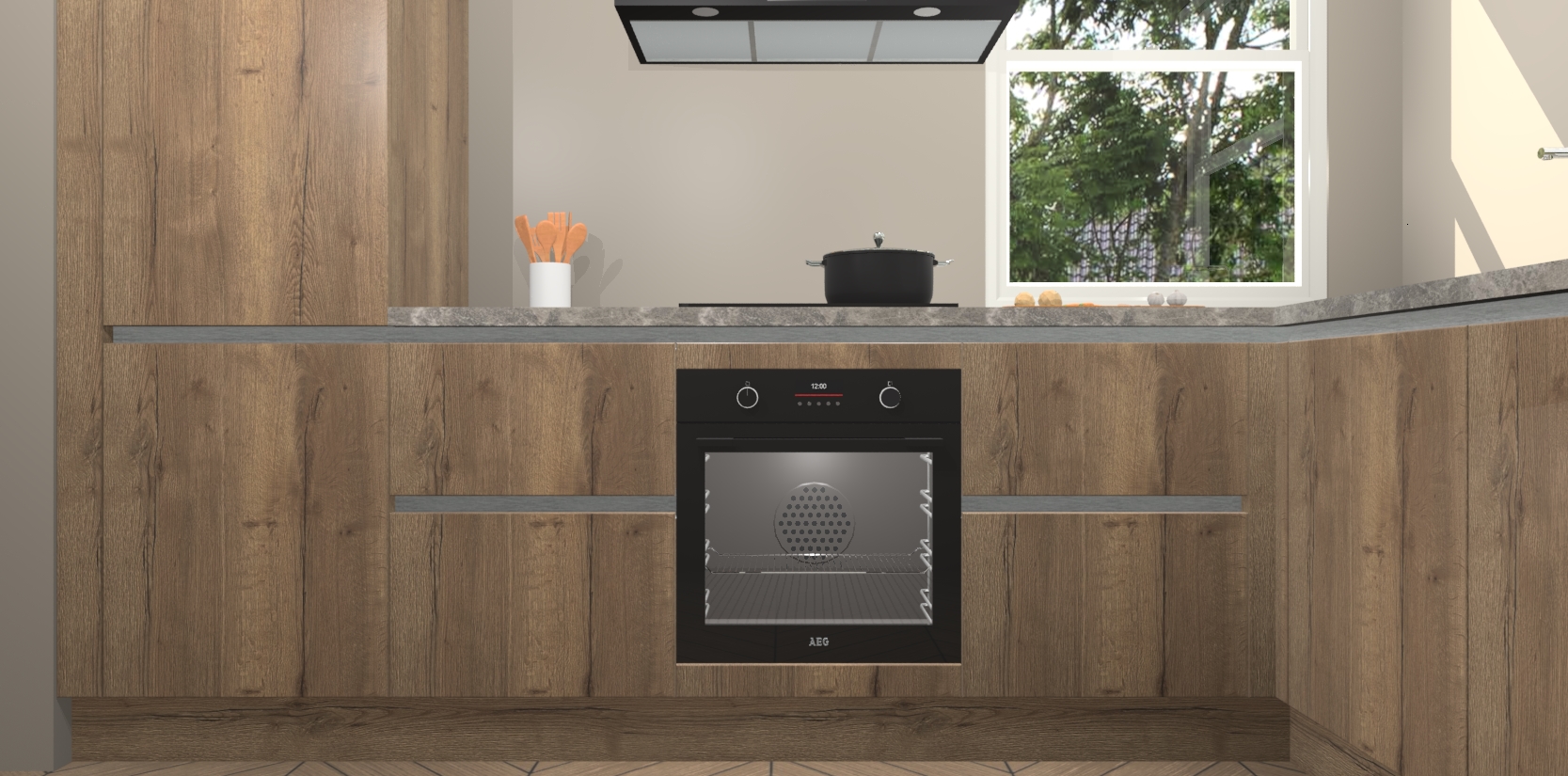 Wat maakt deze keuken zo bijzonder? Ten eerste geeft het houten werkblad uw ruimte een onmiskenbaar klassieke uitstraling. De natuurlijke afwerking roept warmte en elegantie op die nooit uit de mode zullen raken. Bovendien is het gemakkelijk schoon te houden en te onderhouden, zodat je er jarenlang plezier van kunt hebben. Als u op zoek bent naar extra gemak in uw keuken, dan heeft u bij het plaatsen van een bestelling bij ons ook de optie om uw toestellen te upgraden naar AEG-modellen - zo haalt u moderne innovatie van topmerken in apparatentechnologie rechtstreeks in huis.