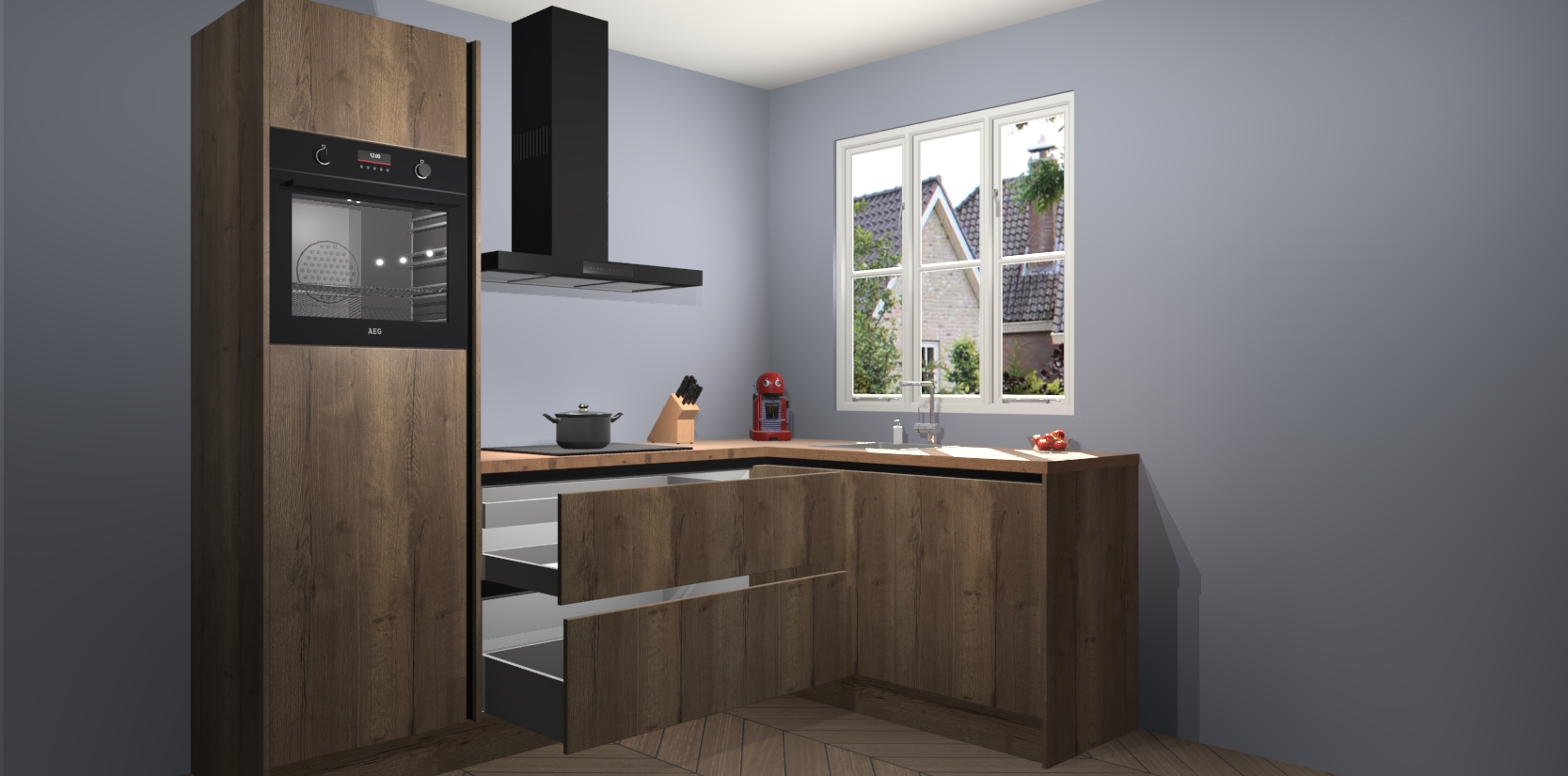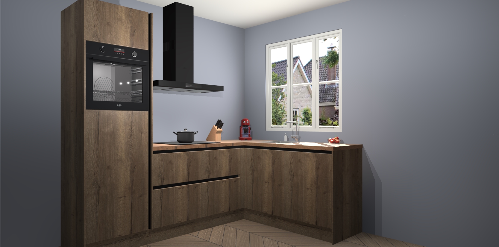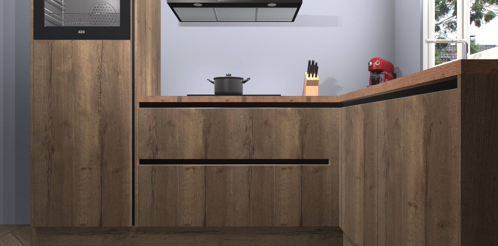 Dit model biedt u voldoende opbergruimte en vijf ingebouwde apparaten: een oven, inductiekookplaat, afzuigkap, vaatwasser en koelkast. Deze apparaten kunnen gemakkelijk worden geüpgrade naar AEG nadat u besteld heeft. De verschillende laden en kastjes bevatten softclose-deuren waardoor ze gezellig dichtvallen met een geruststellend helemaal geruisloos geluid. En dat is nog niet alles! We garanderen ook dat de prijs altijd laag blijft - dus haal nu uw Chocolade Eiken greeploze keuken Victoria terwijl het kan.