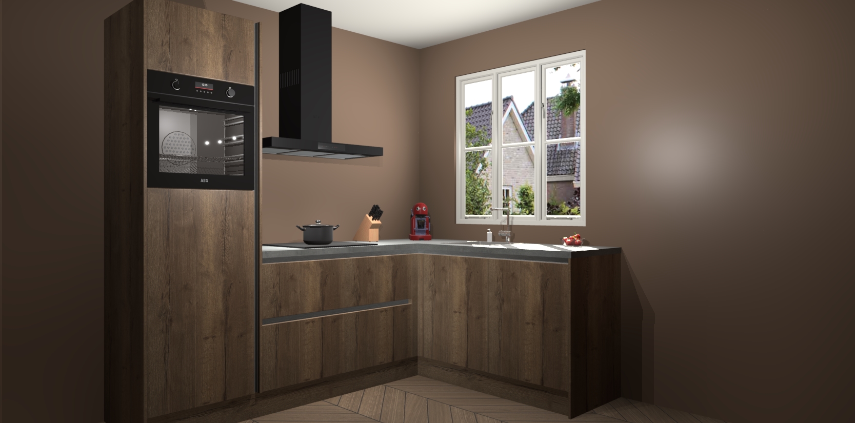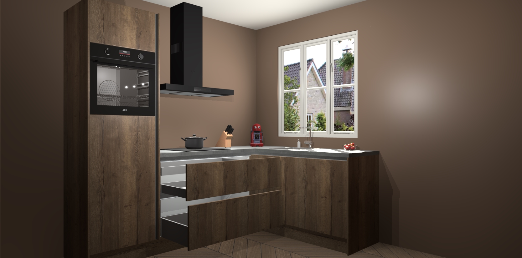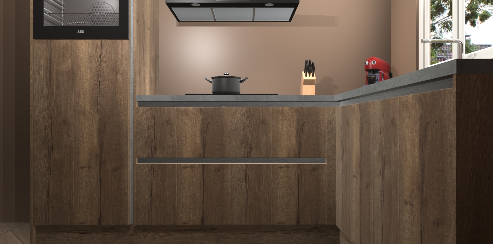 Dit model biedt u voldoende opbergruimte en vijf ingebouwde apparaten: een oven, inductiekookplaat, afzuigkap, vaatwasser en koelkast. Deze apparaten kunnen gemakkelijk worden geüpgrade naar AEG nadat u besteld heeft. De verschillende laden en kastjes bevatten softclose-deuren waardoor ze gezellig dichtvallen met een geruststellend helemaal geruisloos geluid. En dat is nog niet alles! We garanderen ook dat de prijs altijd laag blijft - dus haal nu uw Chocolade Eiken greeploze keuken Victoria terwijl het kan.