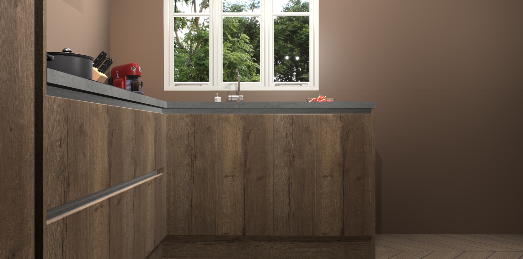 Bestellen was nog nooit zo makkelijk en we leveren met slechts 7 weken; zodra de keuken arriveert staan de kasten voor gemonteerd klaar om er alles aan te doen dat u hem gemakkelijk zelf kunt installeren! Eén ding is zeker: met de Chocolade Eiken greeploze keuken Victoria slaagt u erin modischer, modernere keukens uit te rusten die tientallen jaren meegaan! Haal snel uw Chocolade Eiken greeploze keuken Victoria - of u nu net begint of al 'levenservaring' hebt in de keukendroomloopbaan - want dit topmodel van onze collectie wilt u absoluut niet missen.