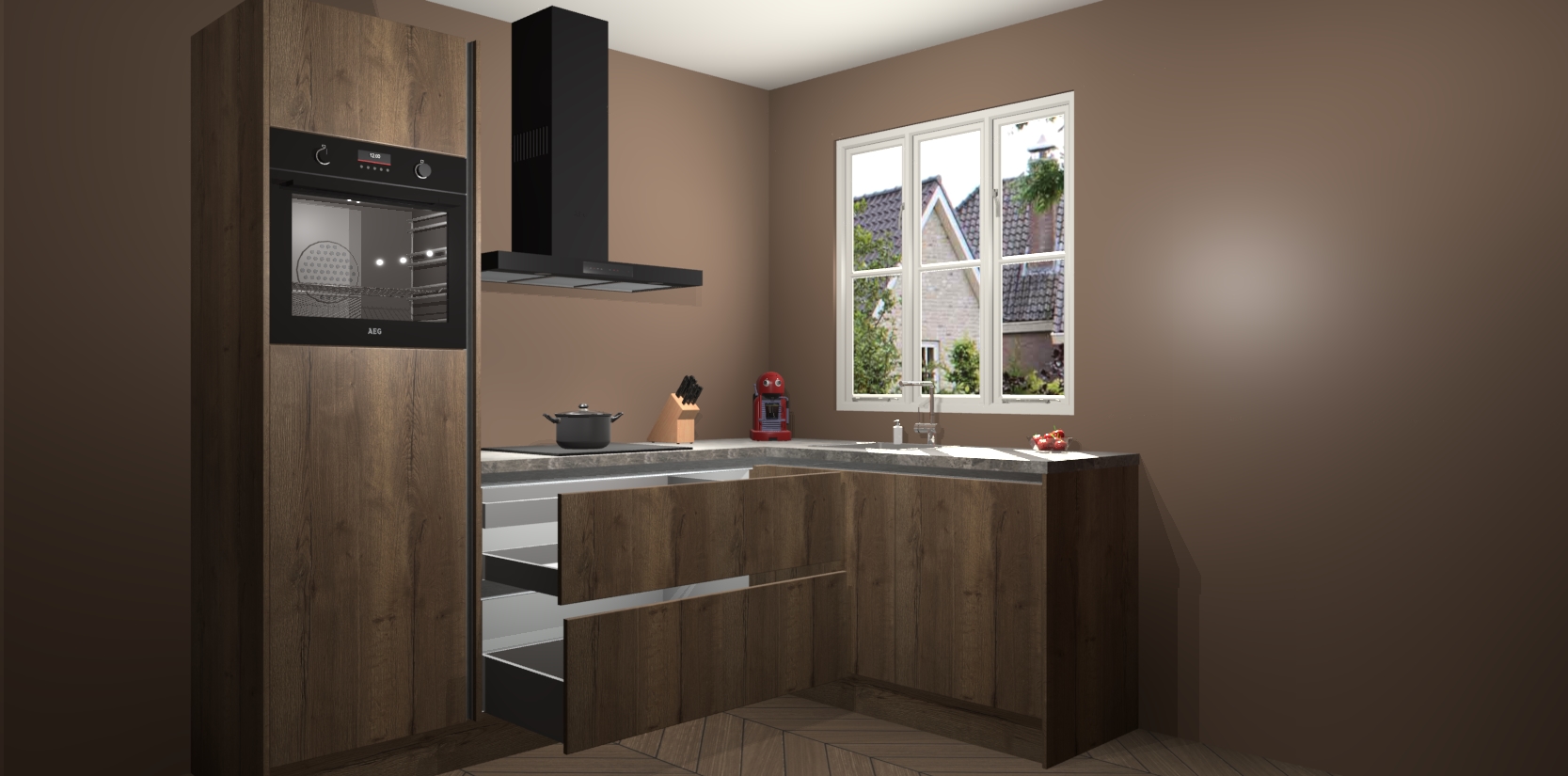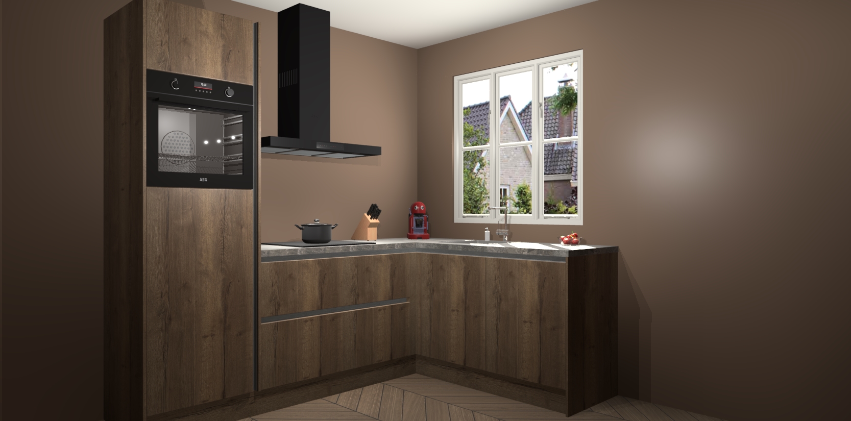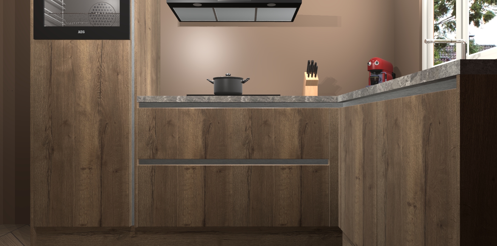 Dit model biedt u voldoende opbergruimte en vijf ingebouwde apparaten: een oven, inductiekookplaat, afzuigkap, vaatwasser en koelkast. Deze apparaten kunnen gemakkelijk worden geüpgrade naar AEG nadat u besteld heeft. De verschillende laden en kastjes bevatten softclose-deuren waardoor ze gezellig dichtvallen met een geruststellend helemaal geruisloos geluid. En dat is nog niet alles! We garanderen ook dat de prijs altijd laag blijft - dus haal nu uw Chocolade Eiken greeploze keuken Victoria terwijl het kan.