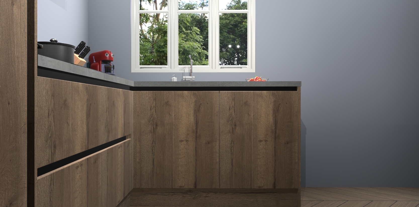 Bestellen was nog nooit zo makkelijk en we leveren met slechts 7 weken; zodra de keuken arriveert staan de kasten voor gemonteerd klaar om er alles aan te doen dat u hem gemakkelijk zelf kunt installeren! Eén ding is zeker: met de Chocolade Eiken greeploze keuken Victoria slaagt u erin modischer, modernere keukens uit te rusten die tientallen jaren meegaan! Haal snel uw Chocolade Eiken greeploze keuken Victoria - of u nu net begint of al 'levenservaring' hebt in de keukendroomloopbaan - want dit topmodel van onze collectie wilt u absoluut niet missen.
