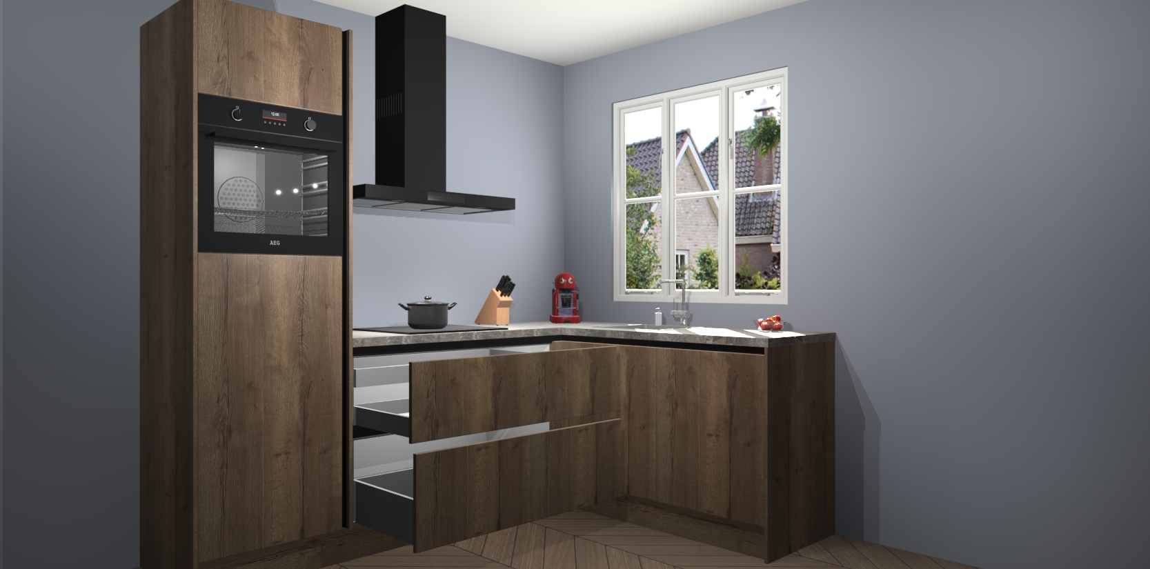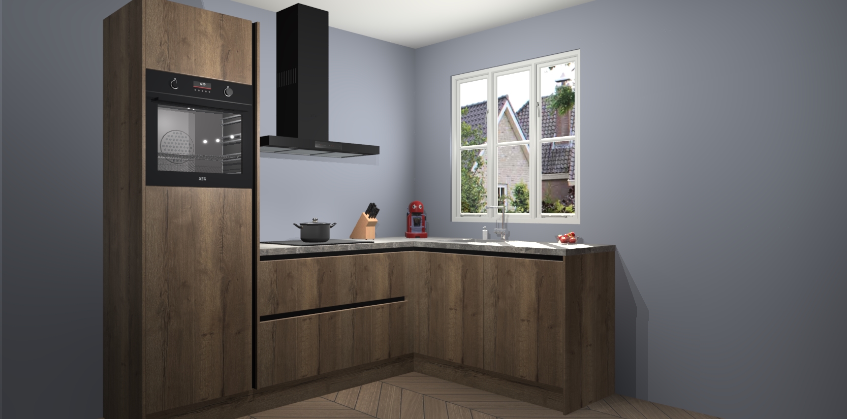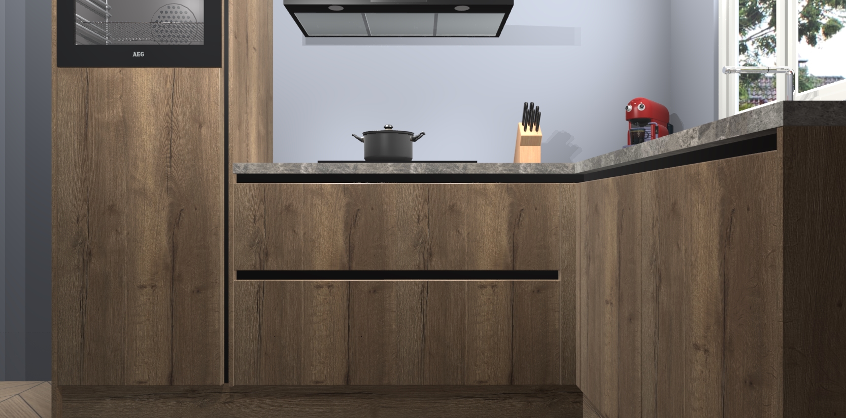 Dit model biedt u voldoende opbergruimte en vijf ingebouwde apparaten: een oven, inductiekookplaat, afzuigkap, vaatwasser en koelkast. Deze apparaten kunnen gemakkelijk worden geüpgrade naar AEG nadat u besteld heeft. De verschillende laden en kastjes bevatten softclose-deuren waardoor ze gezellig dichtvallen met een geruststellend helemaal geruisloos geluid. En dat is nog niet alles! We garanderen ook dat de prijs altijd laag blijft - dus haal nu uw Chocolade Eiken greeploze keuken Victoria terwijl het kan.