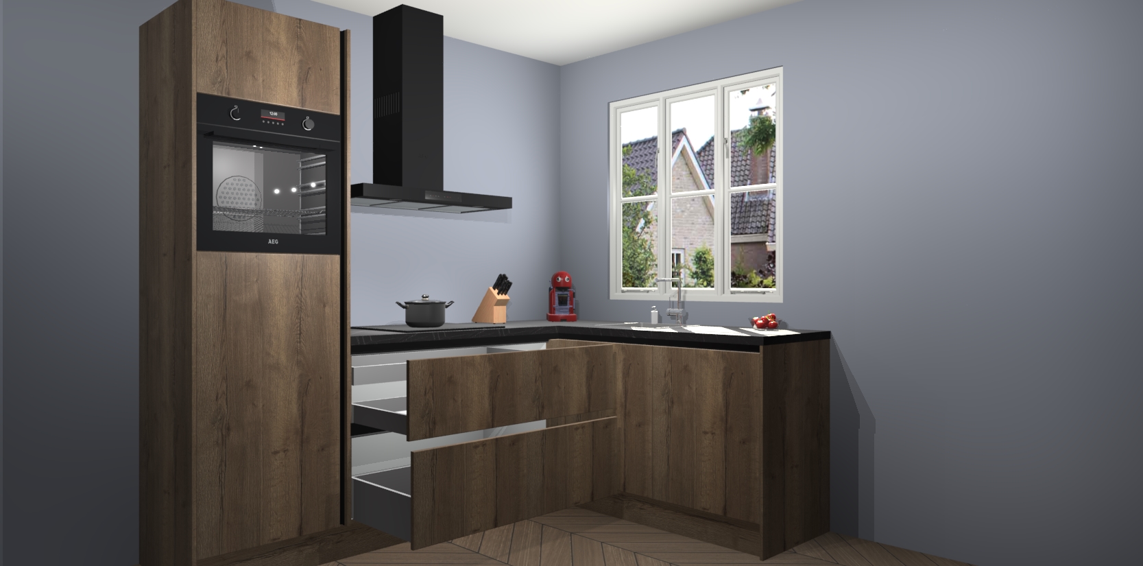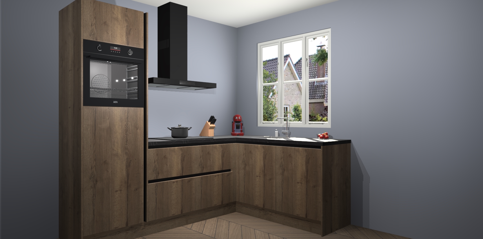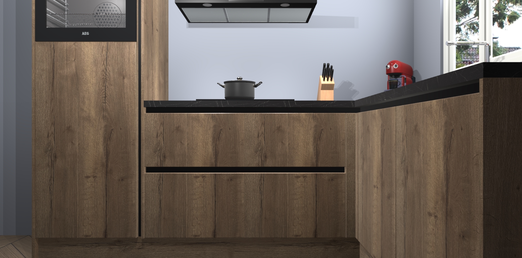 Dit model biedt u voldoende opbergruimte en vijf ingebouwde apparaten: een oven, inductiekookplaat, afzuigkap, vaatwasser en koelkast. Deze apparaten kunnen gemakkelijk worden geüpgrade naar AEG nadat u besteld heeft. De verschillende laden en kastjes bevatten softclose-deuren waardoor ze gezellig dichtvallen met een geruststellend helemaal geruisloos geluid. En dat is nog niet alles! We garanderen ook dat de prijs altijd laag blijft - dus haal nu uw Chocolade Eiken greeploze keuken Victoria terwijl het kan.