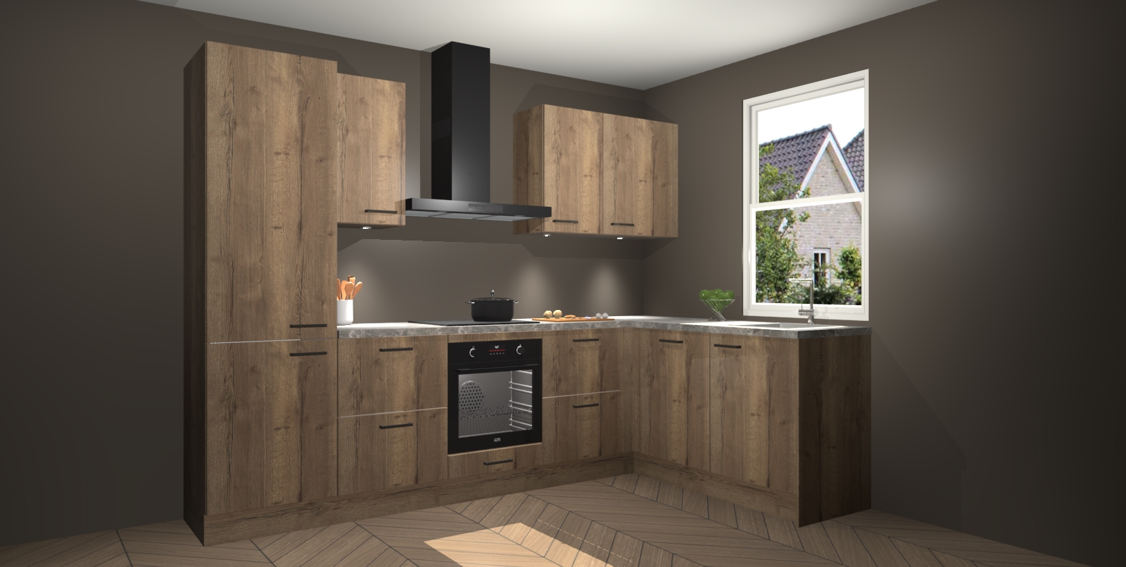 Maak kennis met de trendsettende en luxe Chocolade Eiken keuken Bazel! Deze uitzonderlijke keuken van Duitse kwaliteit is stijlvol, modern en perfect om elk huis mee op te fleuren. De binnenkant van de kasten worden meegenomen in een bijpassende kleur om een samenhangende eigentijdse esthetiek te voltooien. U zult dol zijn op hoe uw pas gerenoveerde keuken eruitziet met de Chocolade Eiken editie!