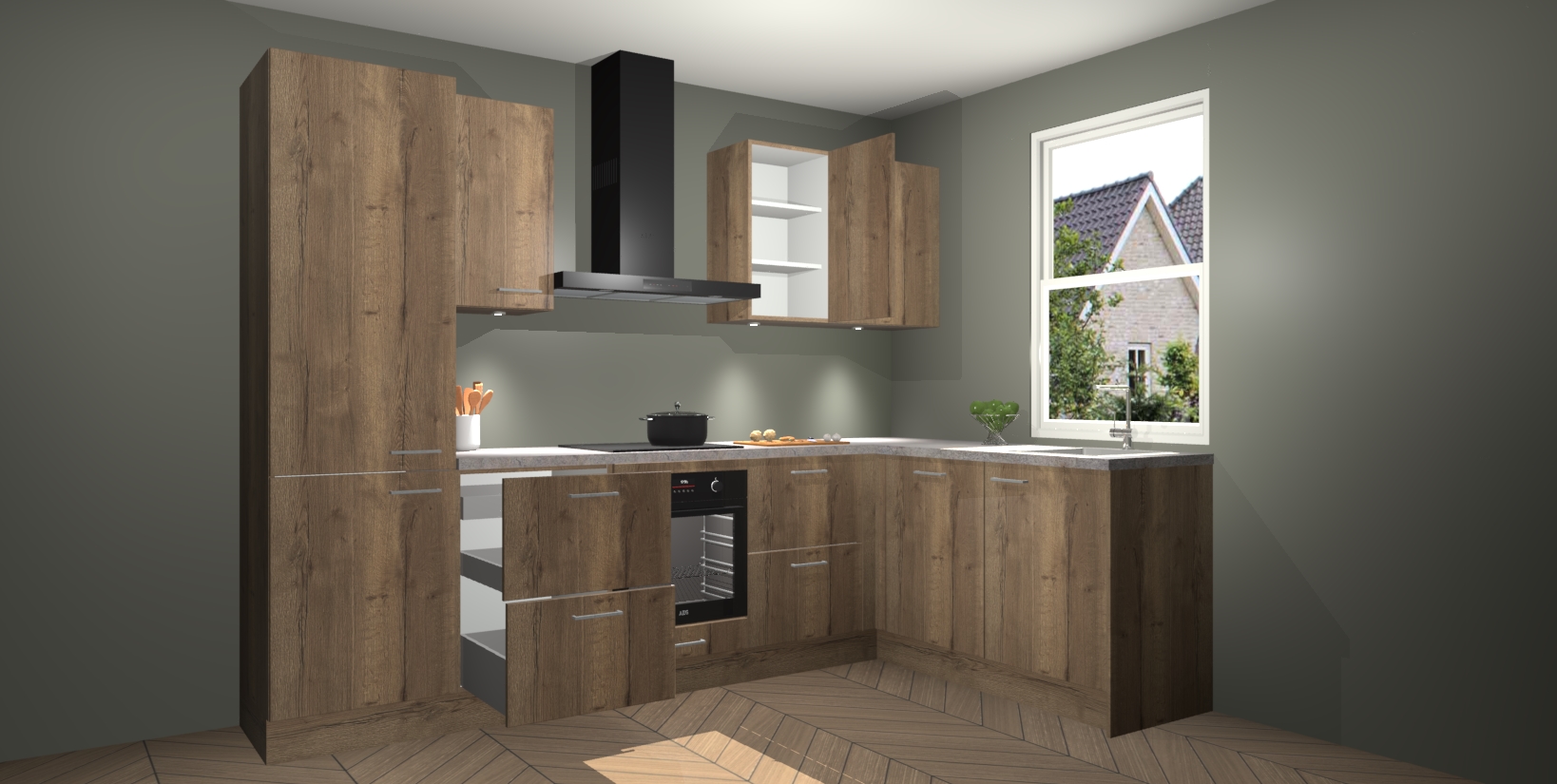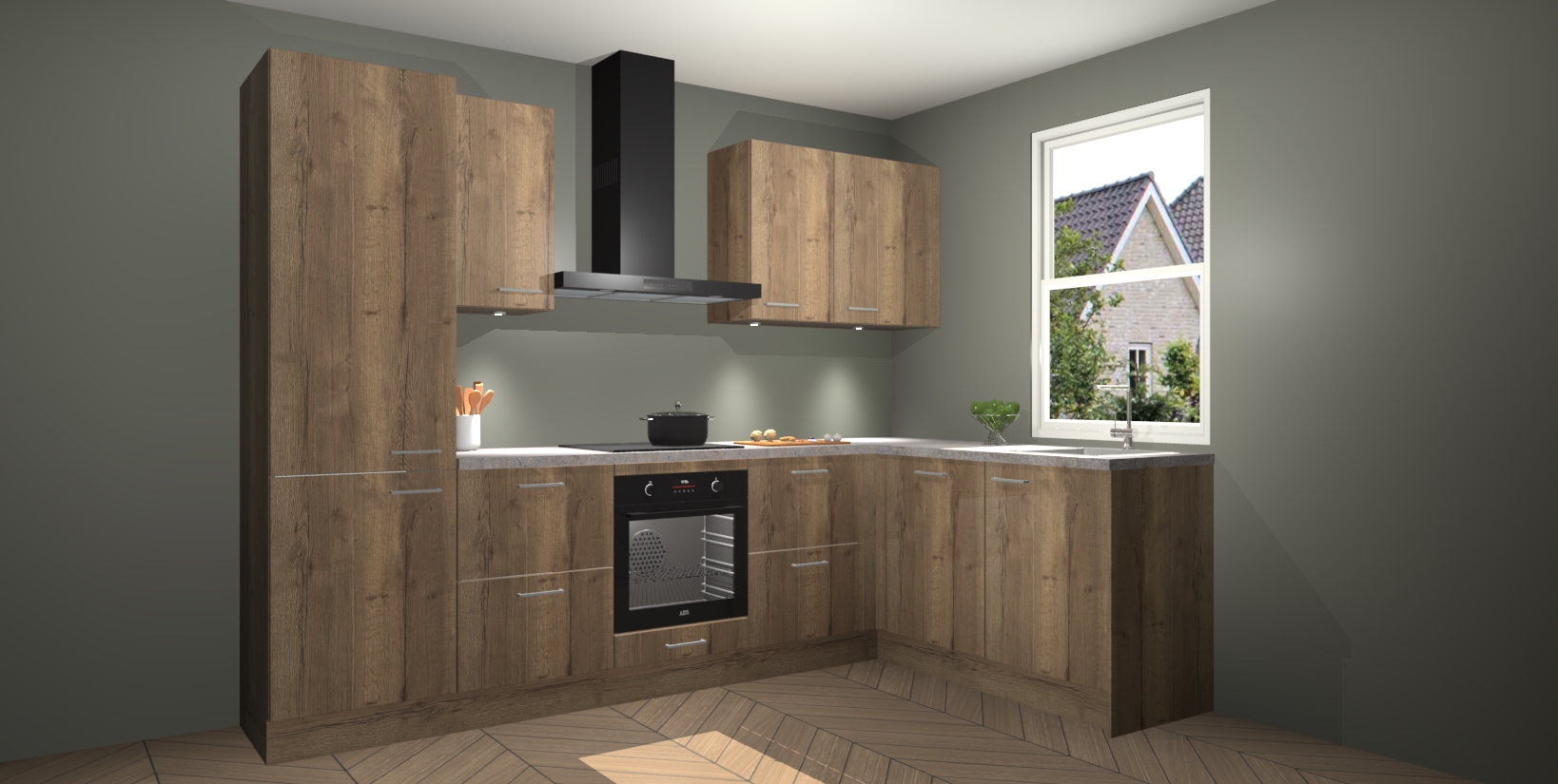 Maak kennis met de trendsettende en luxe Chocolade Eiken keuken Bazel! Deze uitzonderlijke keuken van Duitse kwaliteit is stijlvol, modern en perfect om elk huis mee op te fleuren. De binnenkant van de kasten worden meegenomen in een bijpassende kleur om een samenhangende eigentijdse esthetiek te voltooien. U zult dol zijn op hoe uw pas gerenoveerde keuken eruitziet met de Chocolade Eiken editie!